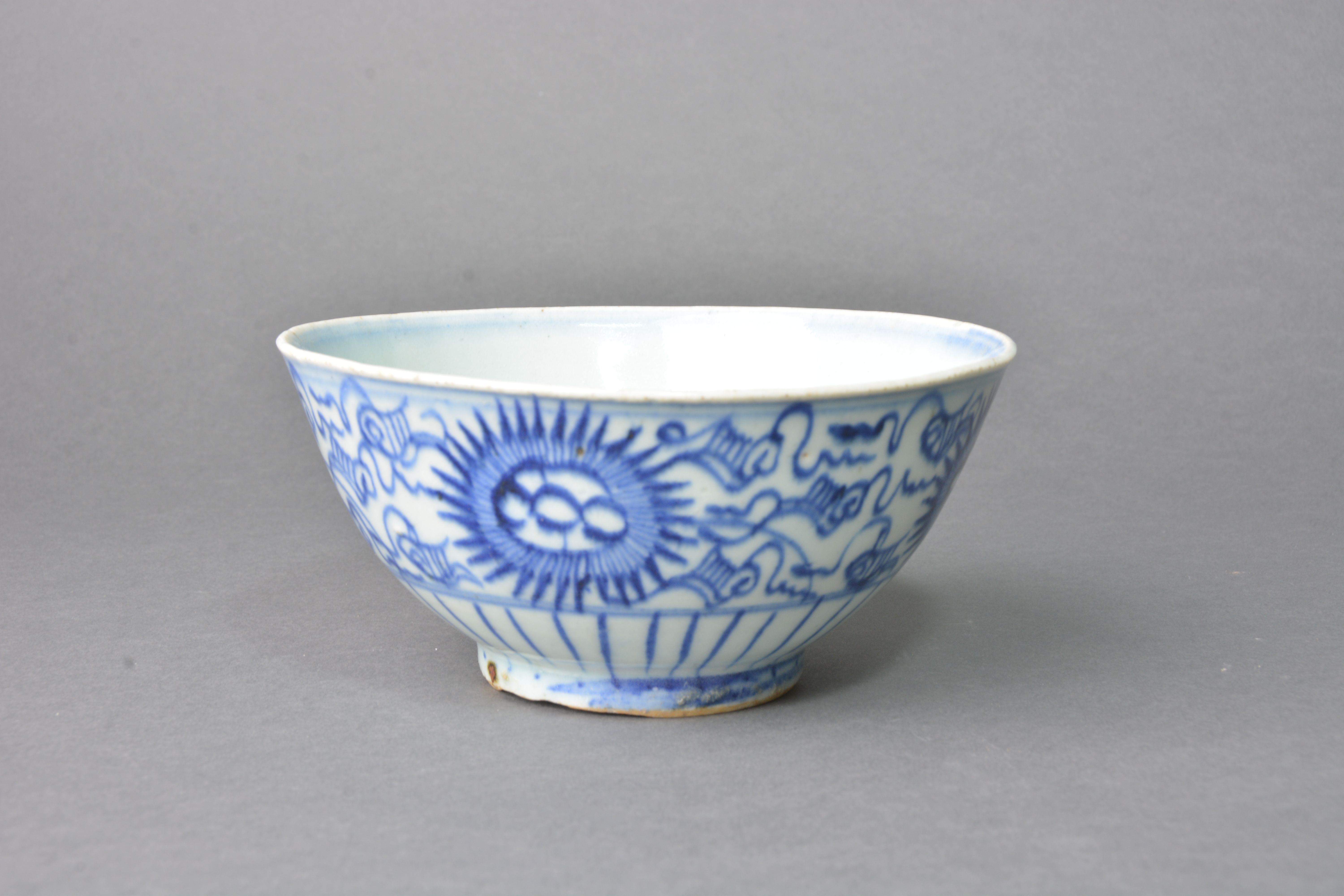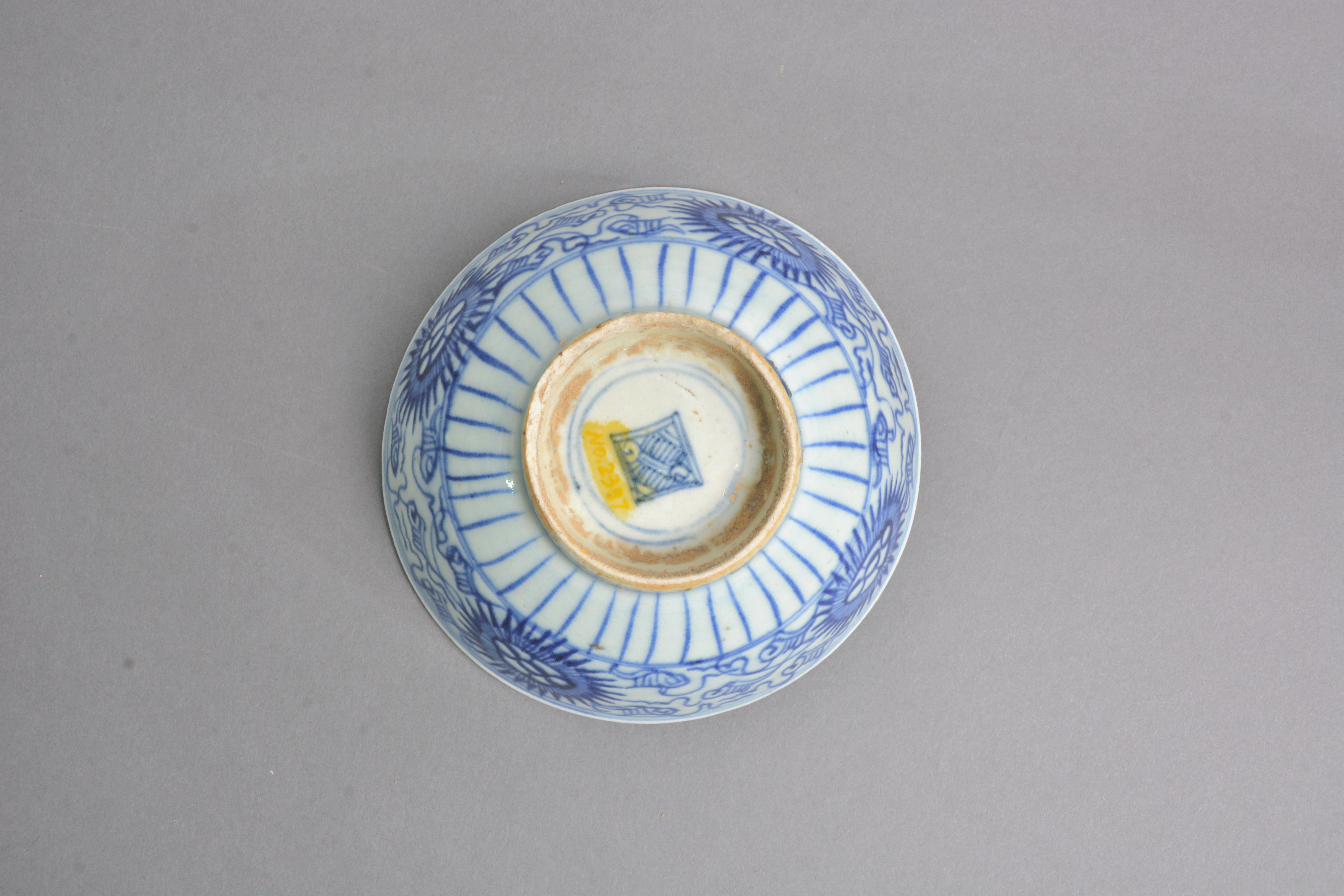 白釉青花。侈口,弧腹,圈足。内外均施白釉,釉色泛青。内壁饰两周垂弦纹,底心花样款似凤状;外壁两周垂弦纹间绘花卉盘长纹,其下为短竖线纹;外壁垂弦纹内作豆腐干状花样款,内底阴刻“刘”字。