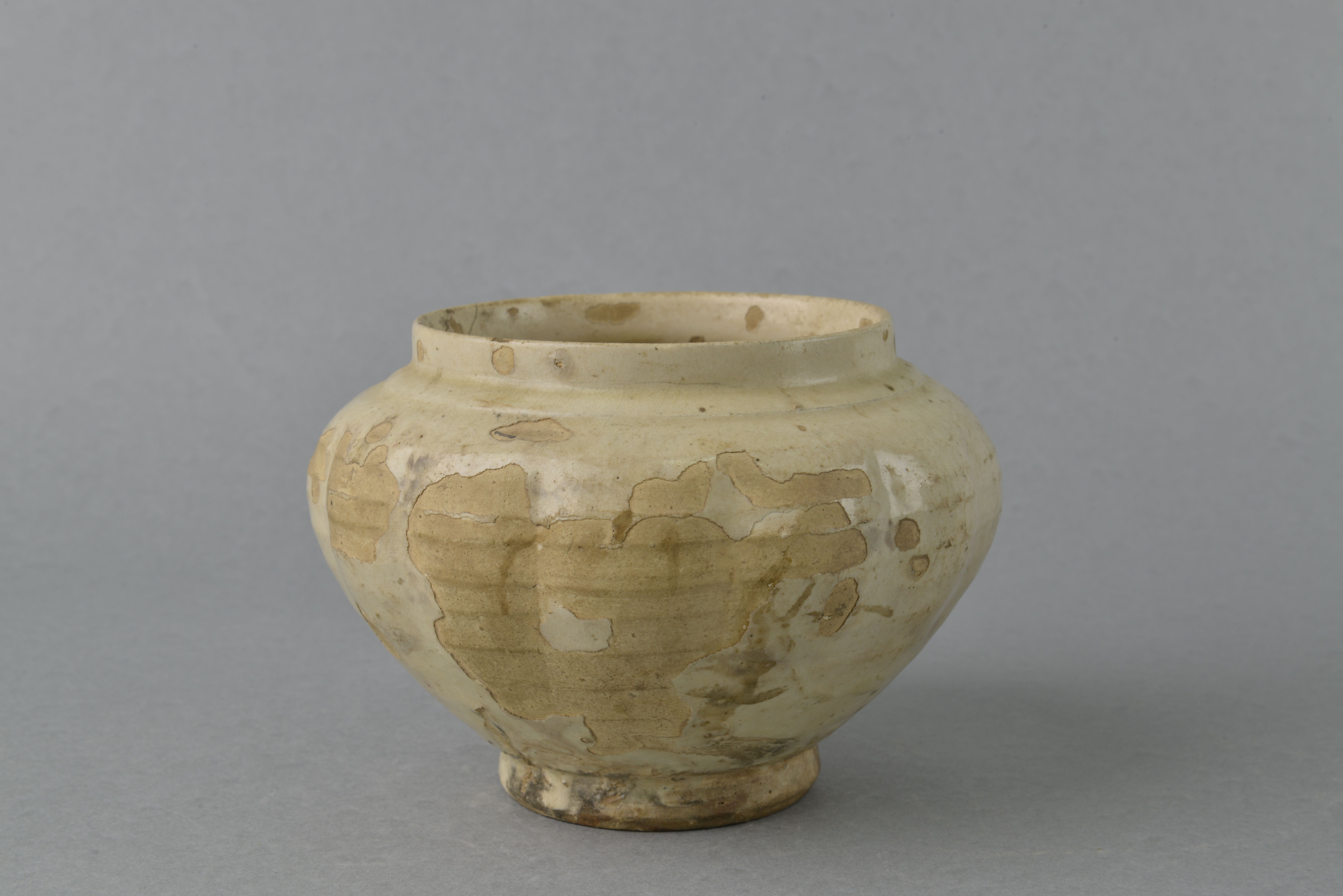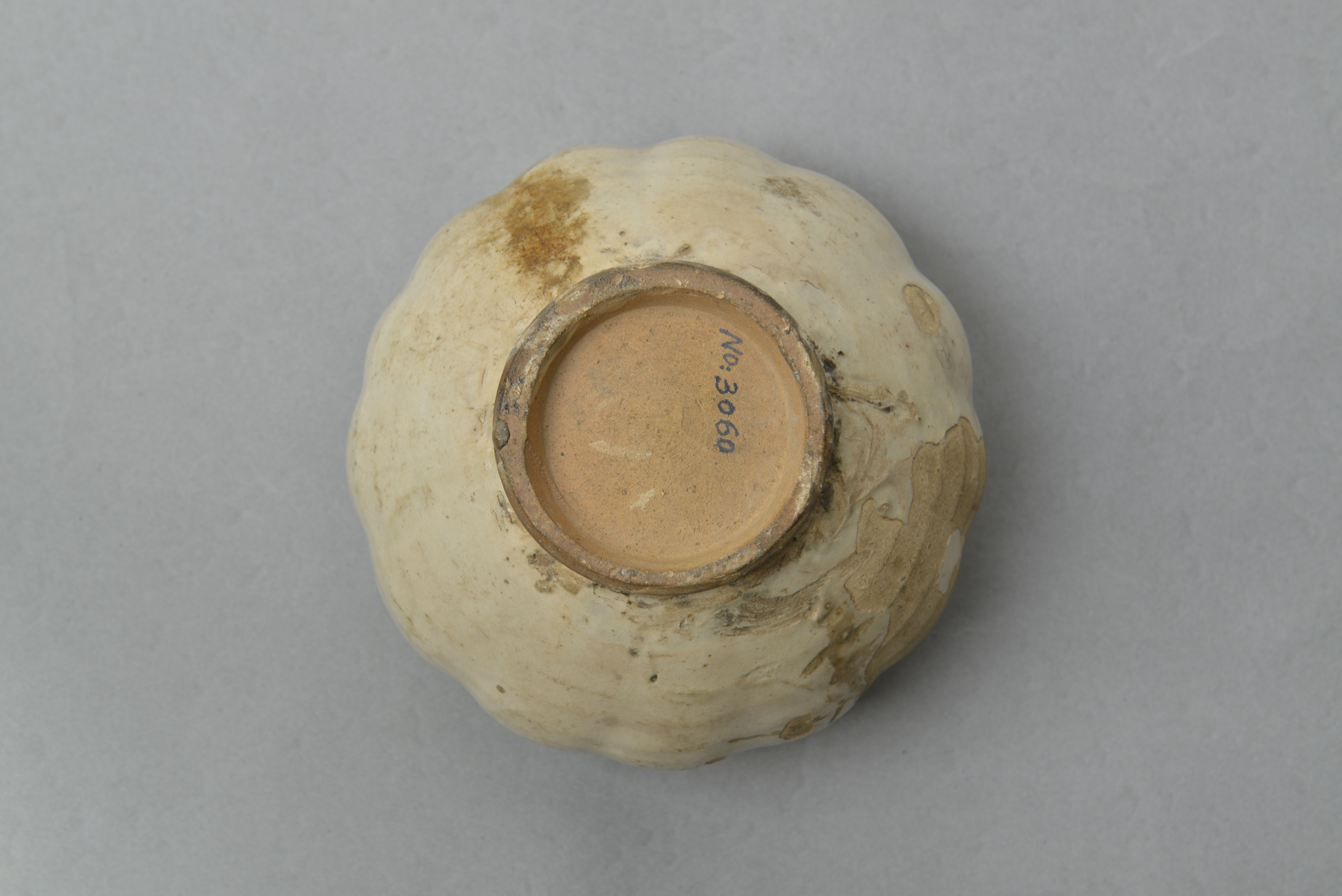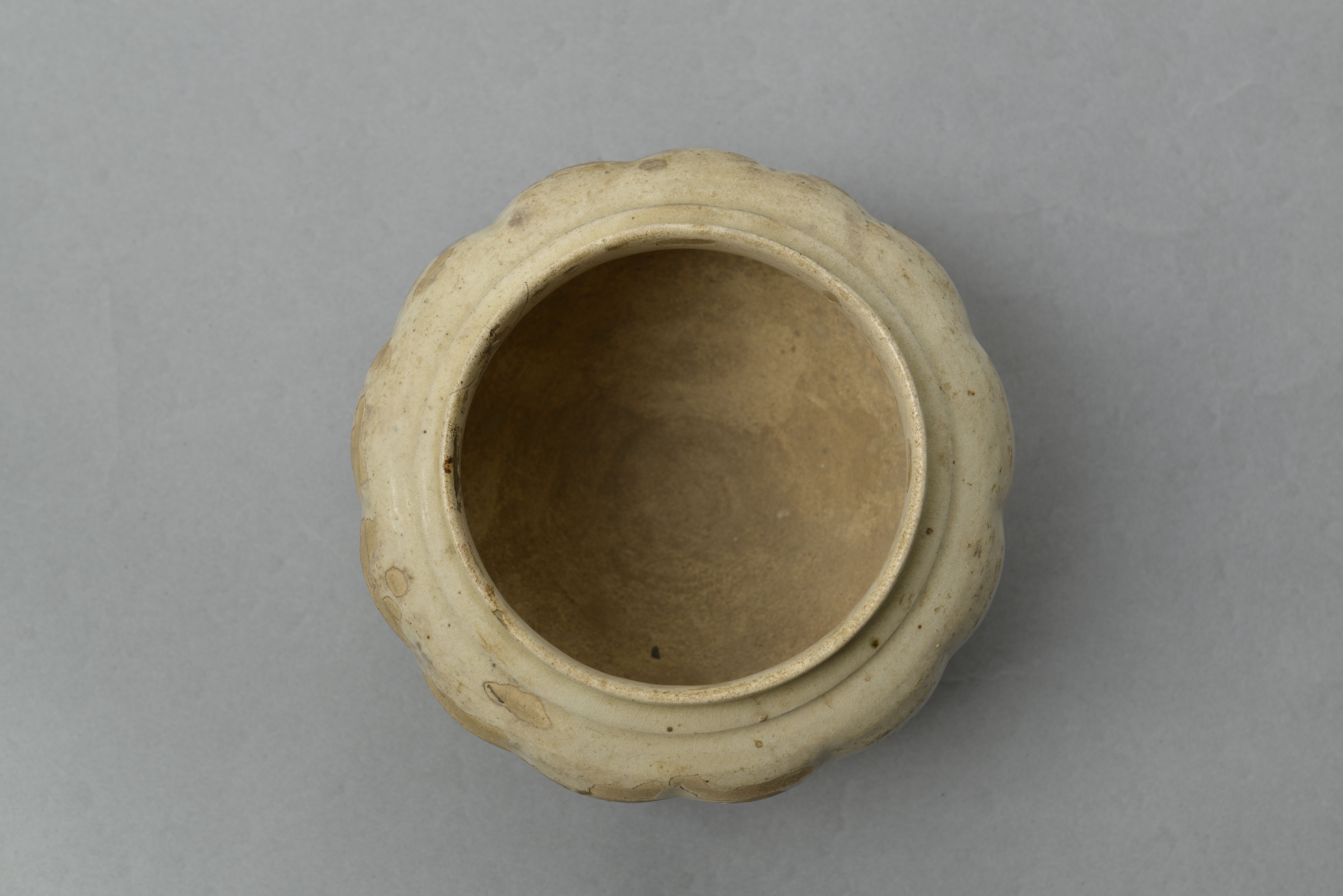 内容:直口,瓜棱形鼓腹下斜收,圈足,施牙白釉,足底露胎。高7.0cm口径16.9cm 。