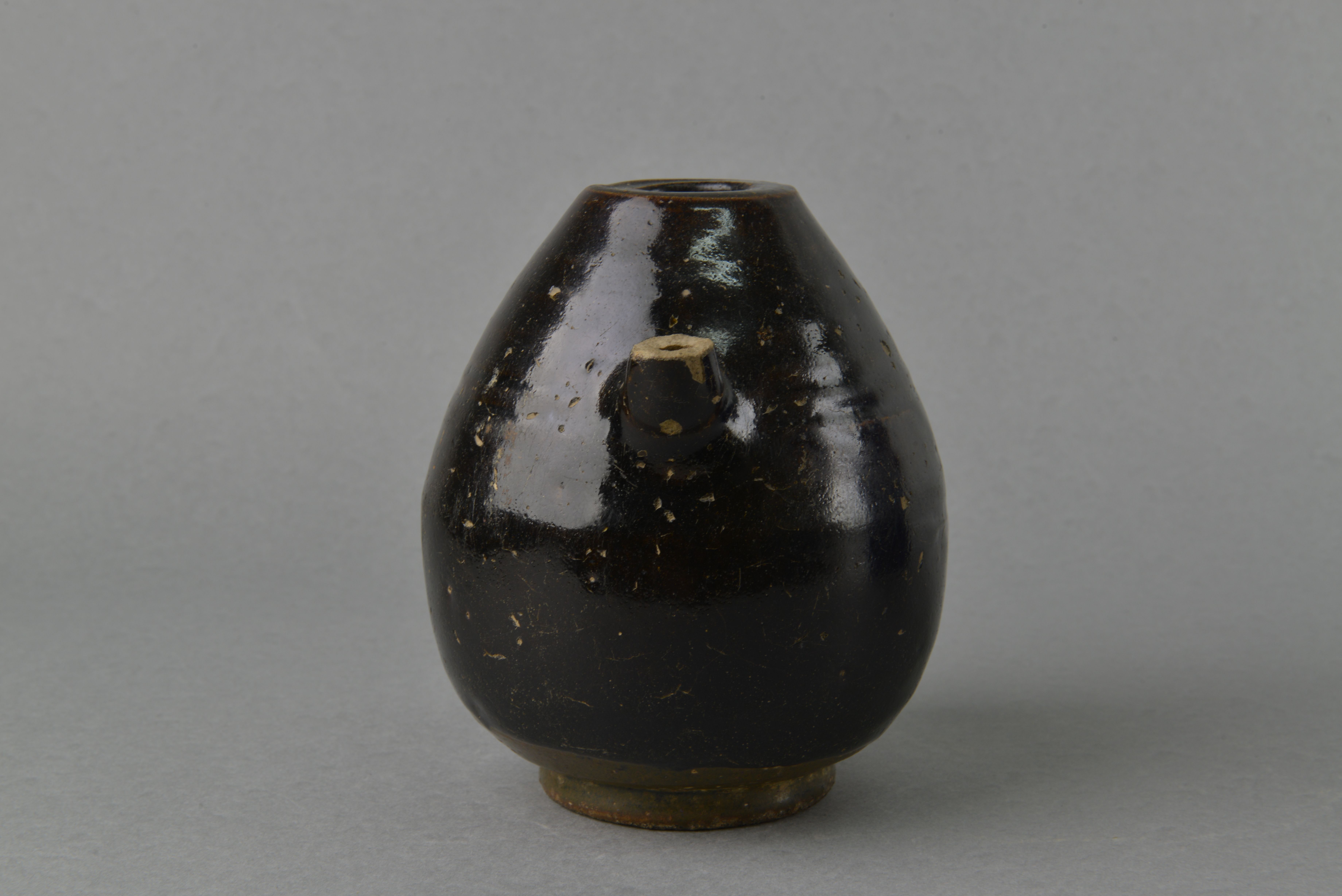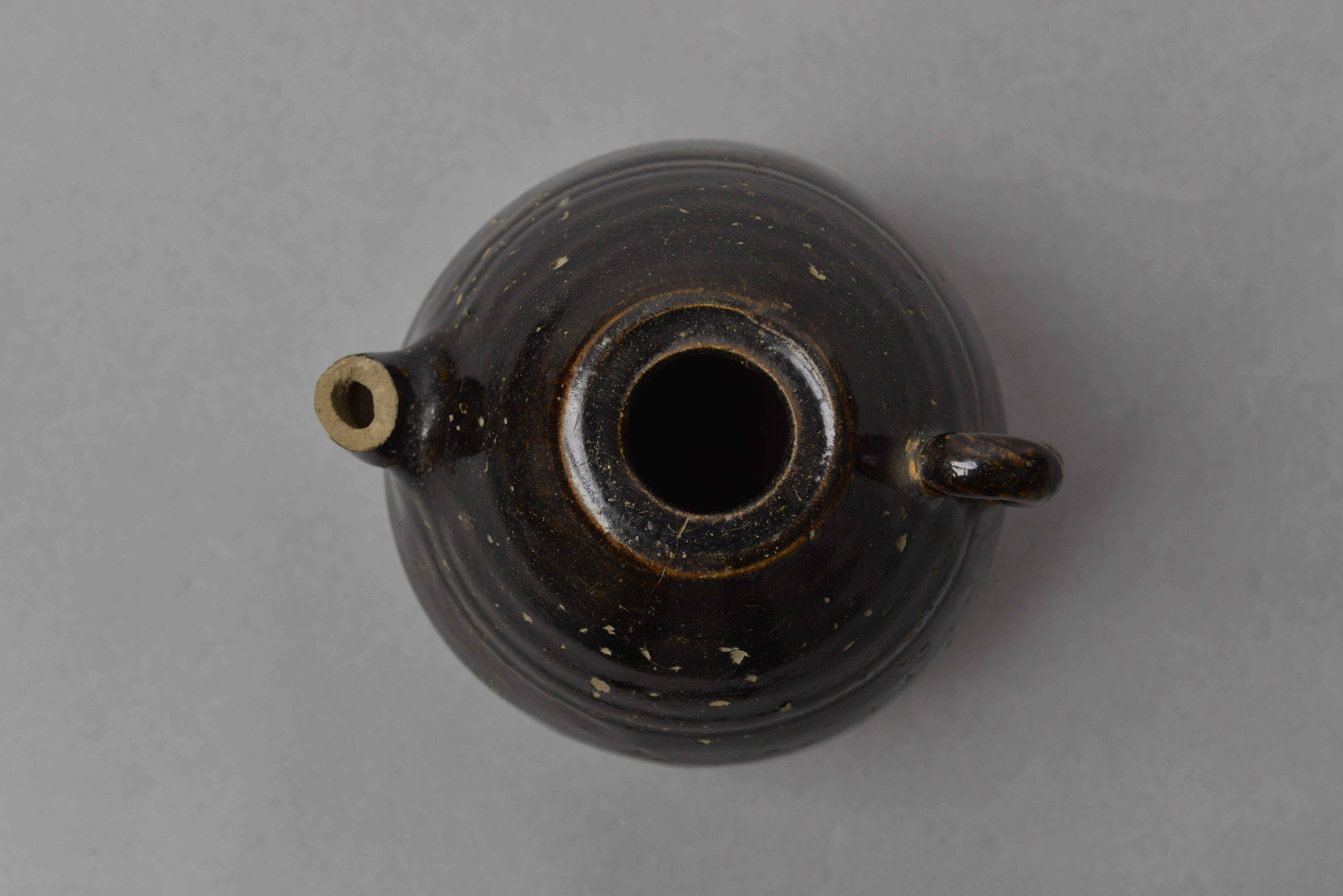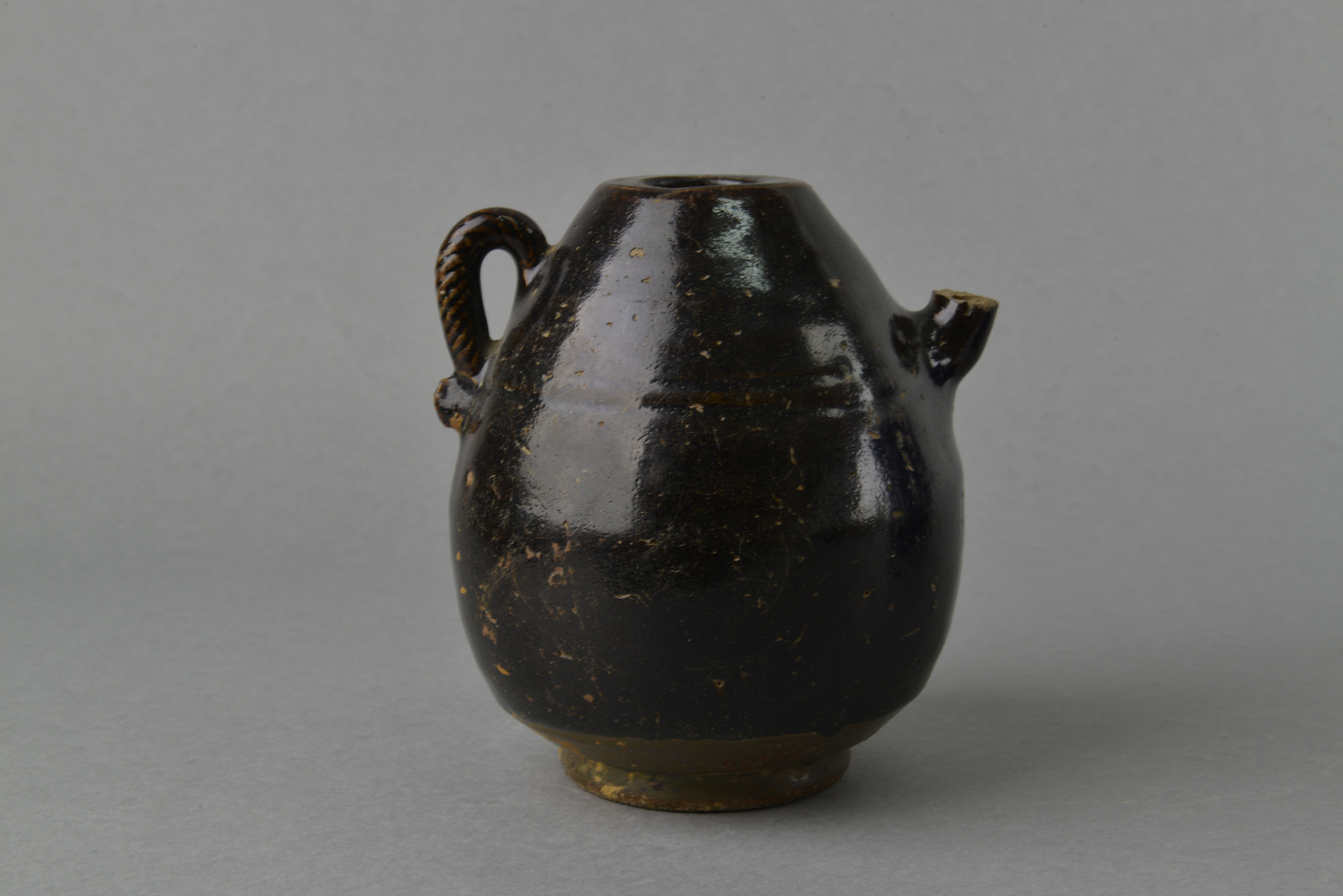 小口,宽平沿,垂腹,圈足。腹上部一流,已残,与流相对的一侧有曲形柄,柄上饰绳纹。器外施黑釉,近圈足处及圈足内釉窑变,呈褐色,足根刮釉。
