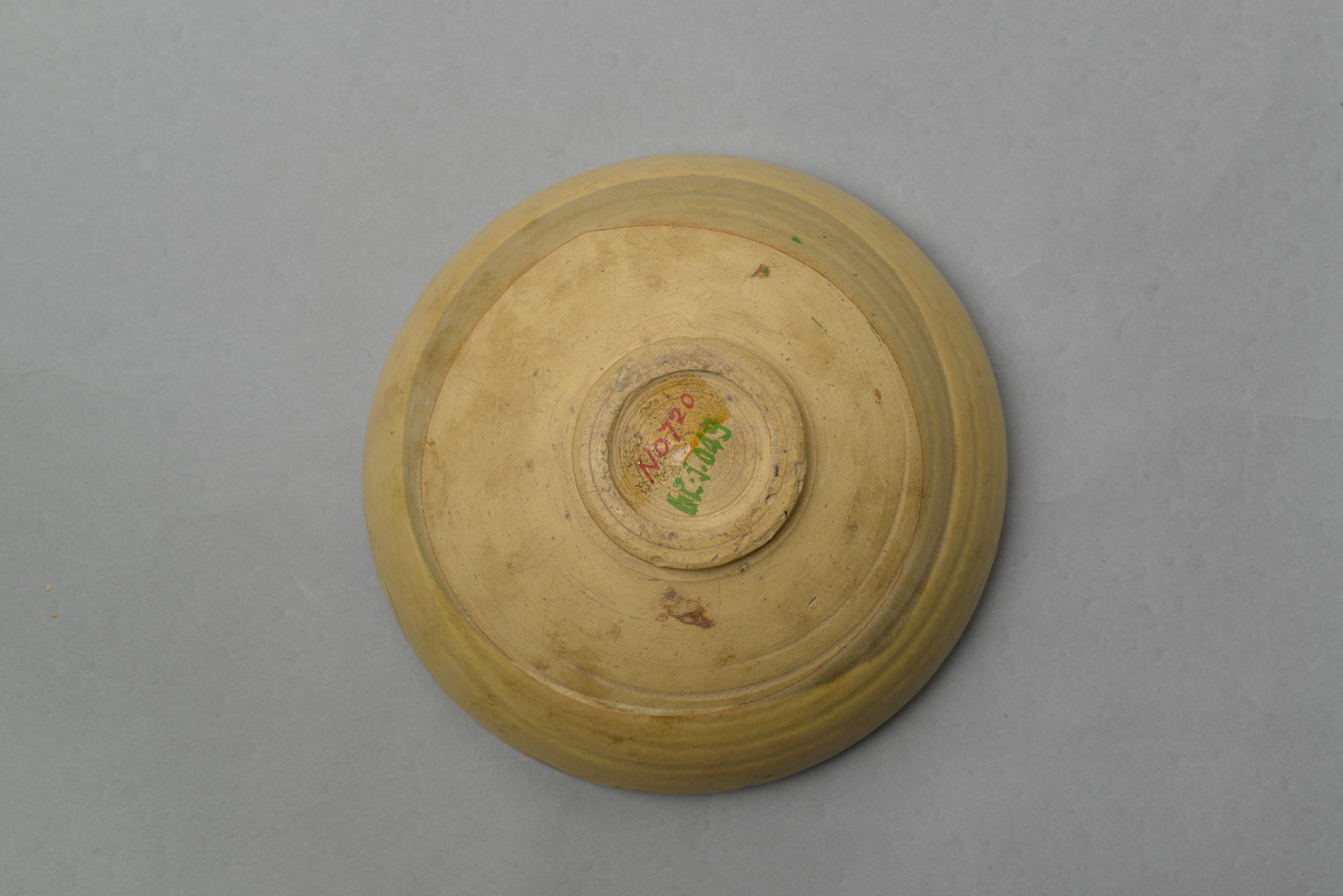 口微敛,弧腹,矮圈足。器内施姜黄釉,剔刻牡丹纹。外釉不及底,口沿外部剔刻草叶纹。