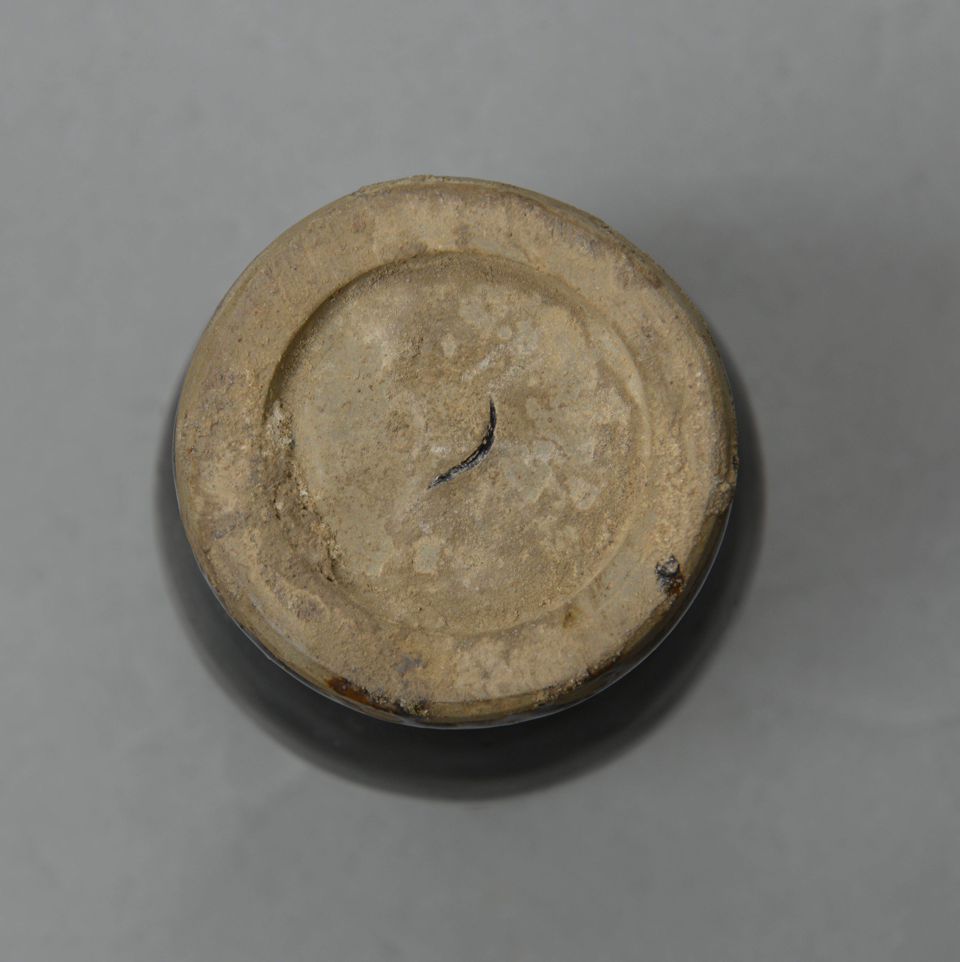 花口束颈,平肩,弧腹,上部微鼓,下部内收,喇叭口形圈足,器外满施黑釉,圈足露胎。器内口部、颈部饰黑釉,局部釉窑变为褐釉。