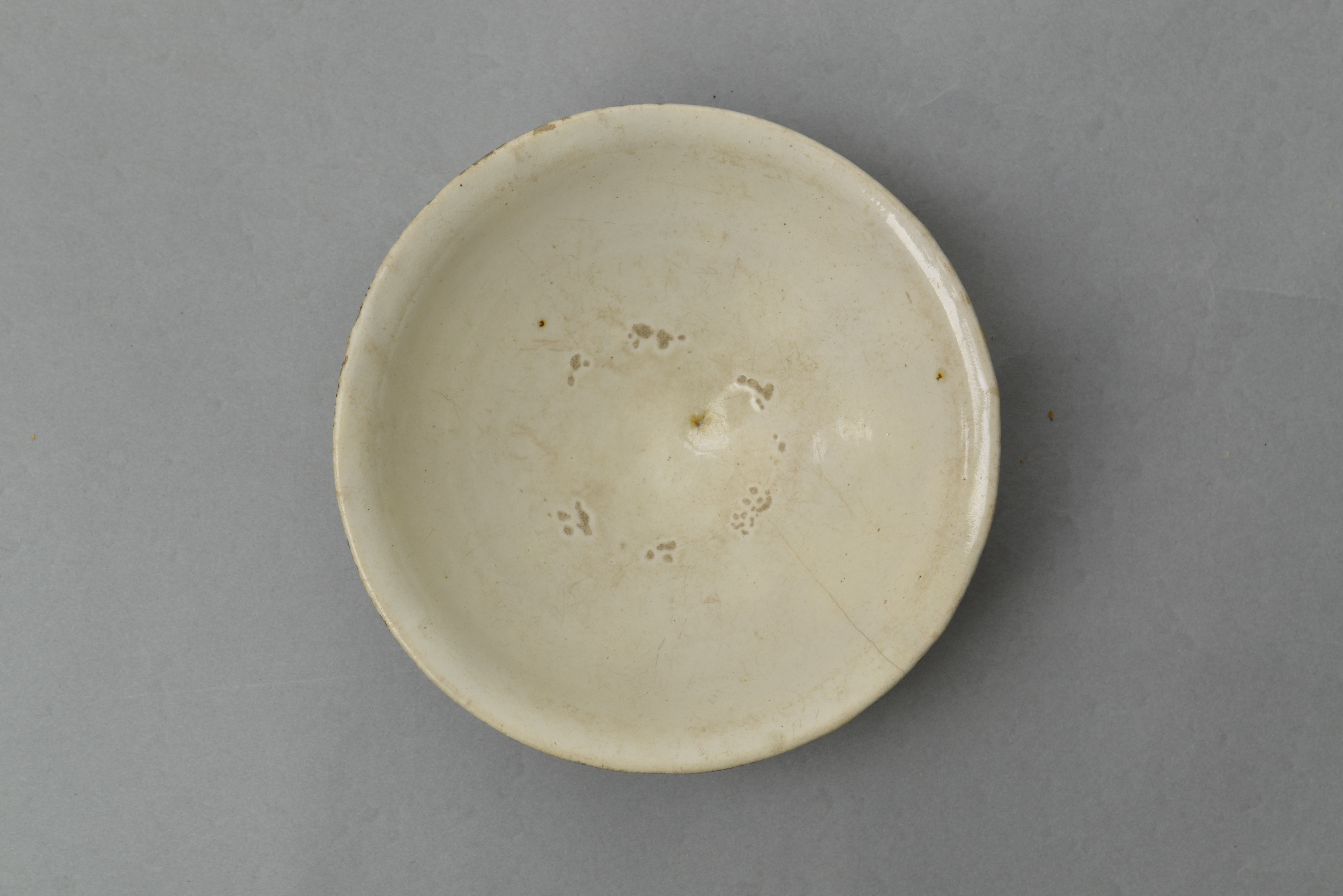 敞口,斜腹,圈足。器内外皆施白釉,内壁底心有垫烧的支点,圈足内及足根施褐色化妆土。