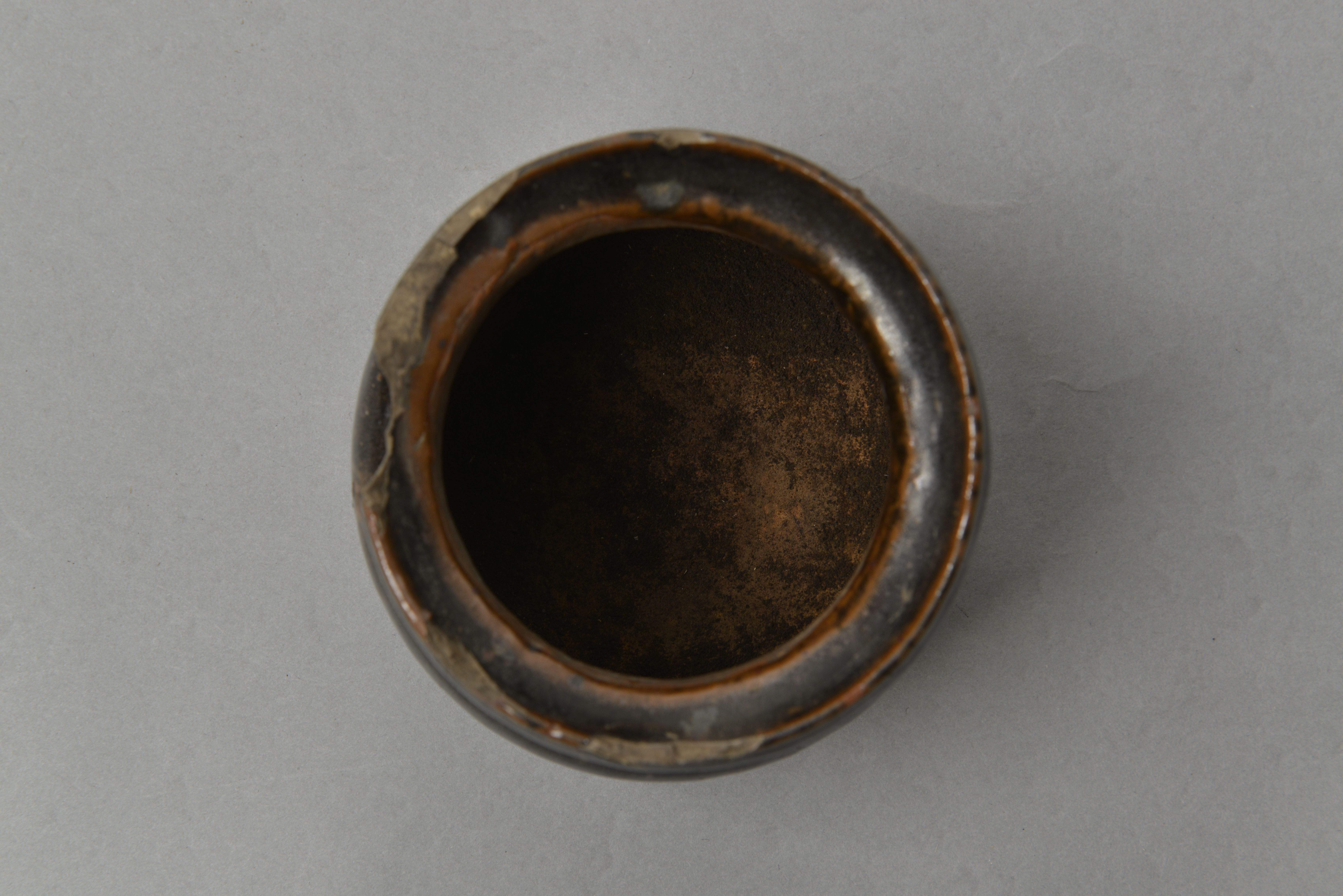 盘口,短颈,鼓腹,圜底,三兽足。器外施黑釉,底部及足部露胎。器内口部施釉。