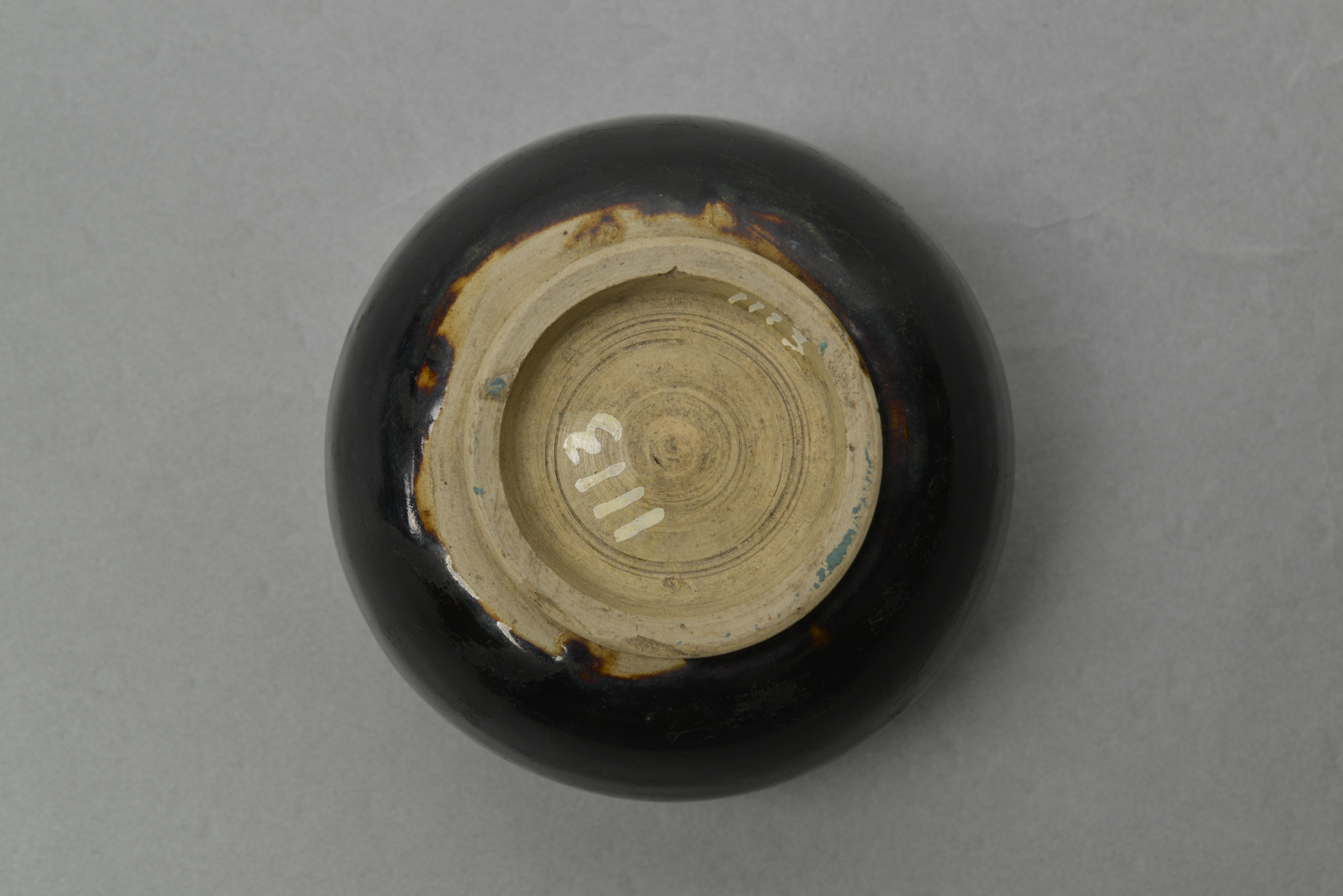 敞口,扁鼓腹,圈足。器内外施黑釉,圈足露胎。