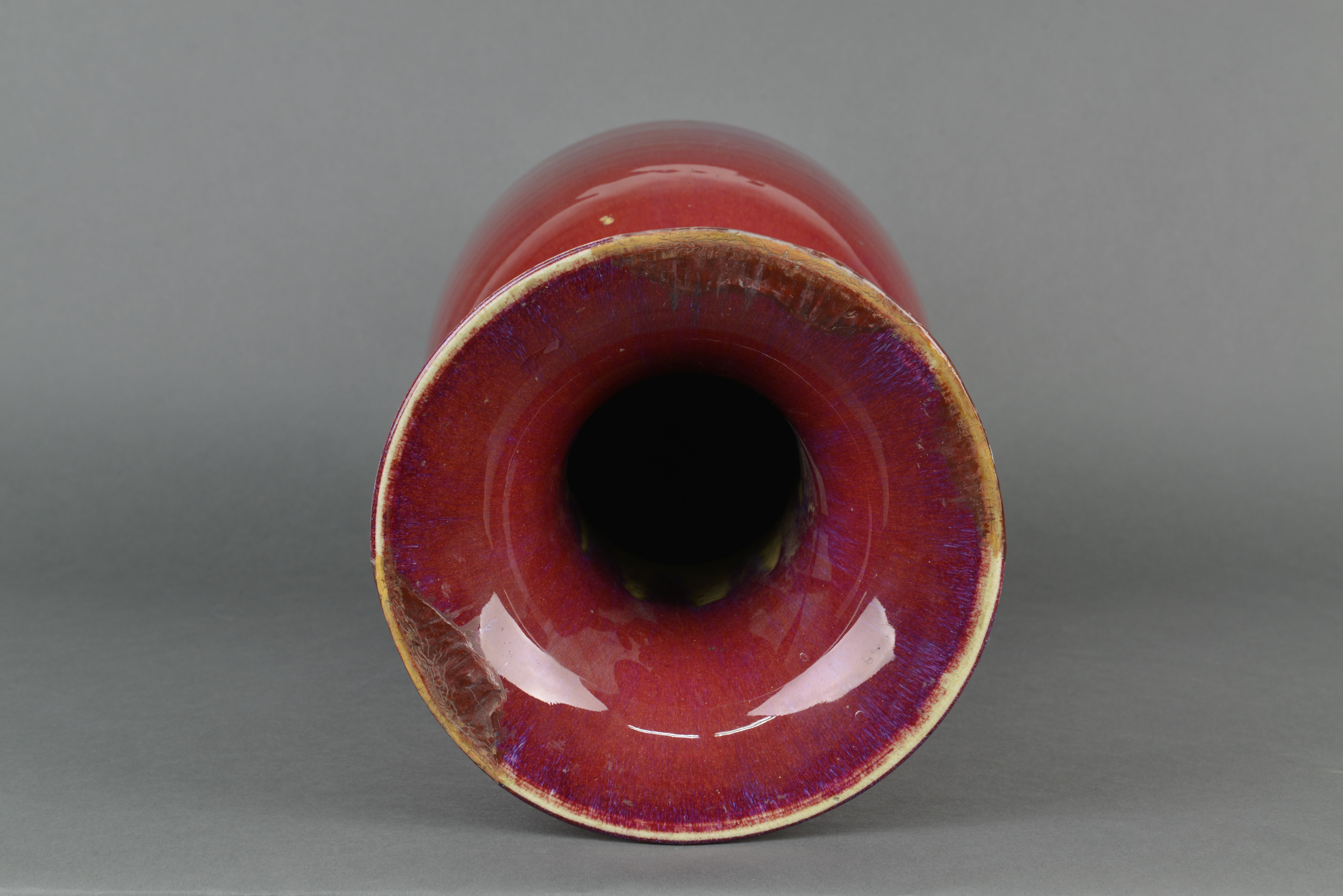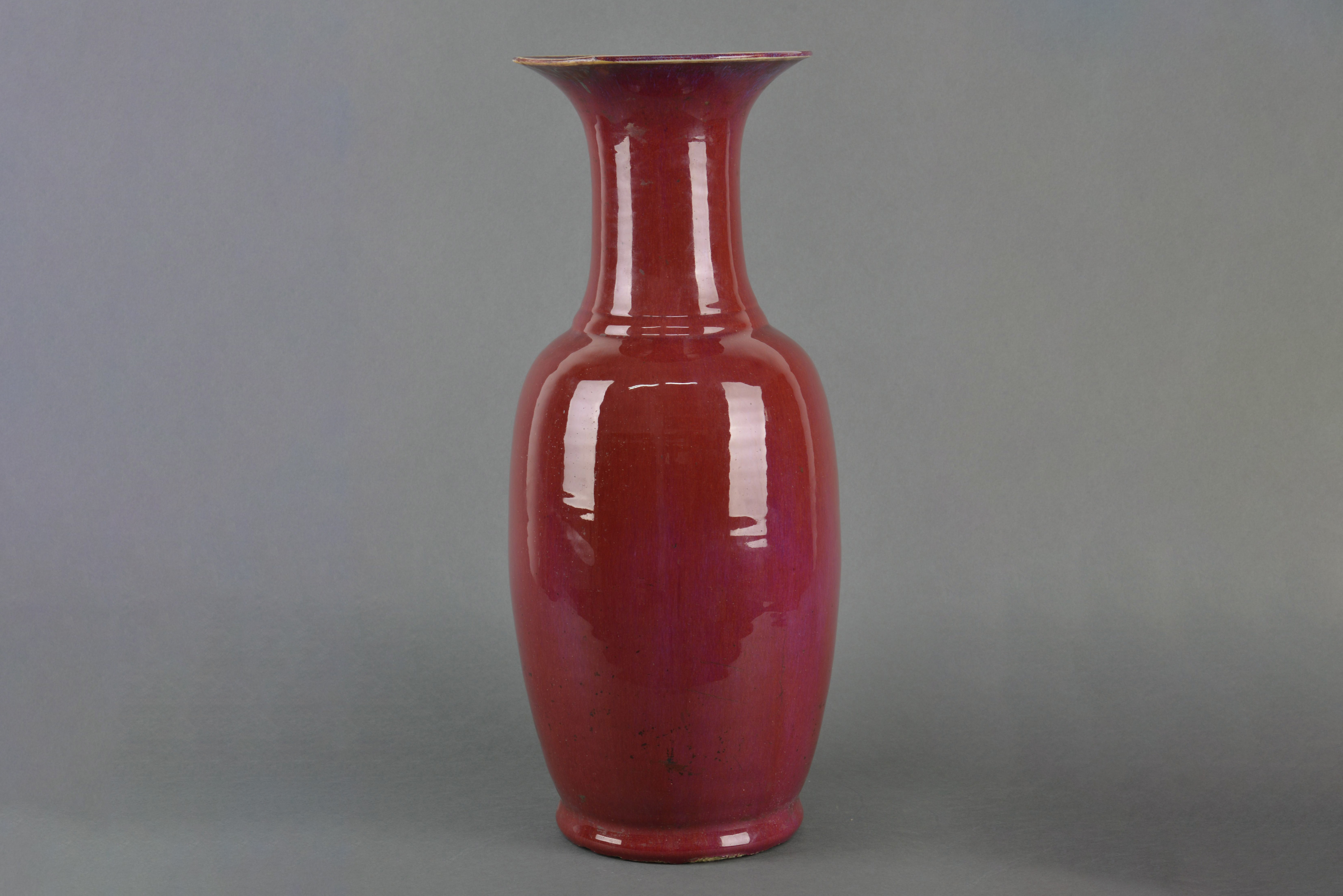 撇口,长颈,深弧腹,圈足。瓶内外均罩祭红釉,光亮可鉴,足底施白釉。