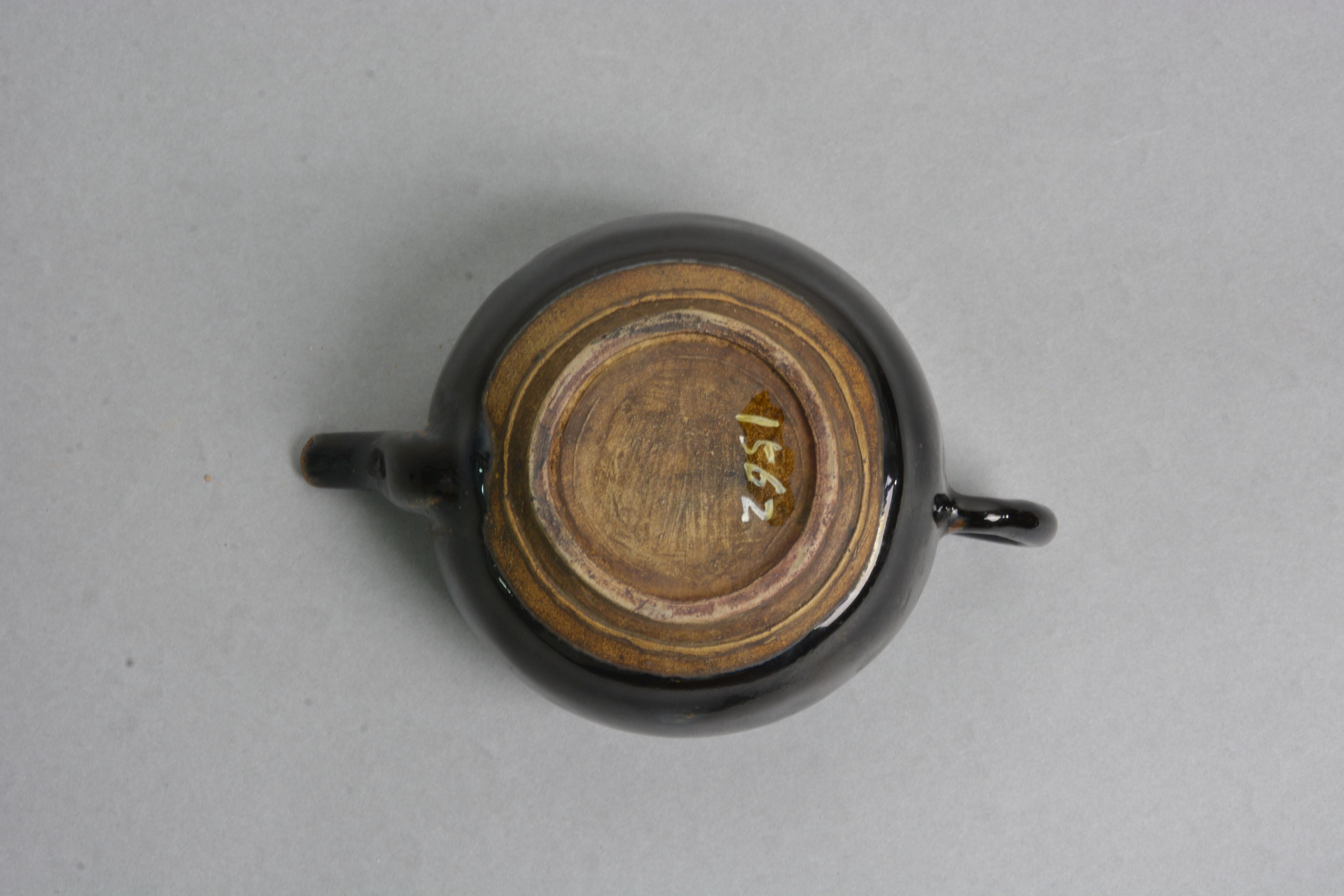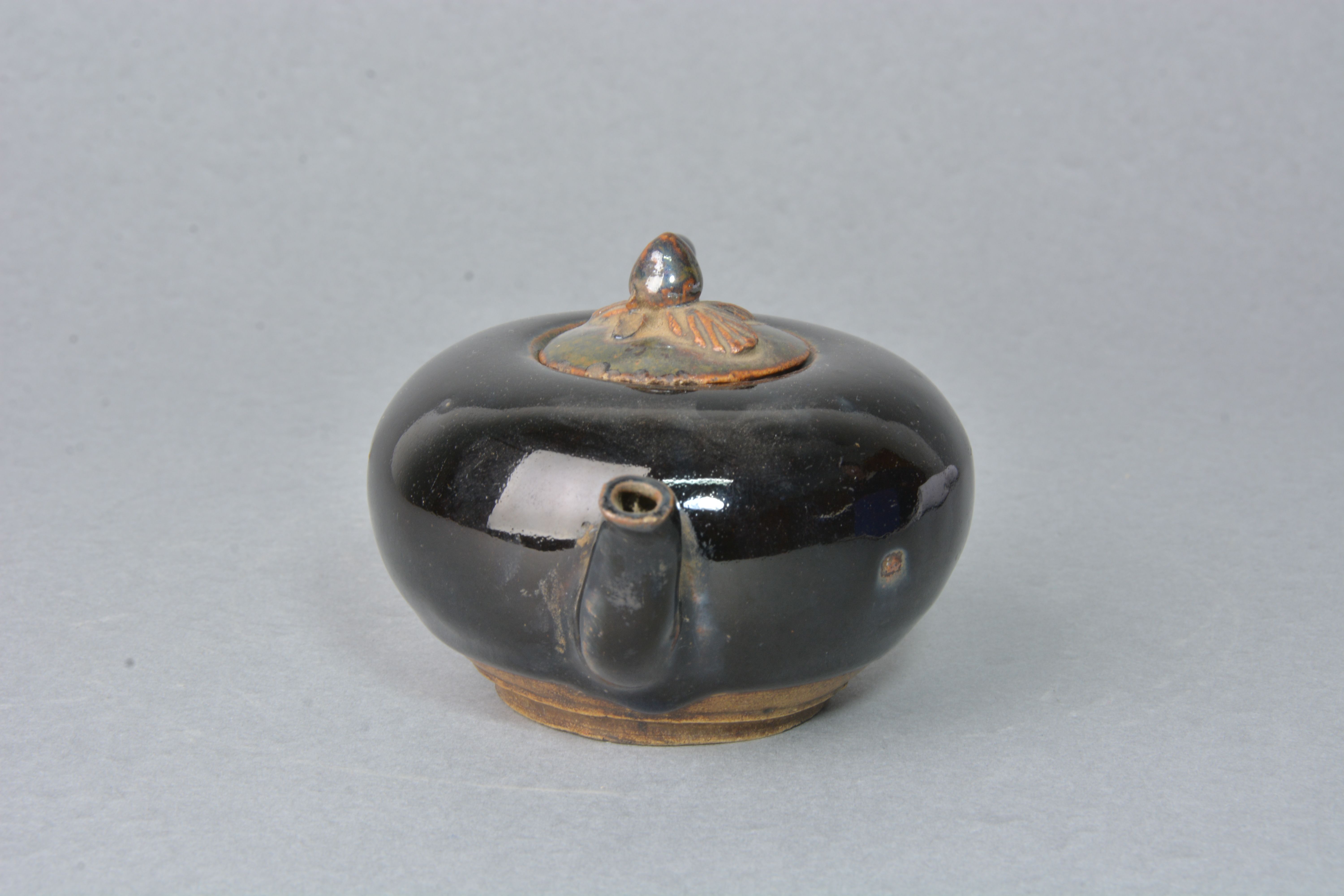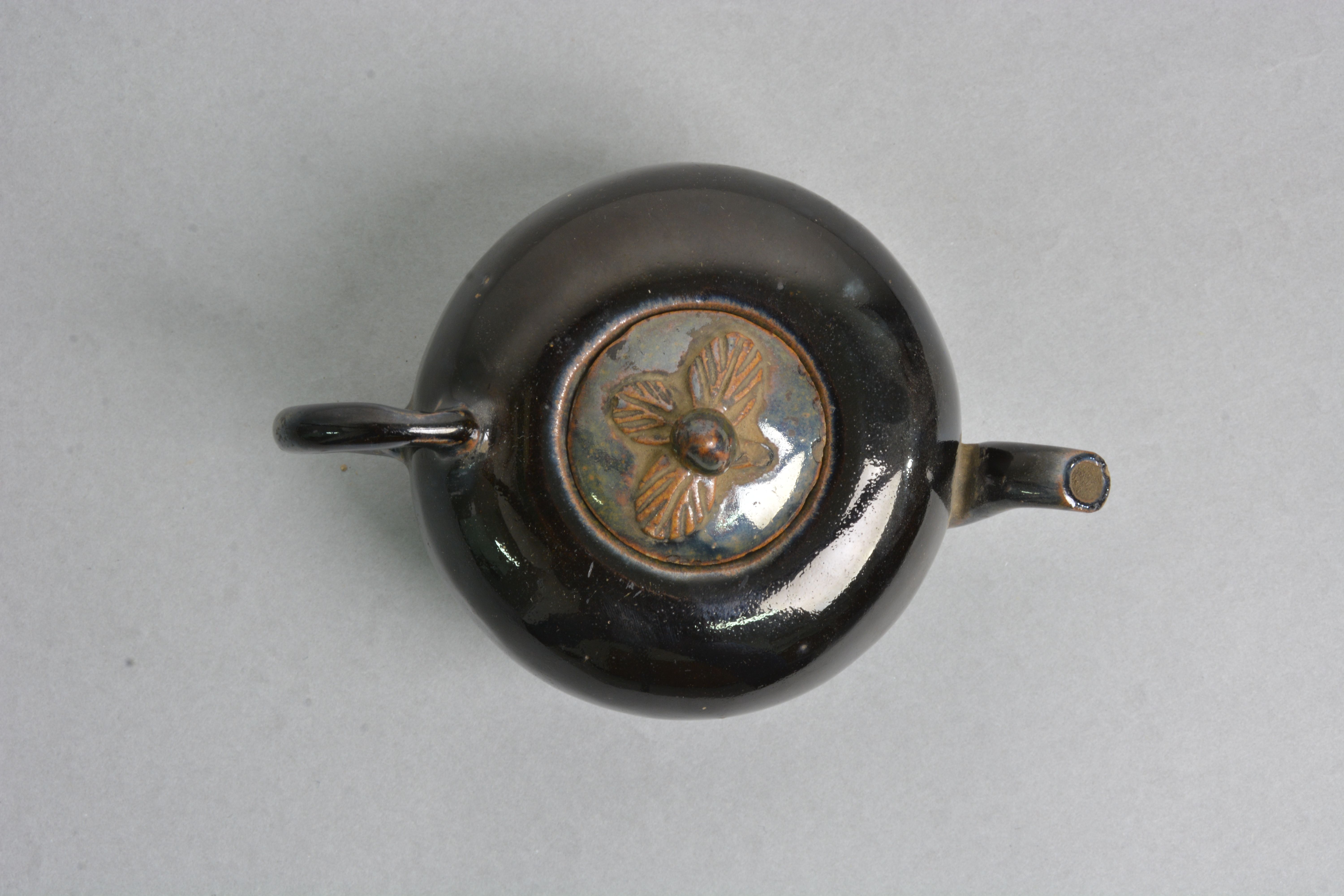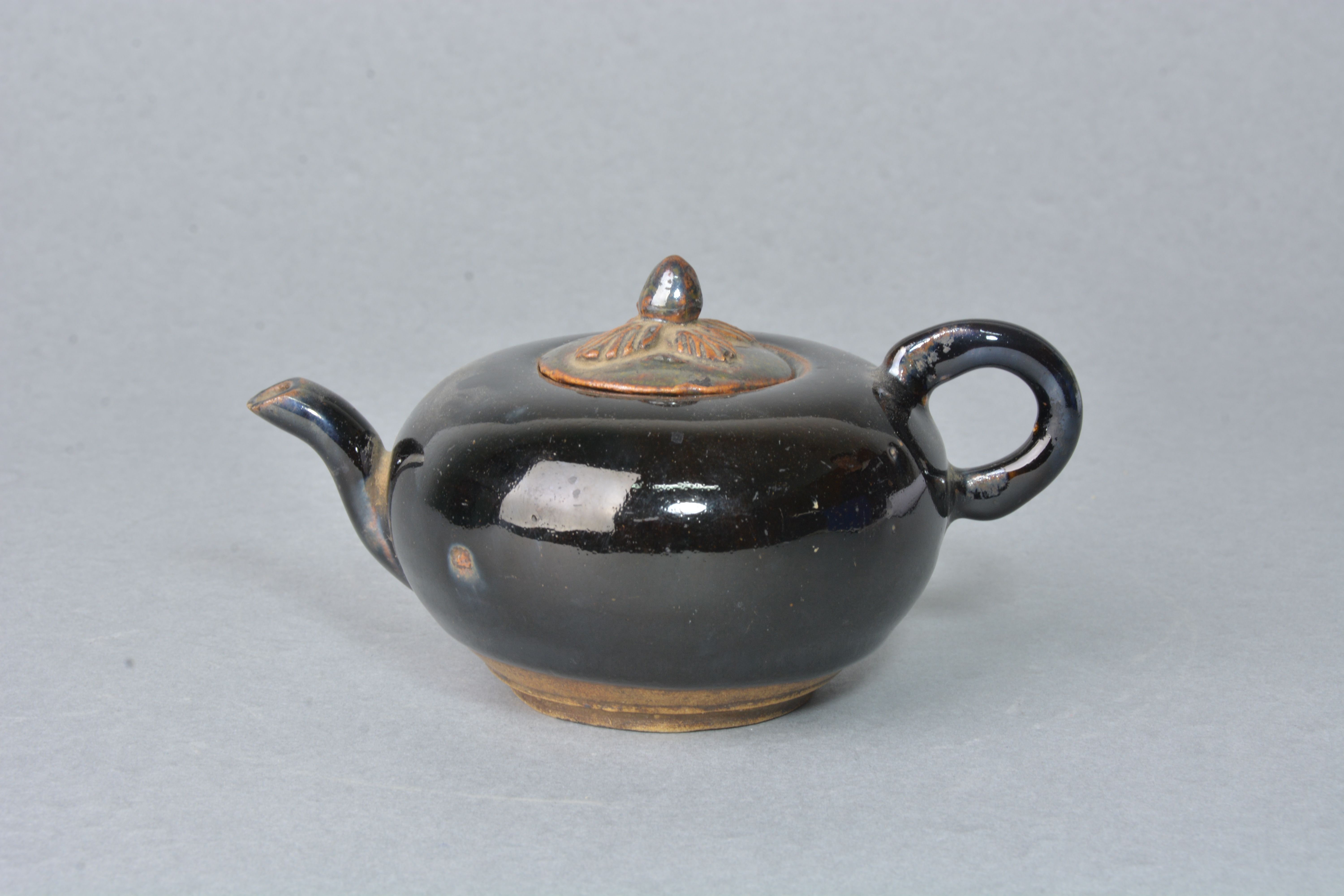 圆形盖,盖顶有宝珠钮,盖面堆塑叶纹。子母口,扁圆腹,短流微曲,环形柄,矮圈足。器内外皆施黑釉,外釉不及底,盖内露胎。近圈足处饰一周凸弦纹。