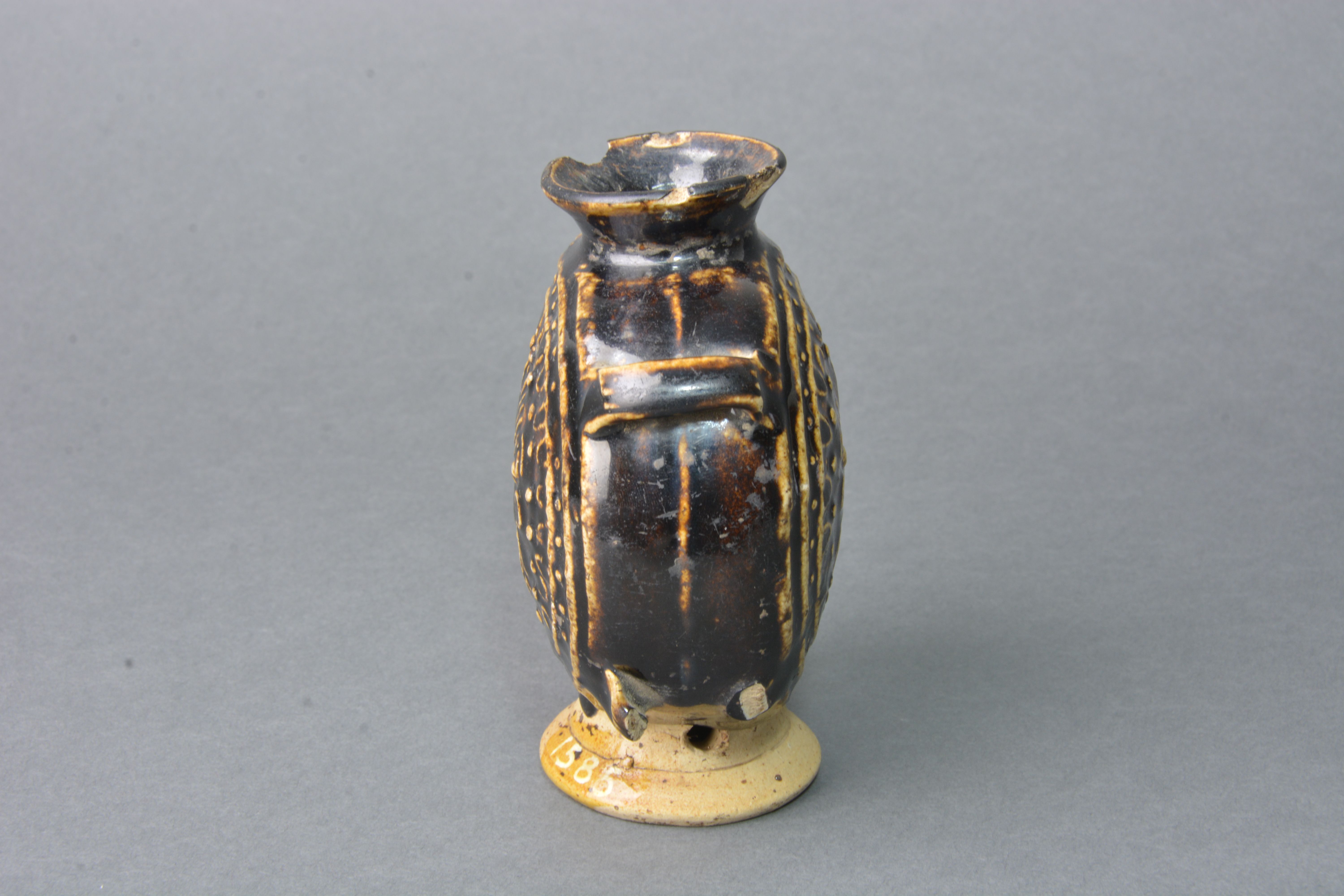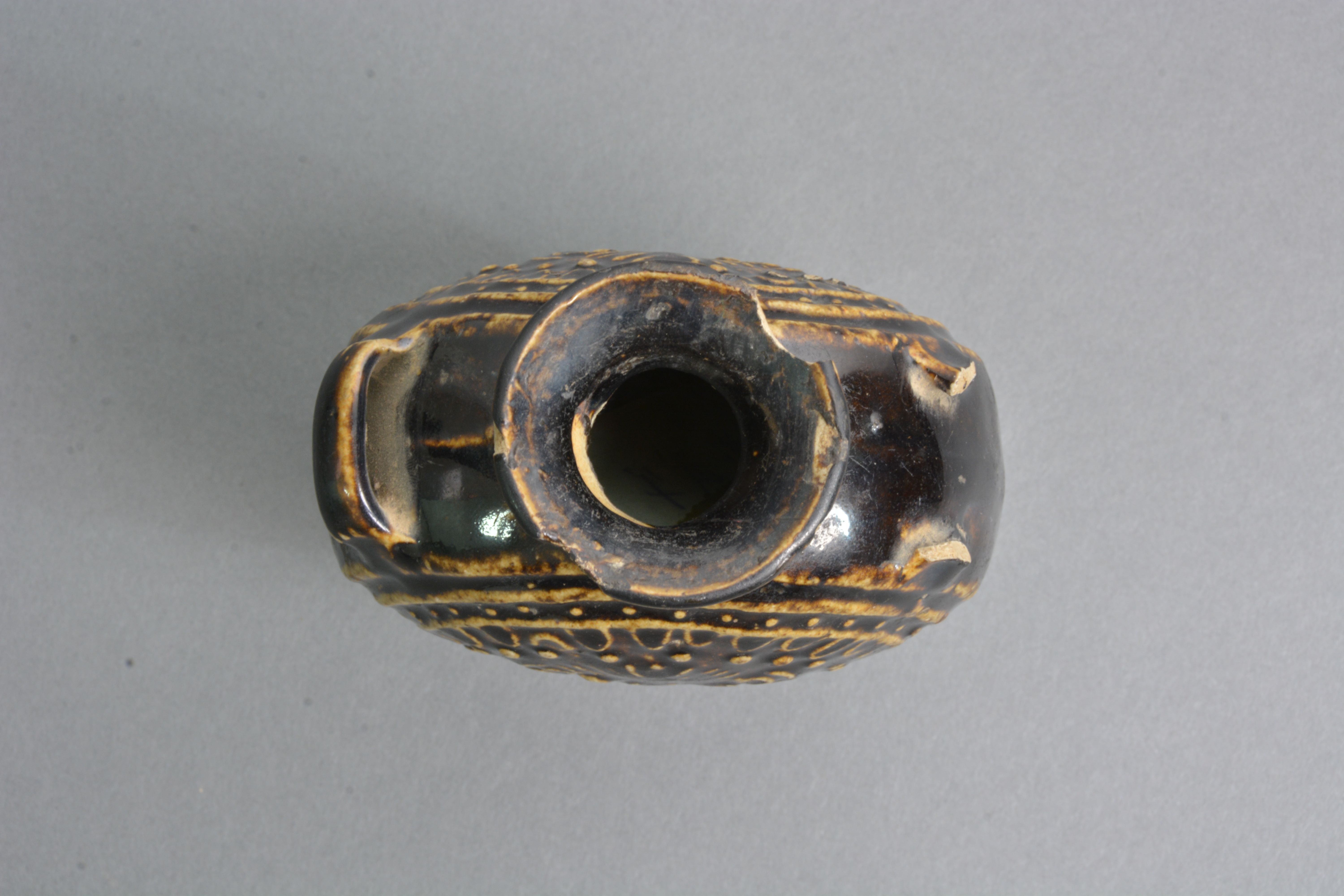 敞口,短颈,扁圆腹,外撇高圈足,腹两侧有对称双系。器表饰黑釉,腹部正、背两面中心均饰狮纹,外饰串珠纹,叶纹及两周凸弦纹,凸弦纹内又饰一周串珠纹。圈足漏胎,圈足两侧各有一圆穿。