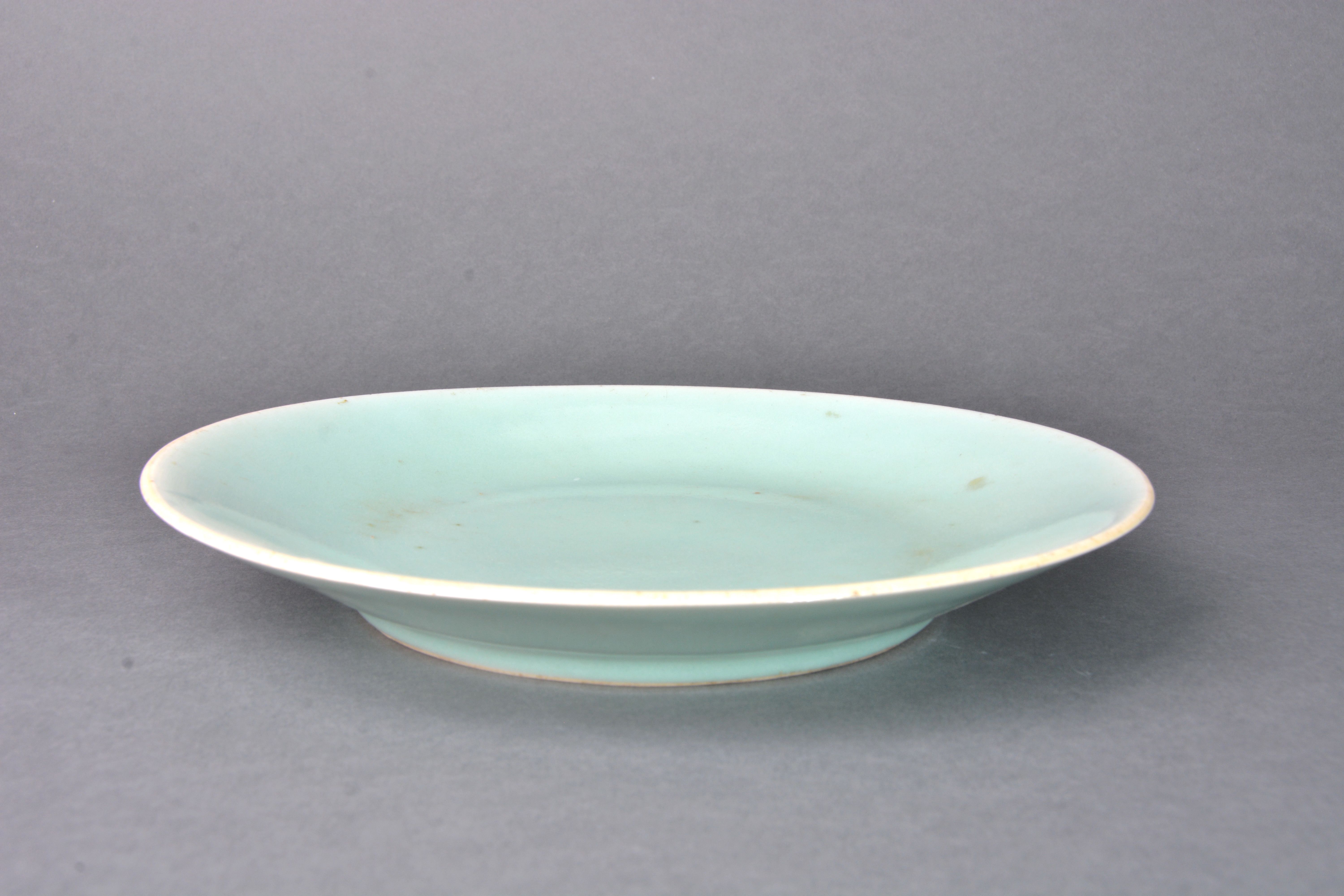 敞口,斜腹,圈足。通体施青绿釉,口沿及足圈刮釉,足底釉色泛白,圈足底心一方框内楷书“怡和”款。