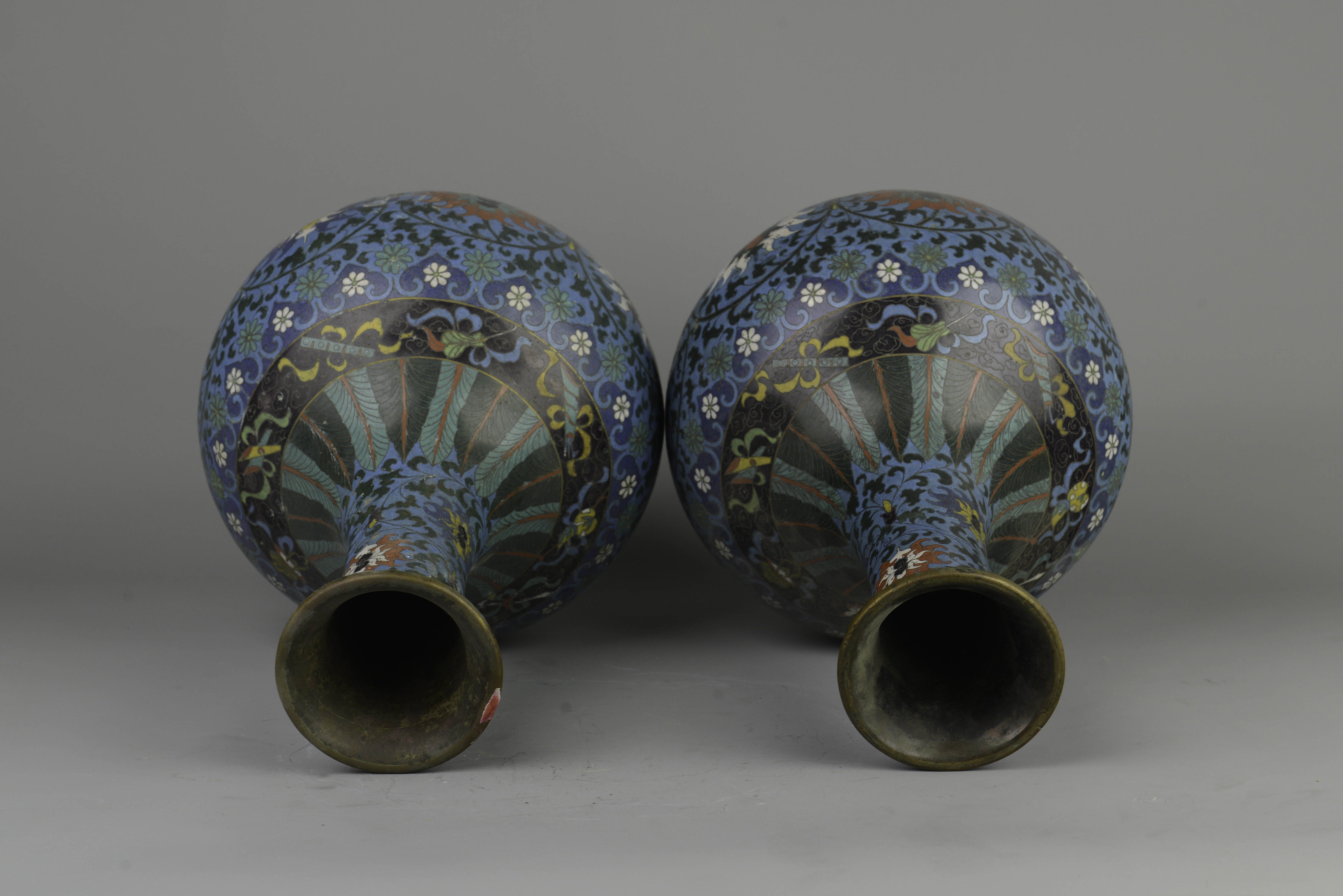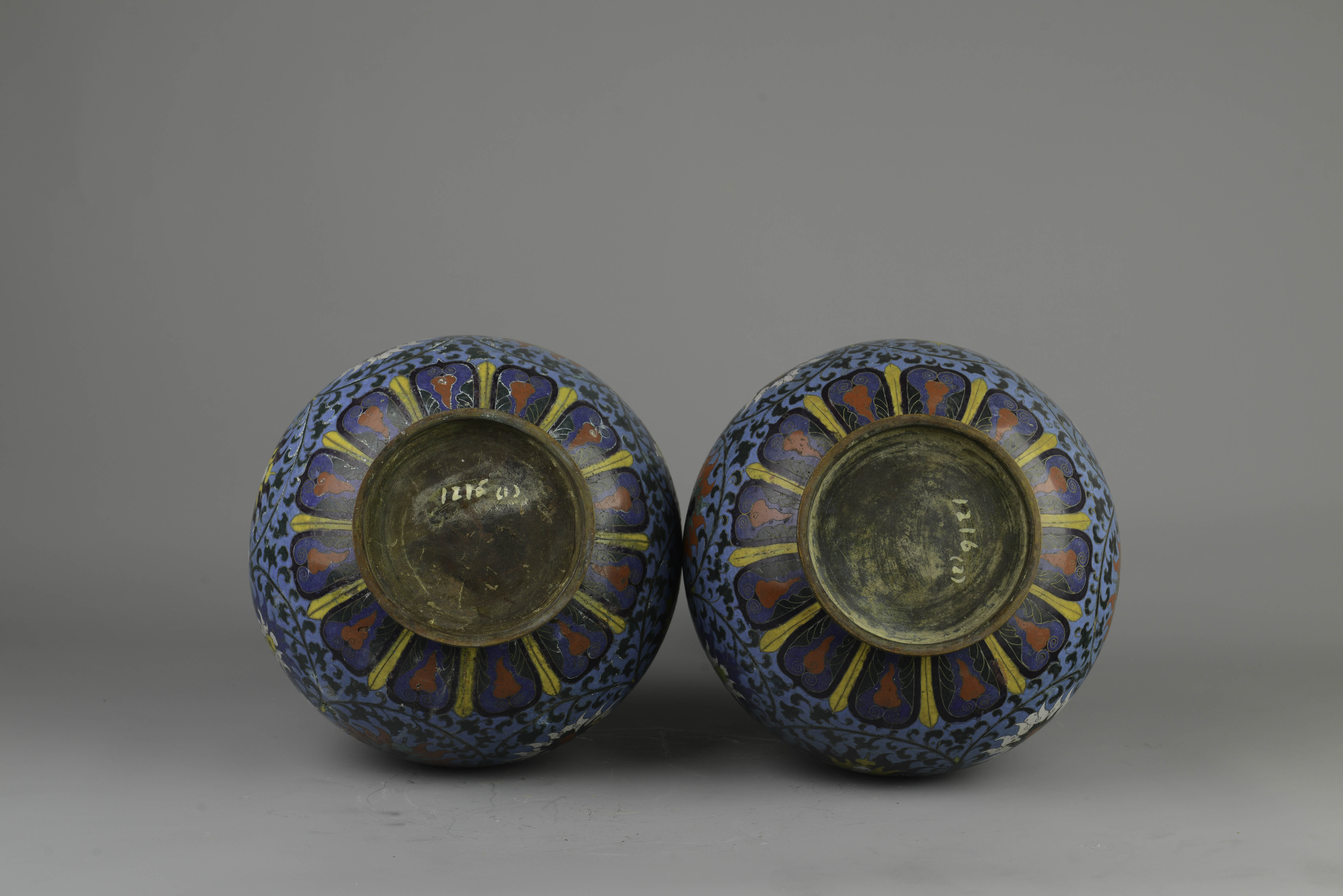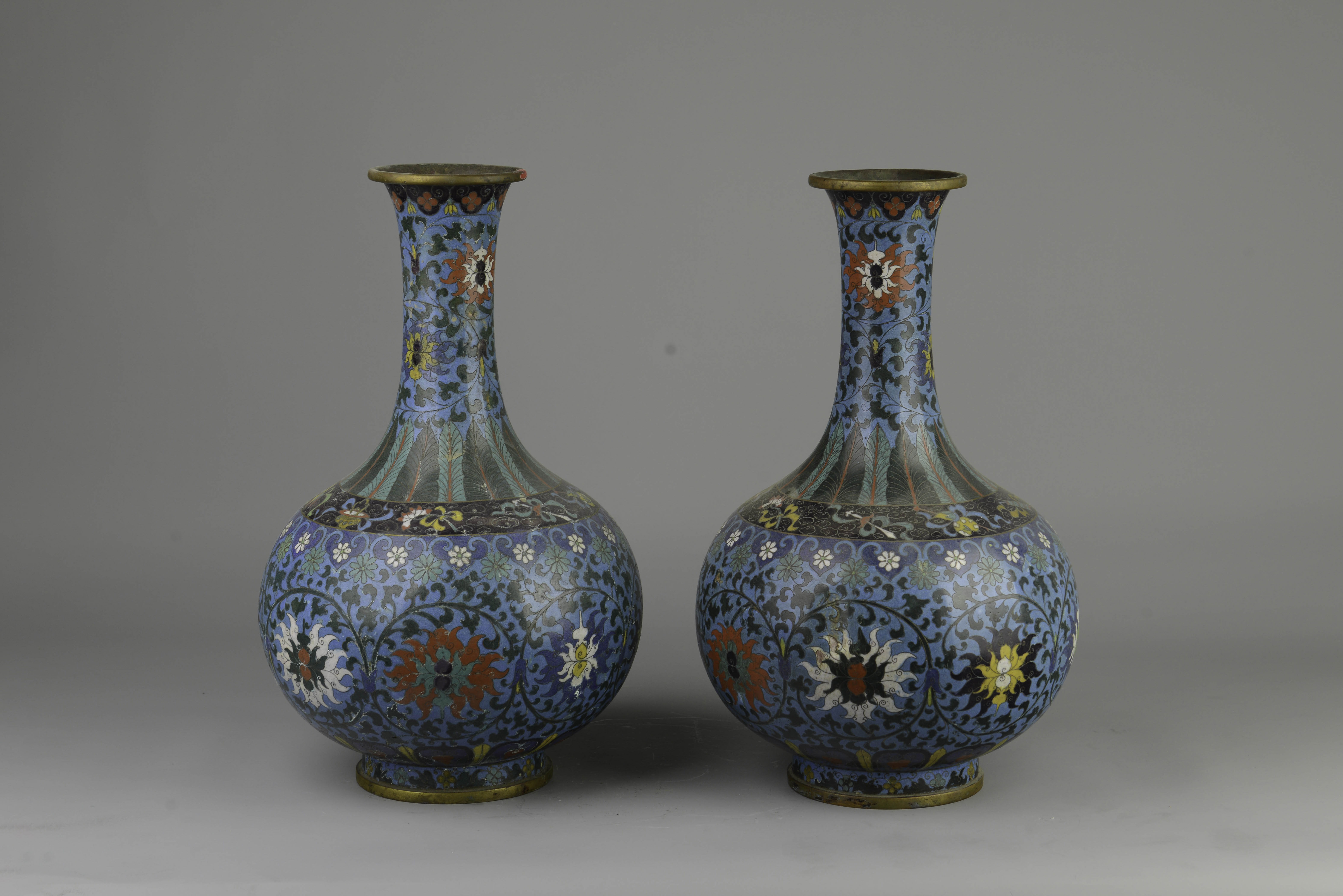 敞口卷唇,长颈,球形腹,圈足。通体为铜胎掐丝珐琅,口部饰梅美如意一纹;颈,腹部饰缠枝蕃莲纹;颈,肩部饰蕉叶、八宝纹;腹下部近圈足处饰仰莲纹。湖蓝色主色调,另以红、白、黑、黄、绿等多种色彩填充。