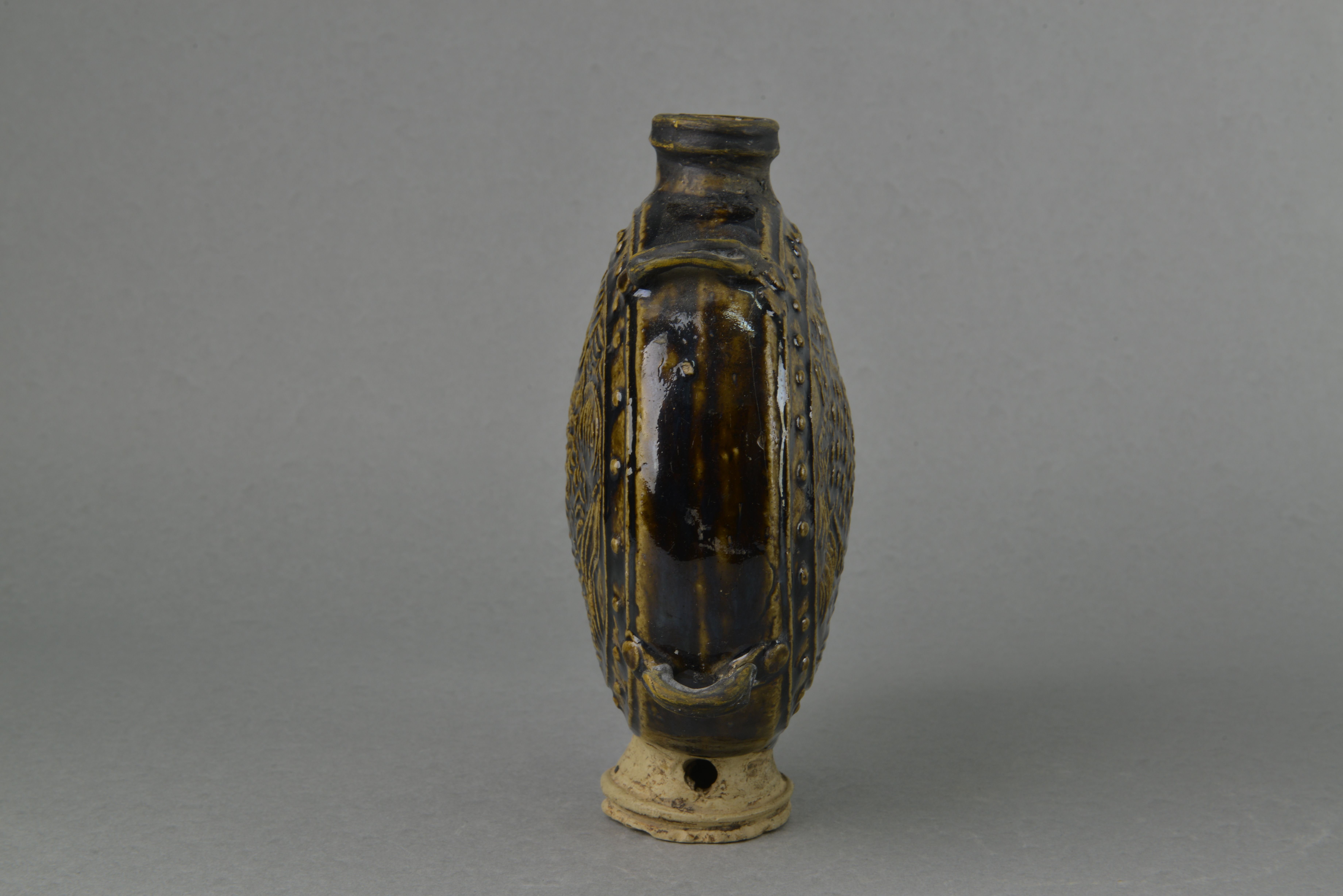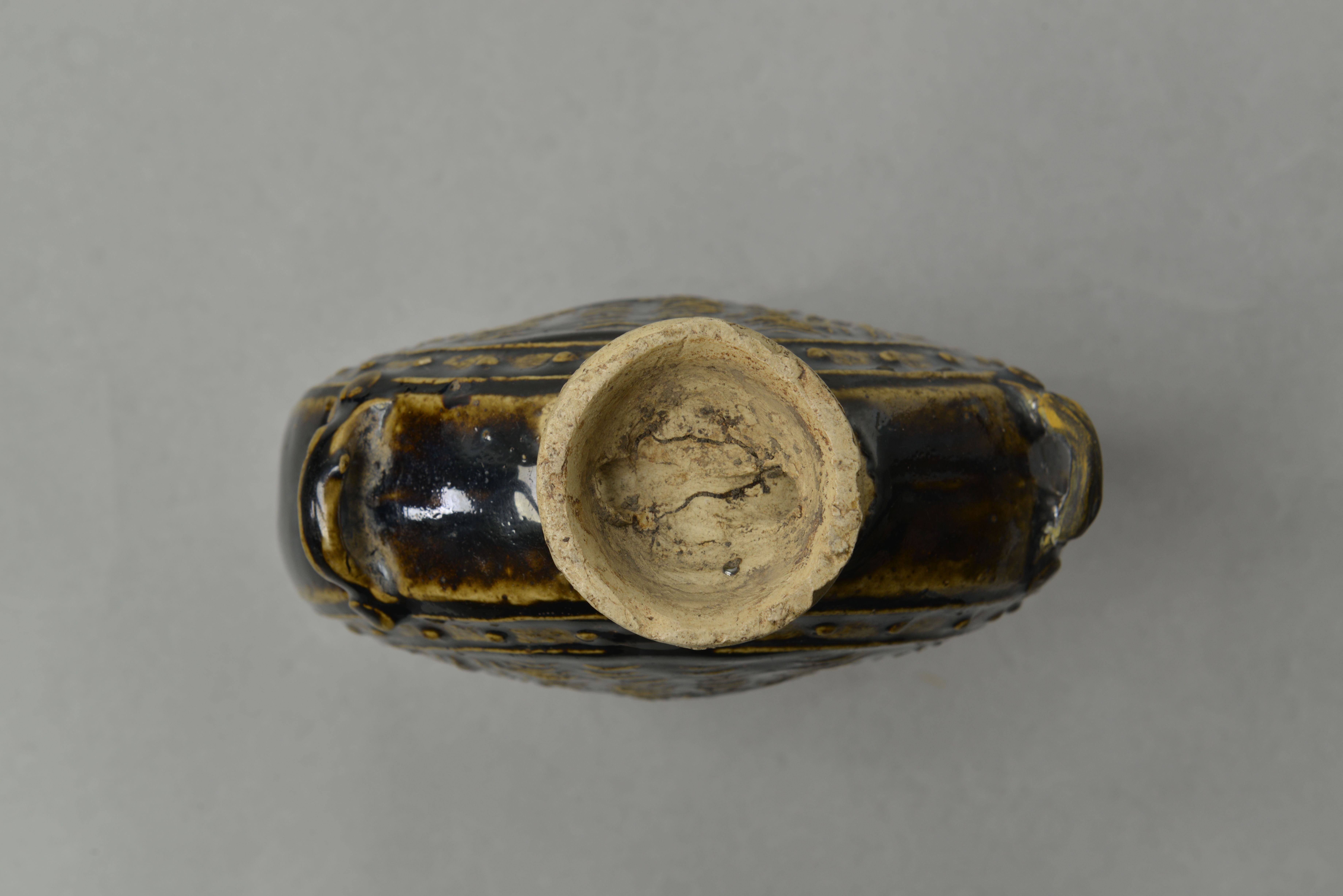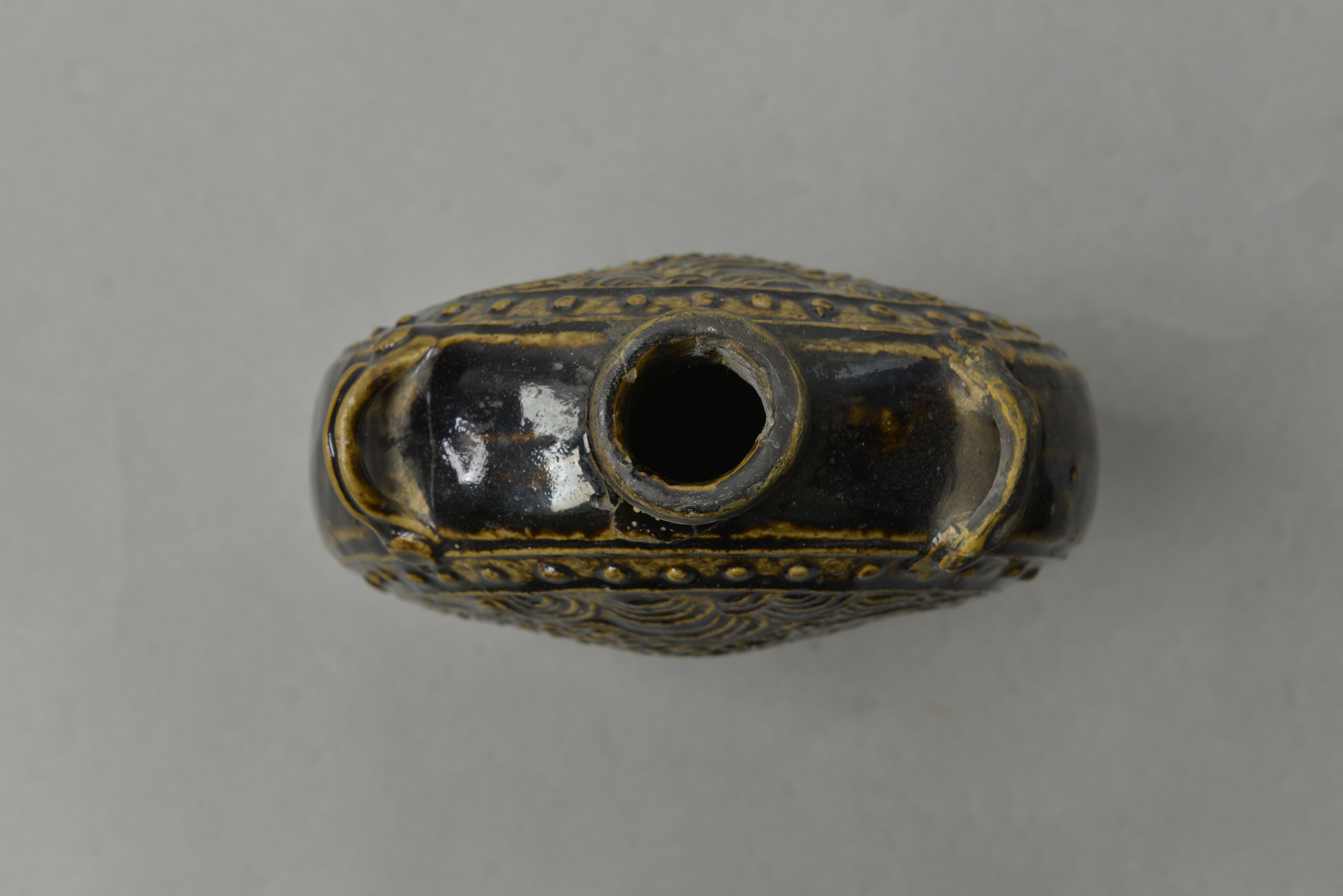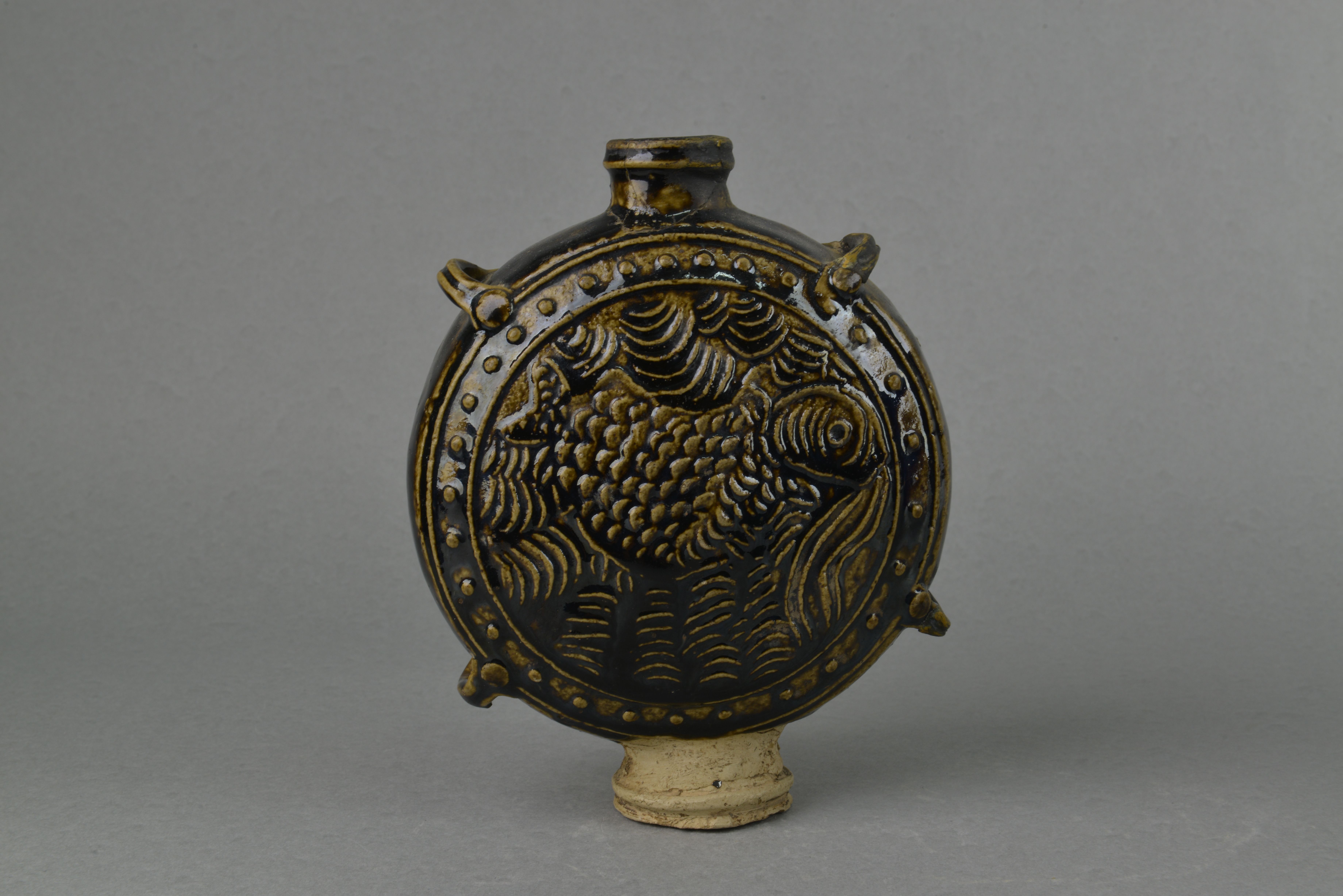 直口,短颈,扁圆腹,高圈足。腹两侧有对称双系。器表施黑釉,腹部饰海水鱼纹,其外饰两周凸弦纹,弦纹内饰串珠纹。圈足露胎,圈足两侧有圆形穿。