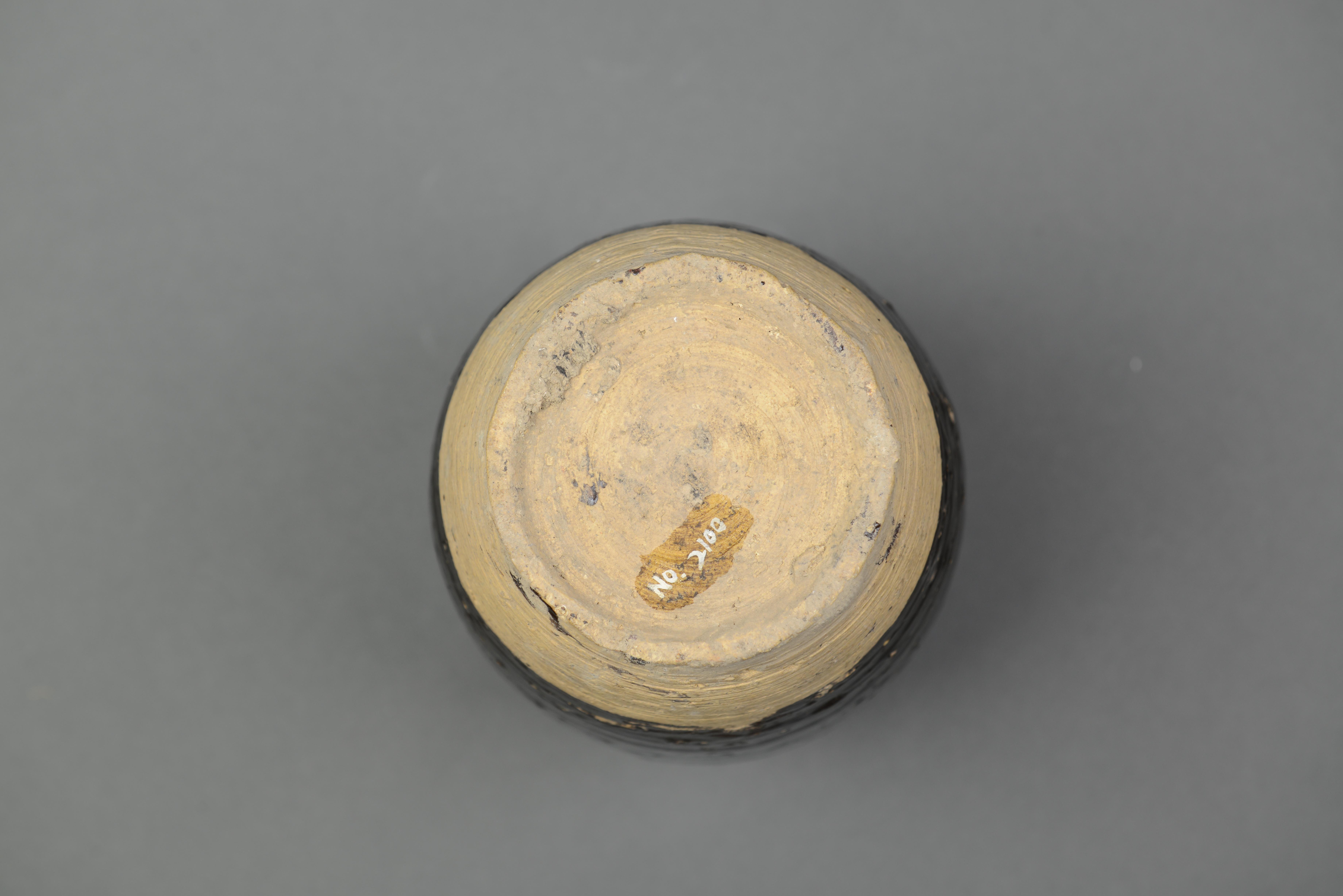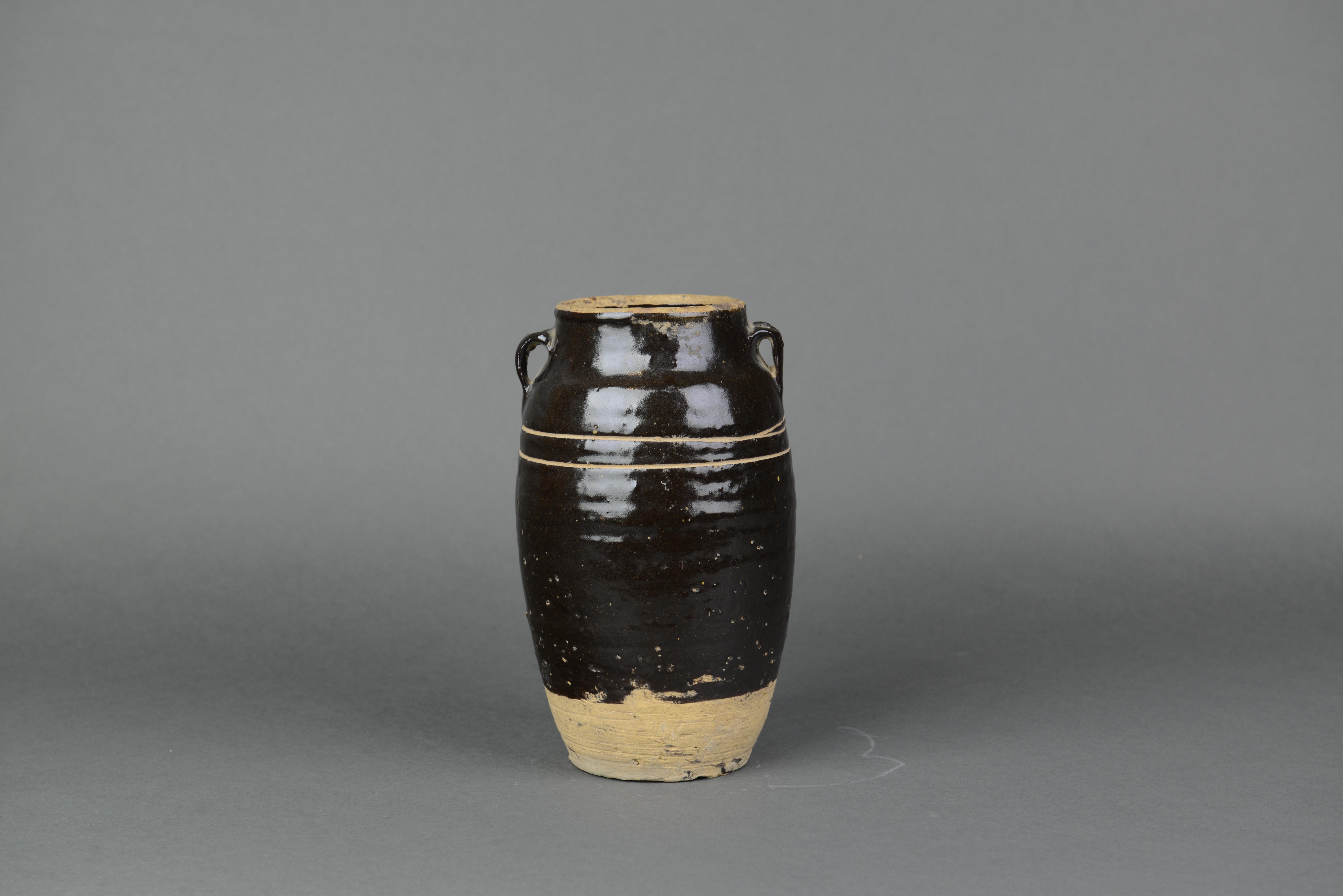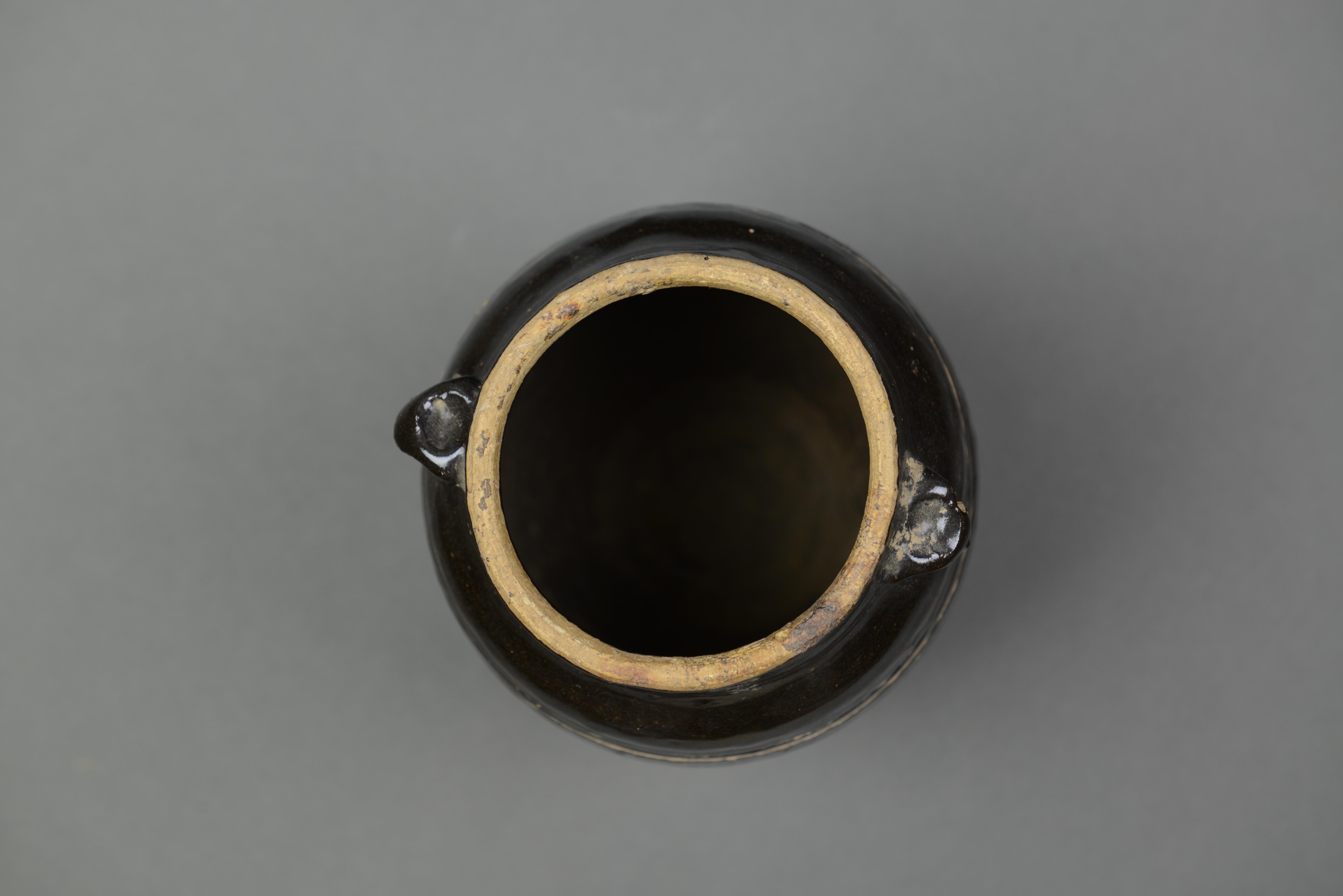 敛口,短颈,深腹,圈足,颈腹间作对称半环形耳。器内外皆施黑釉。口沿刮釉,腹上部刮釉两道成凹弦纹,近圈足处及圈足刮釉。