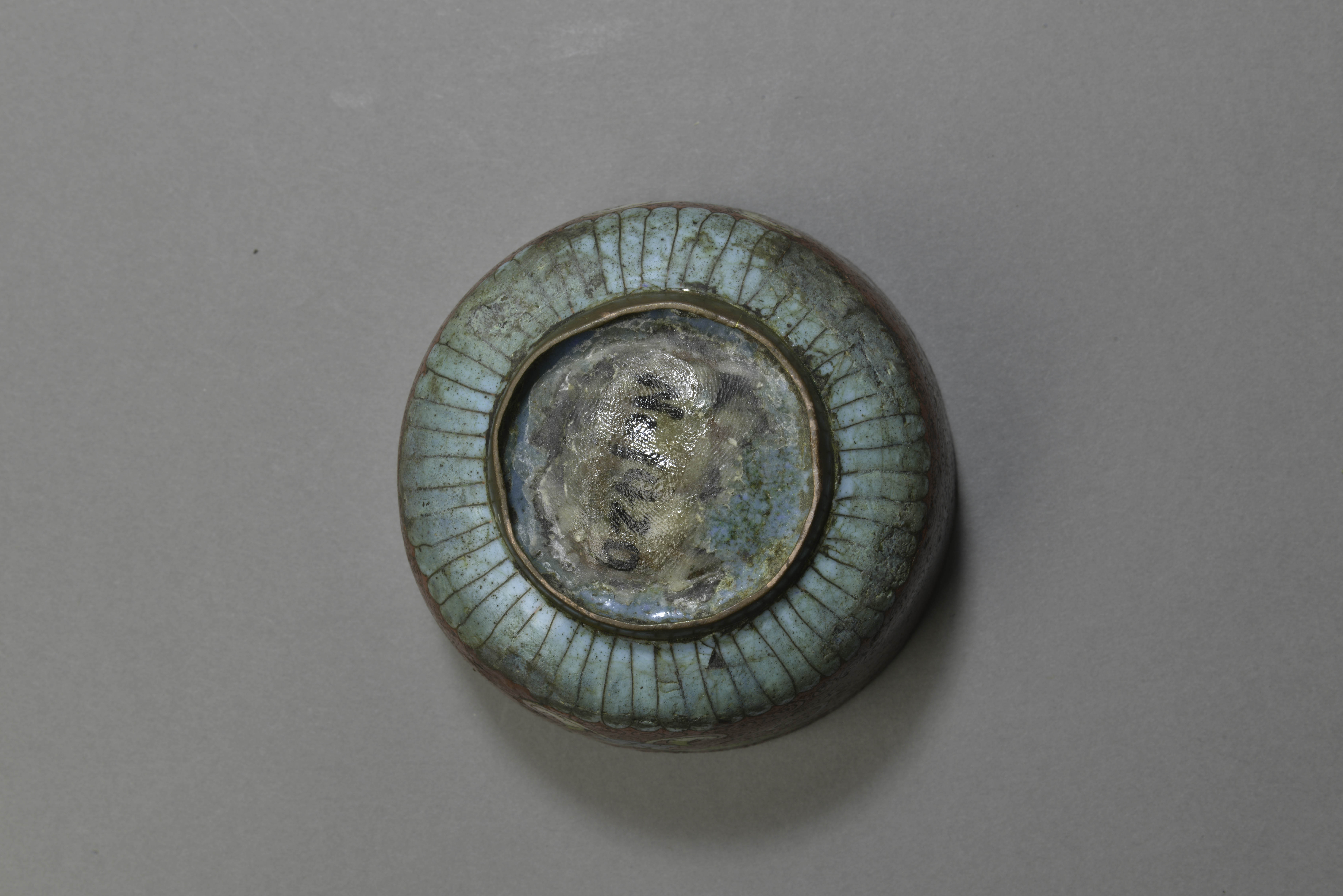直口,弧腹,圈足,通体为铜胎掐丝珐琅,器内为湖蓝色,外壁云纹铺地,饰两株花卉纹,近圈足处饰花瓣纹,外壁以铁锈红为主色调,另填白,蓝,绿色。足底为湖蓝色。