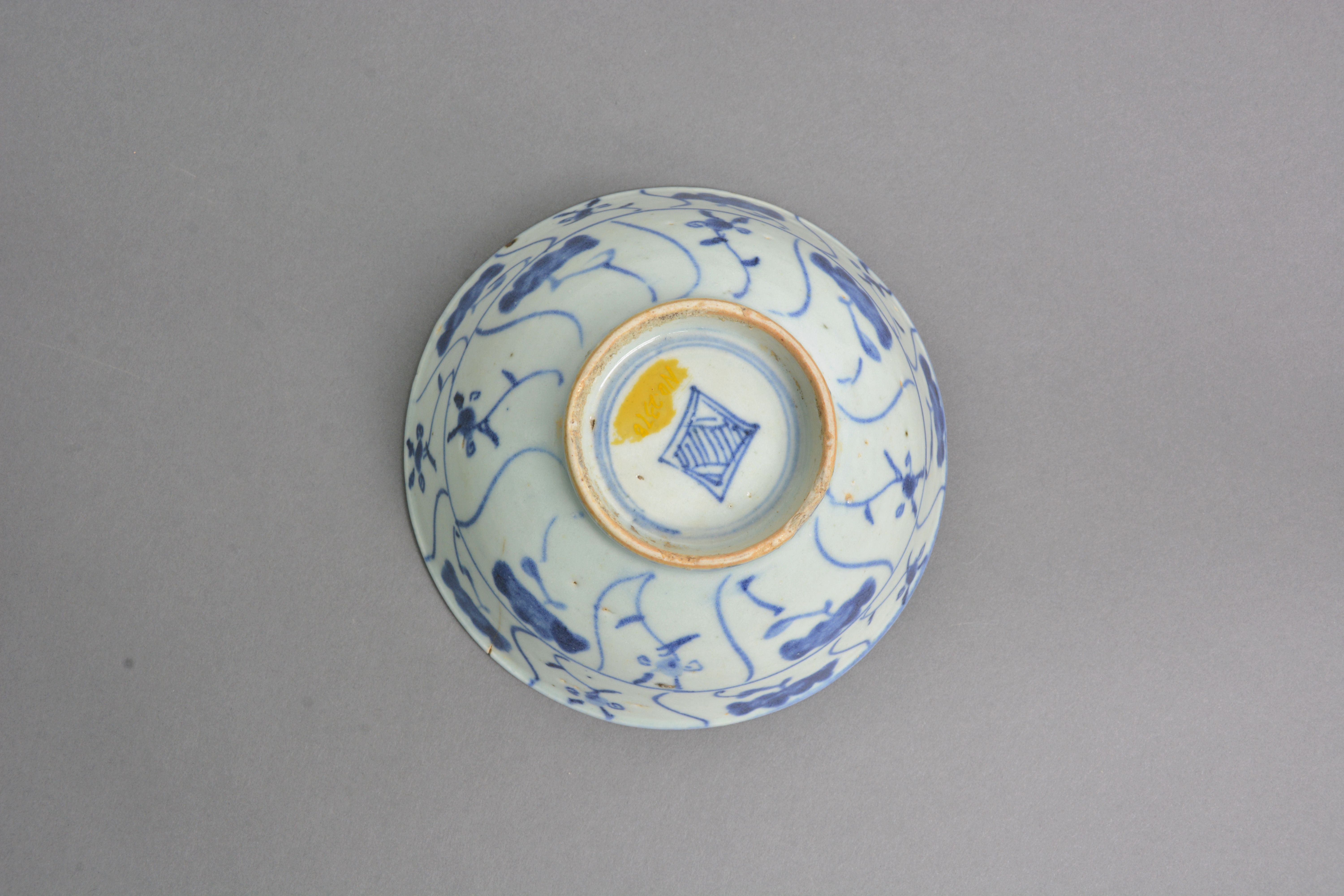 敞口,弧腹,圈足。白釉青花,碗内底心绘双重圈,内画一花样款。外壁一道弦纹将纹饰分为上下两层,各饰折枝花纹。足底饰两道弦纹,内画“豆腐干”花样款。足圈刮釉。
