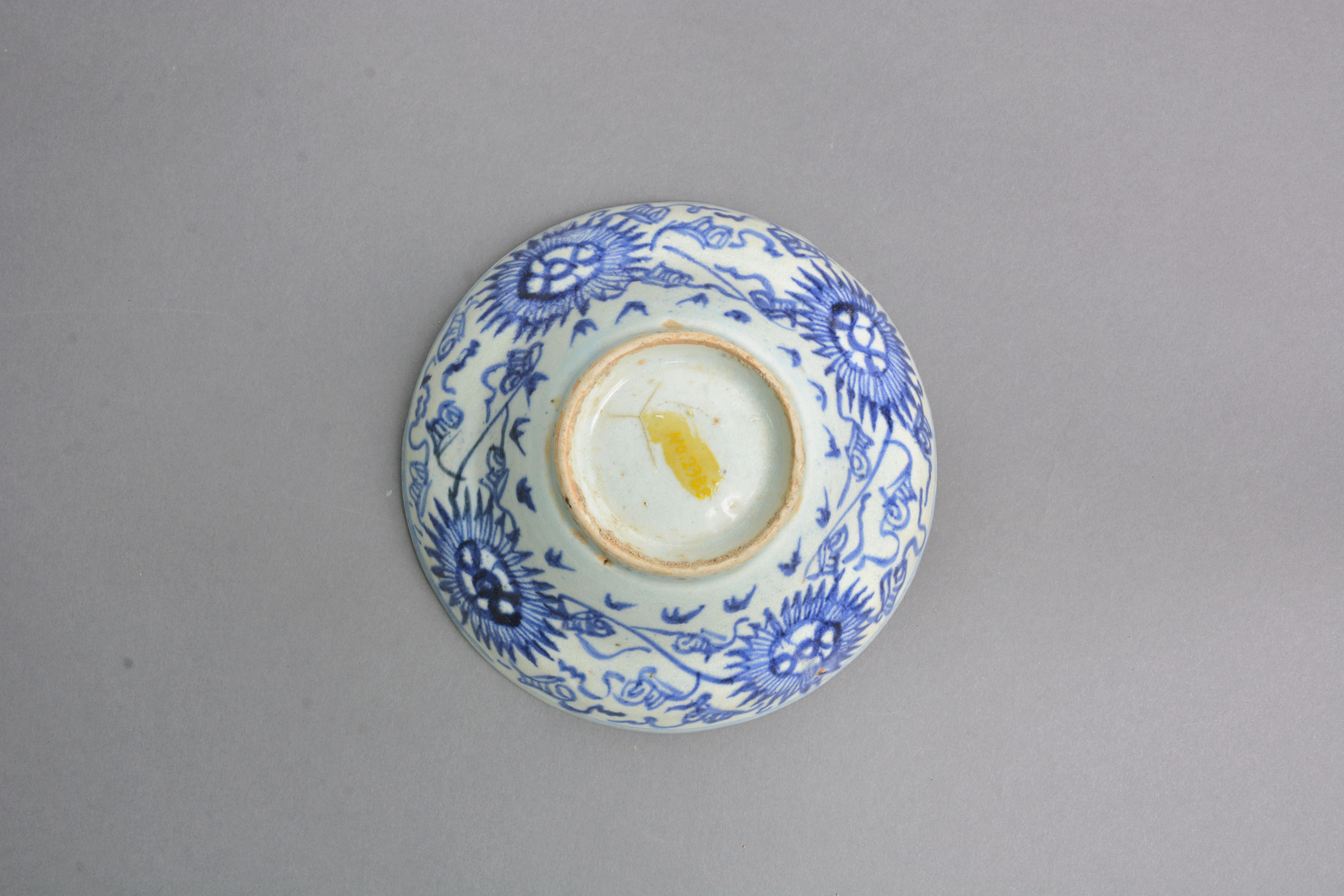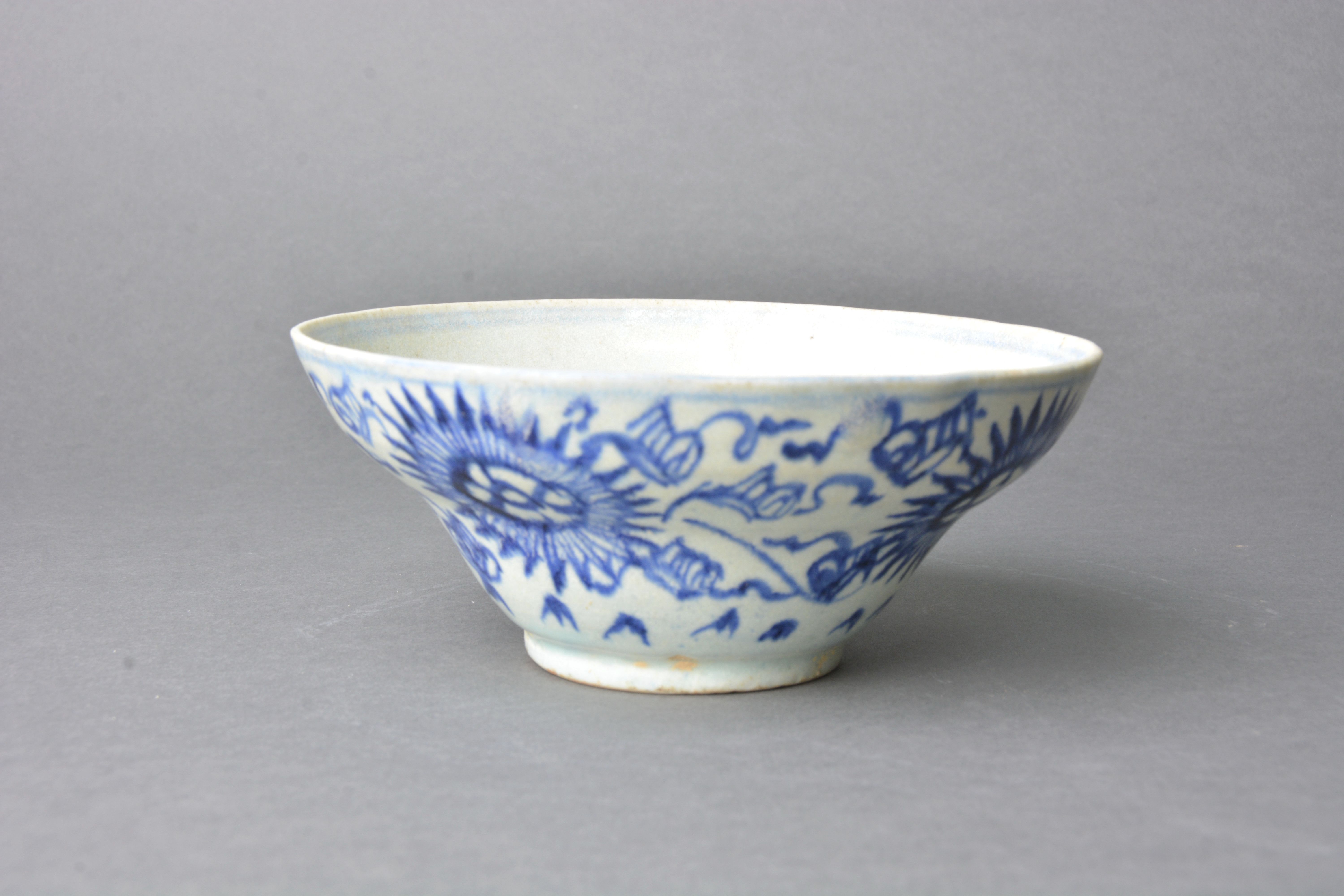 敞口,曲腹,圈足。白釉青花,碗内口沿饰两道弦纹,底心绘双重圈,内画花样款。外壁饰缠枝花纹及草纹,足圈刮釉。