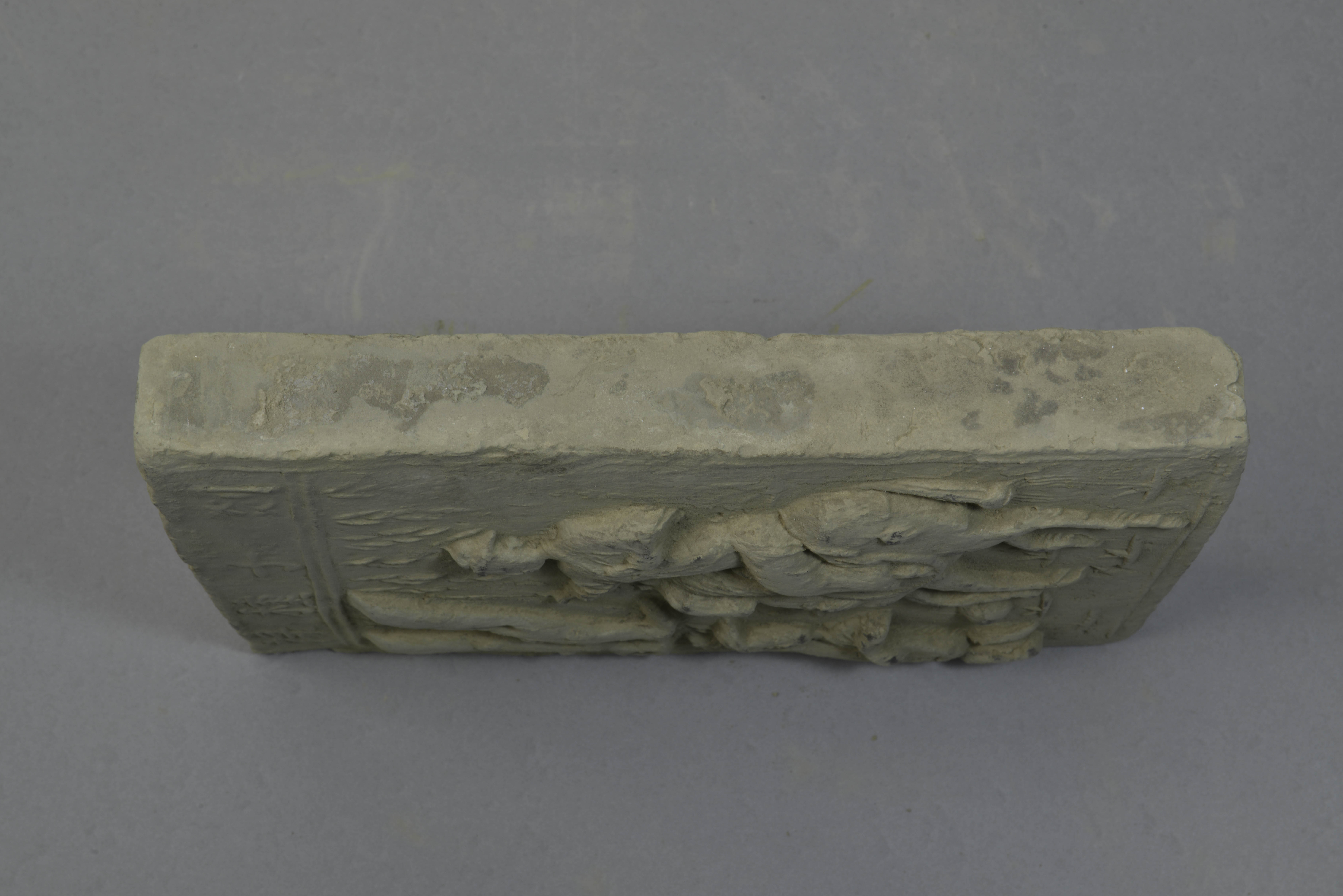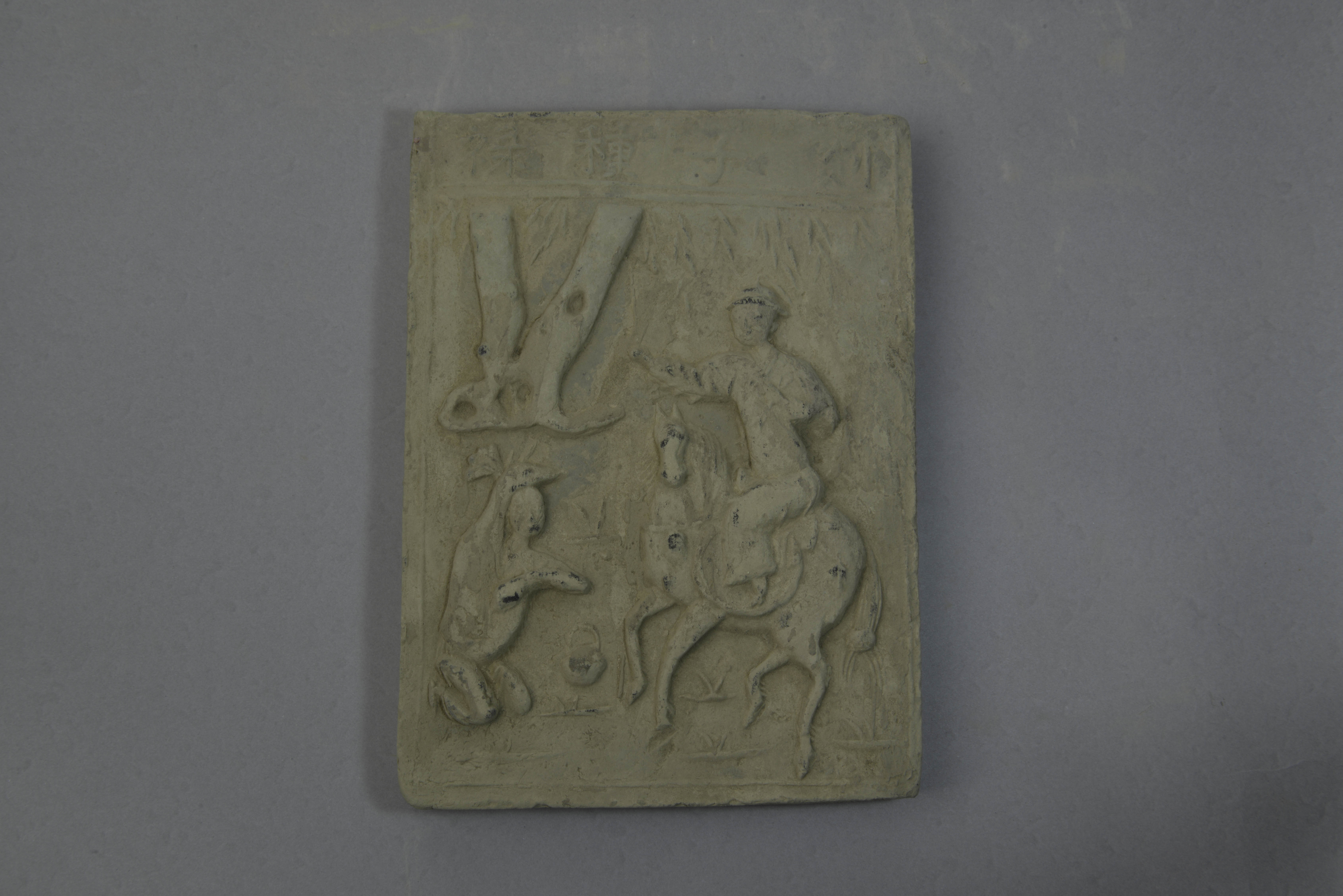 泥质陶,长方形,正面有凸起的边框,内浮雕一青年男子骑于马上,一少年屈膝跪于马前,天头横书楷体阳文“剡子种禄”字样,背面平素。