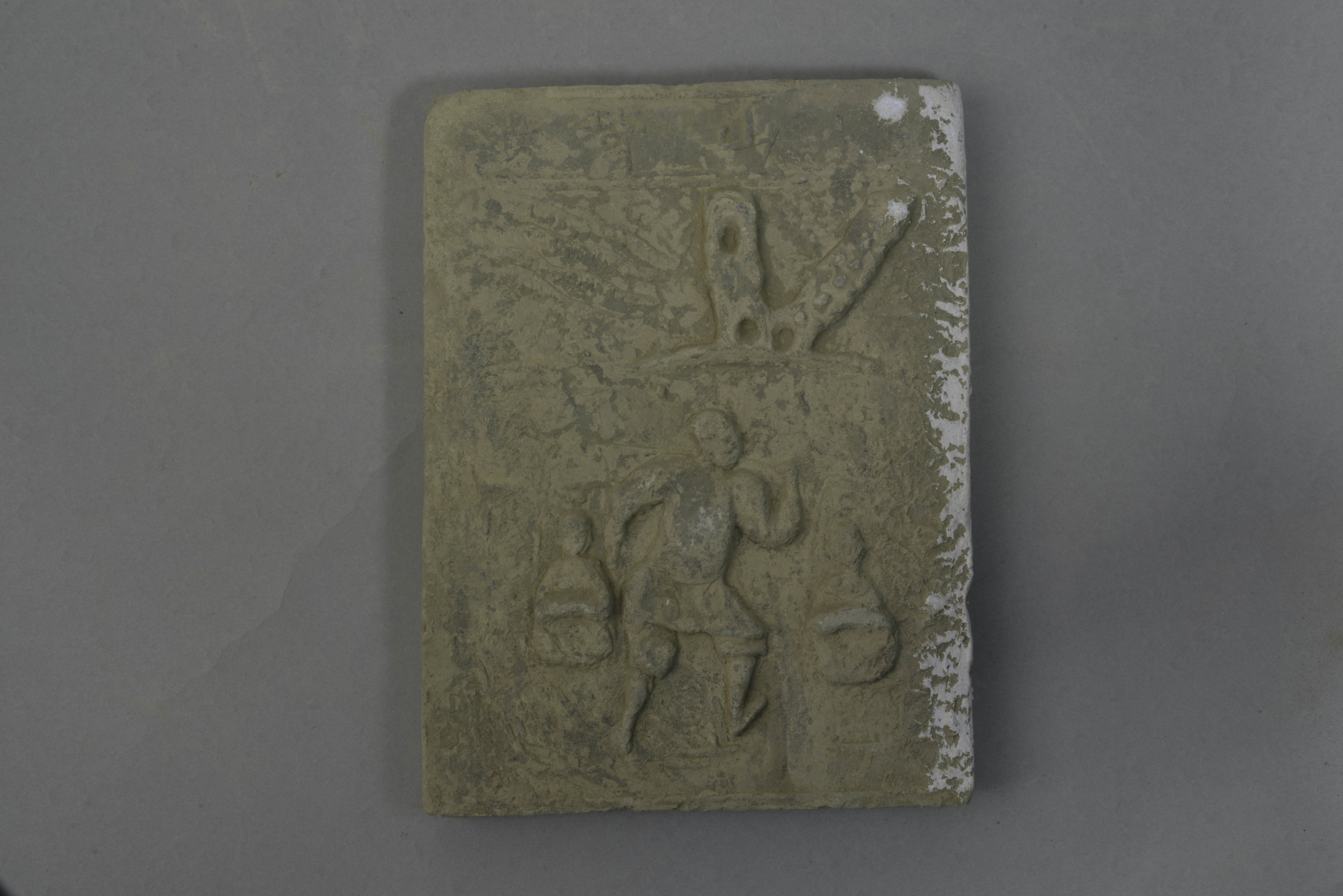 泥质陶,长方形,正面有凸起的边框,内浮雕一挑担行走的壮年男子,担前后框内各坐一孩童。天头横书楷体阳文“□山背□”字样,背面平素。