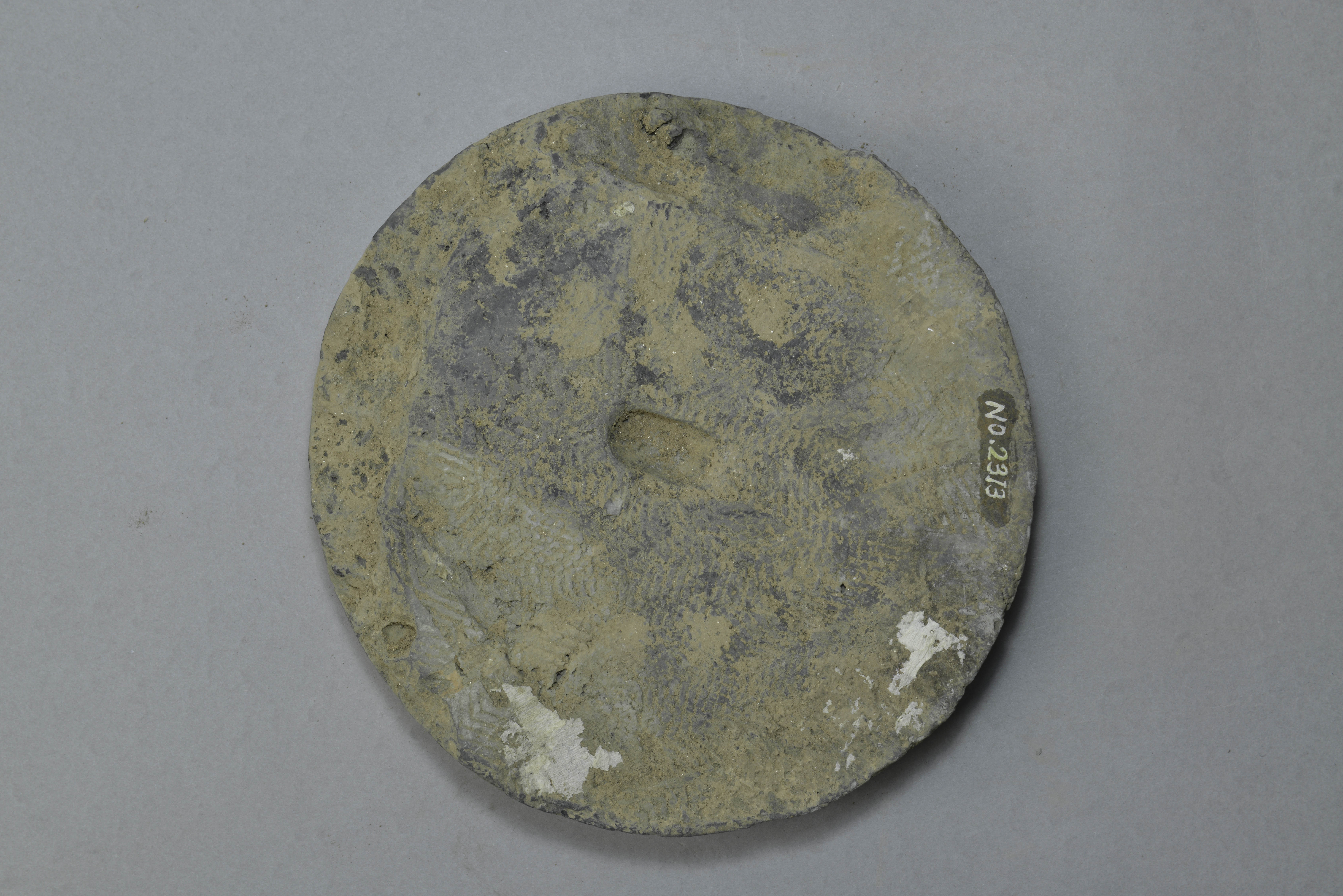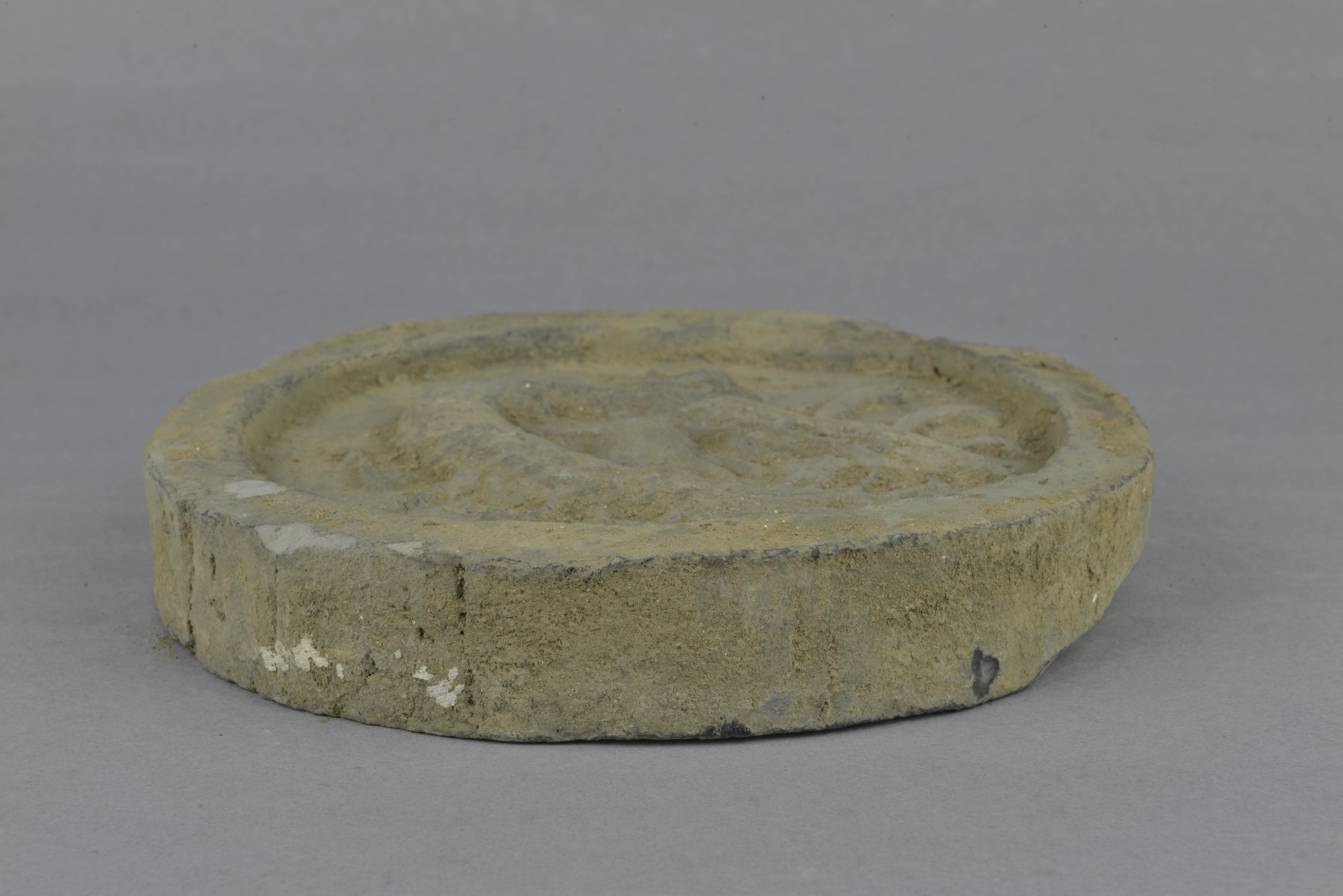 泥质灰陶。圆形,半球形当心,当缘凸挺,当面饰高浮雕朱雀纹。