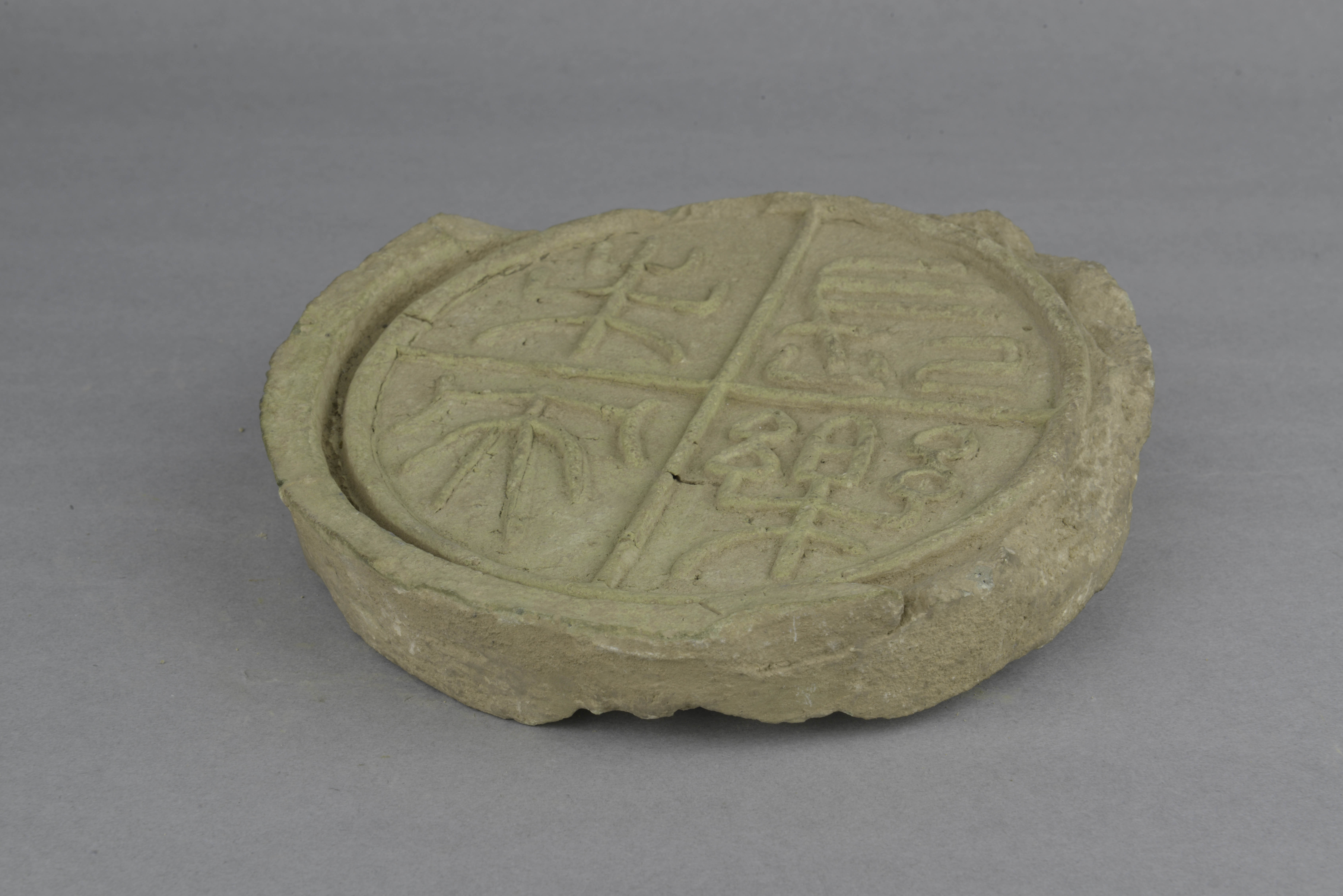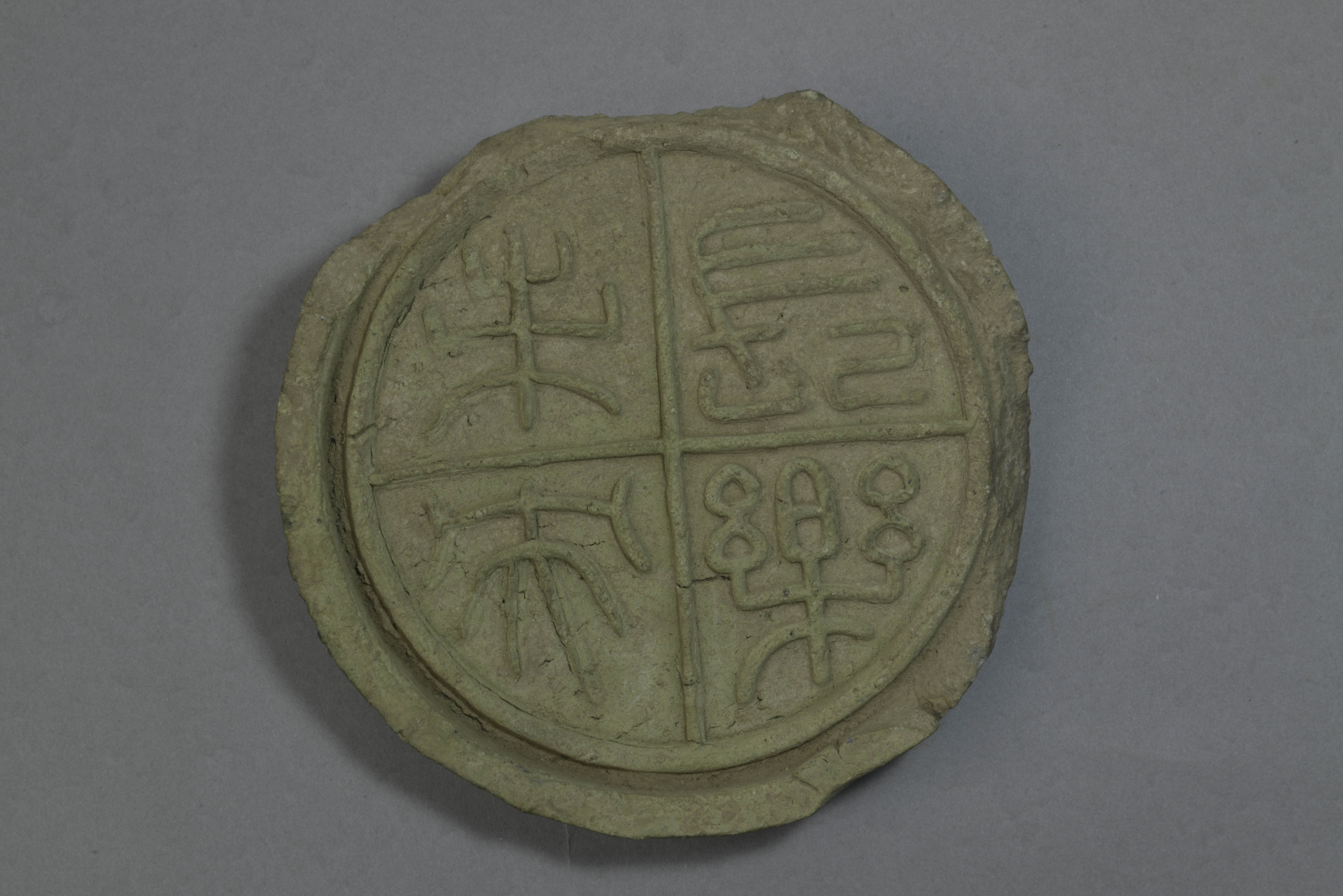 泥质灰陶。圆形,当缘凸挺,当面一周凸弦纹,内由十字状凸弦纹分为四等份,作竖读篆书“长乐未央”四字。