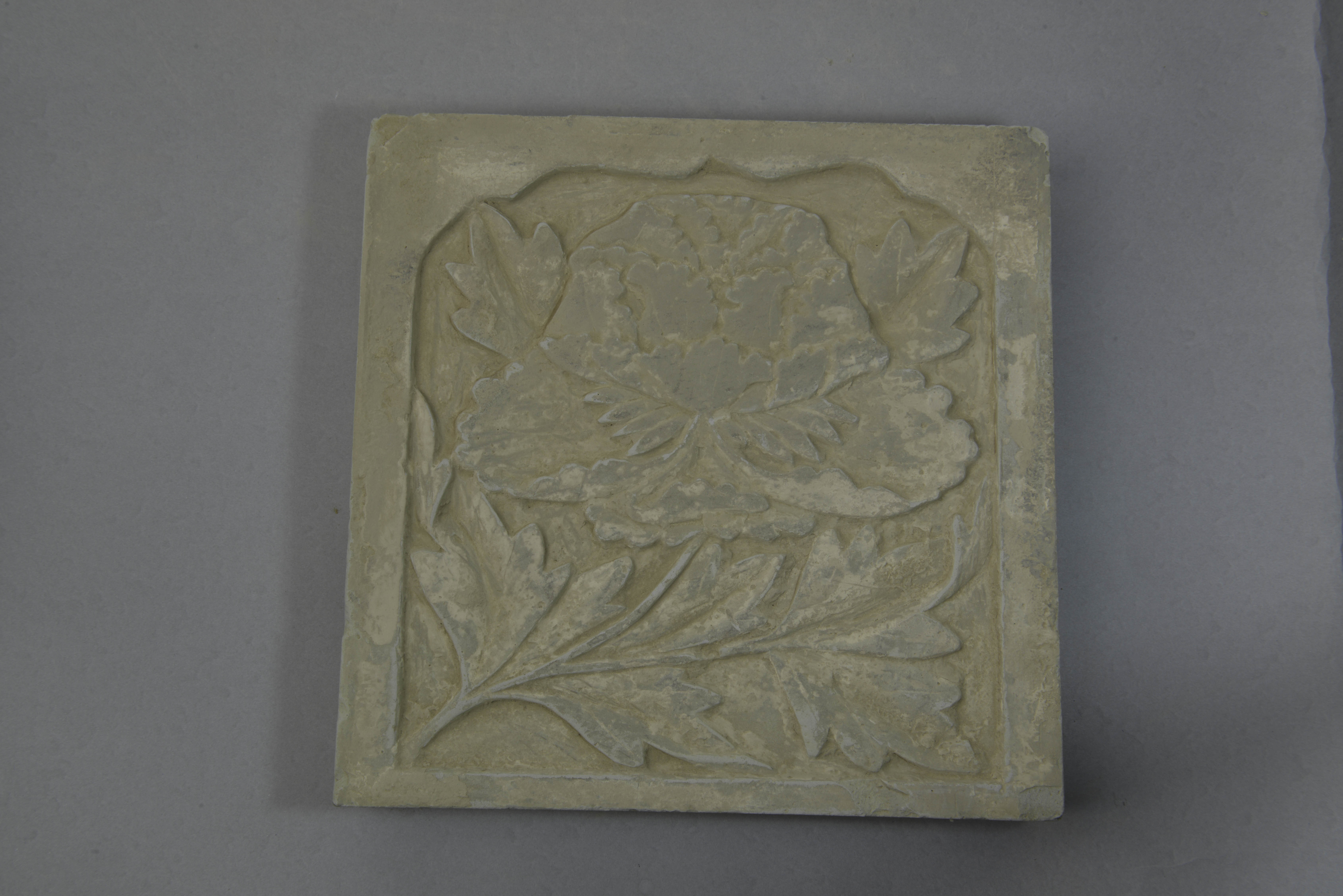 泥质陶。方形,正面开云头方窗,内浮雕一盛开的折枝牡丹,花苞初绽。背面平素。
