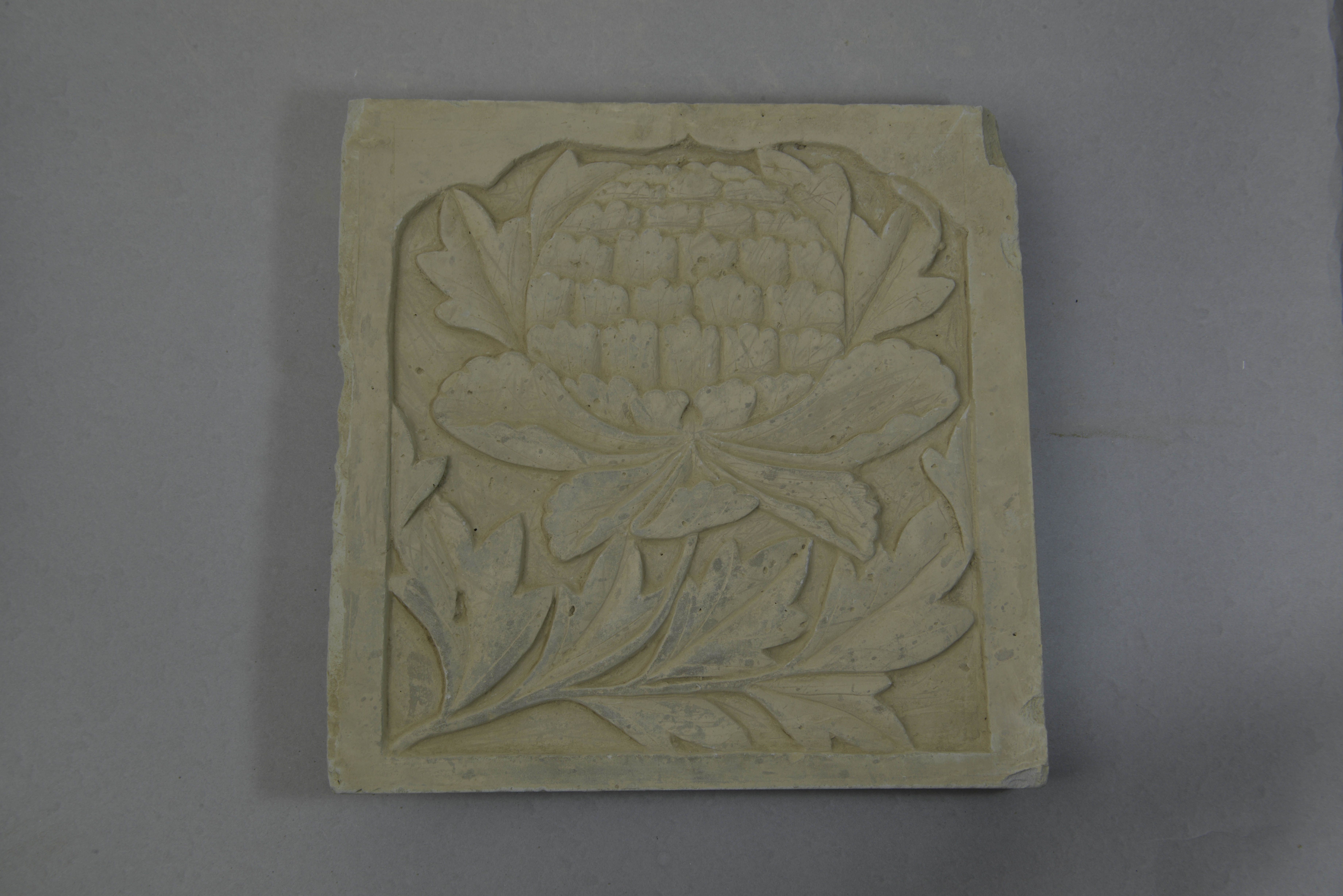 泥质陶。方形,一侧切去成楔状,正面开云头方窗,内浮雕荷叶图案。背面平素。