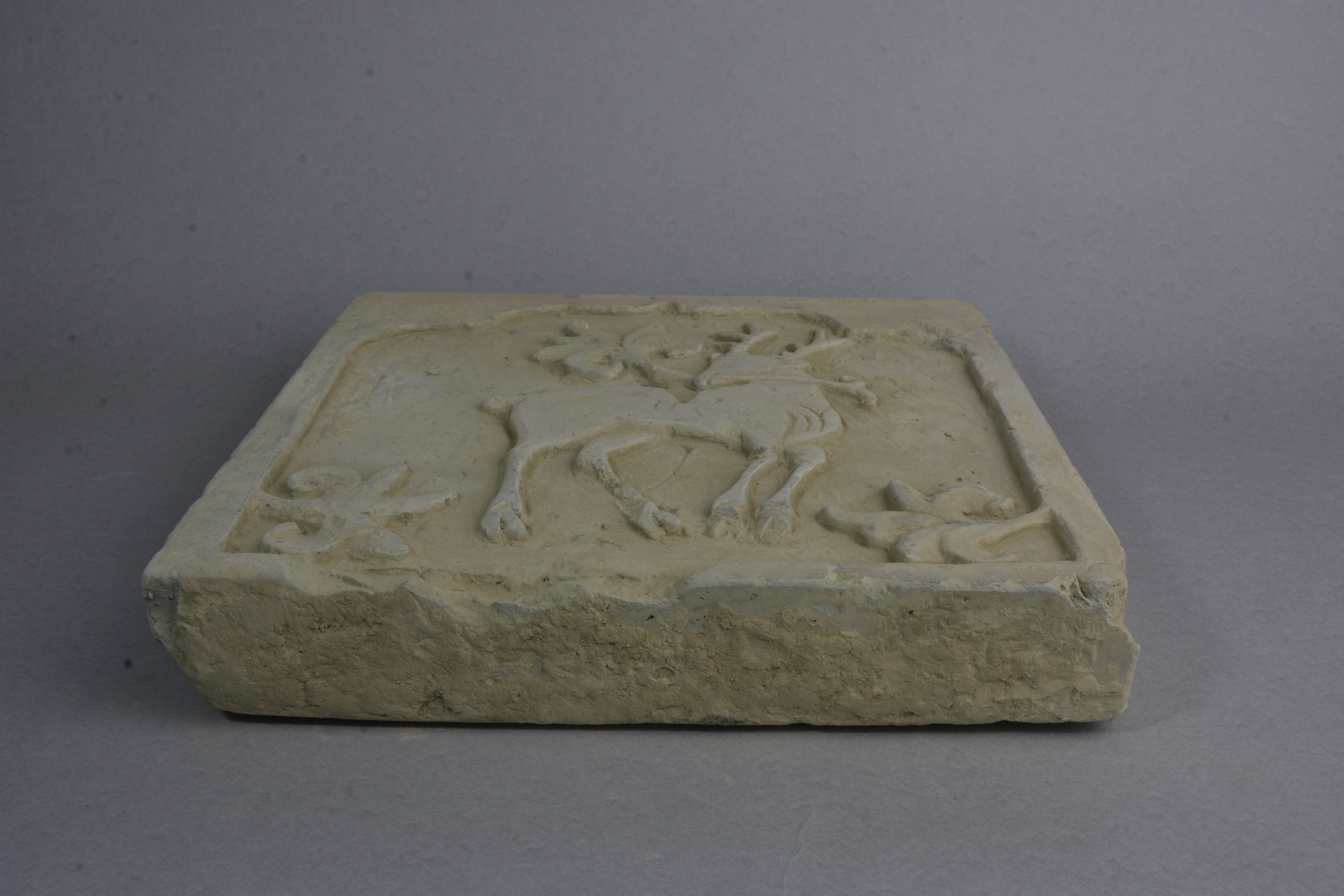 泥质陶。方形,正面开云头方窗,内浮雕一衔草鹿,背面素平。