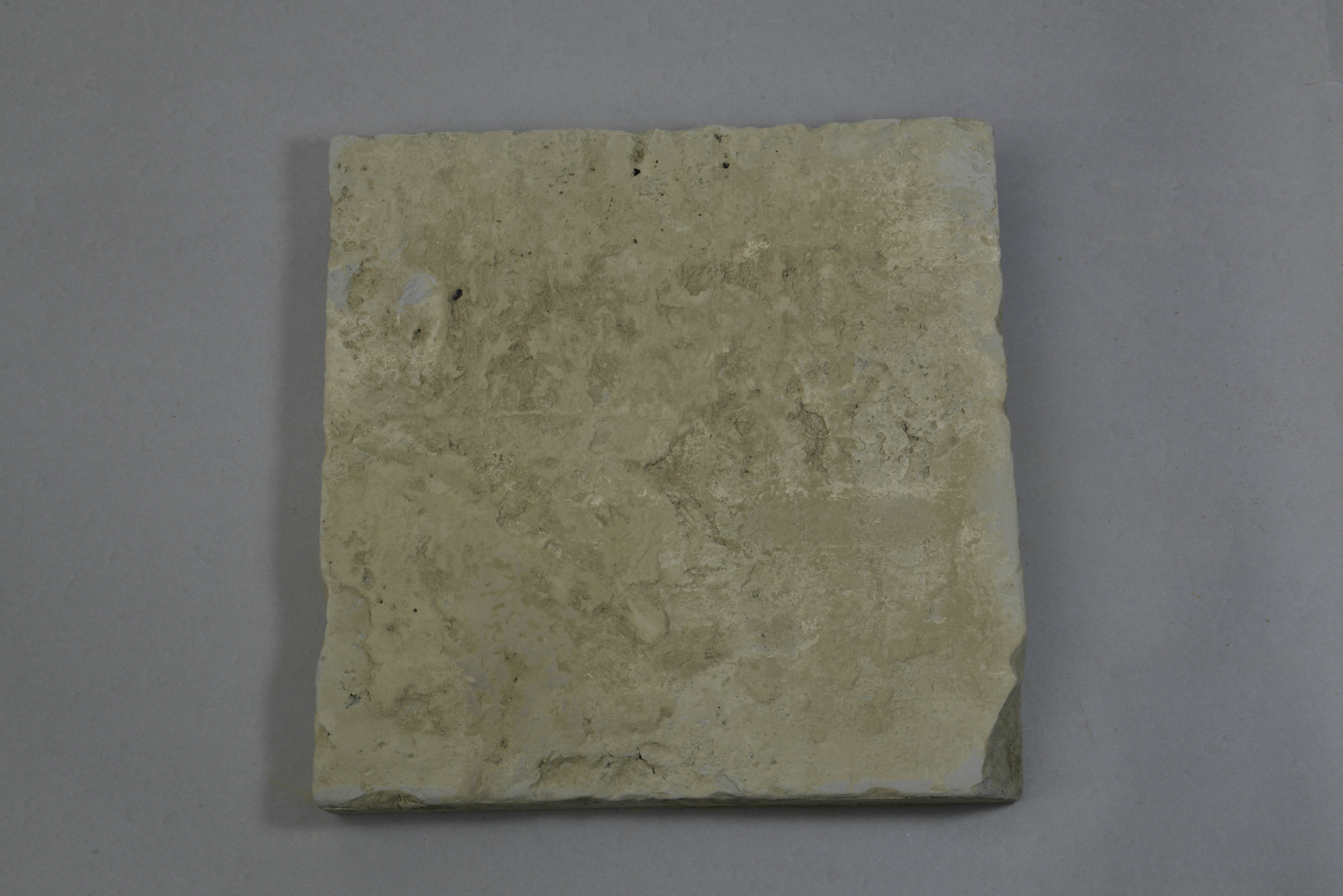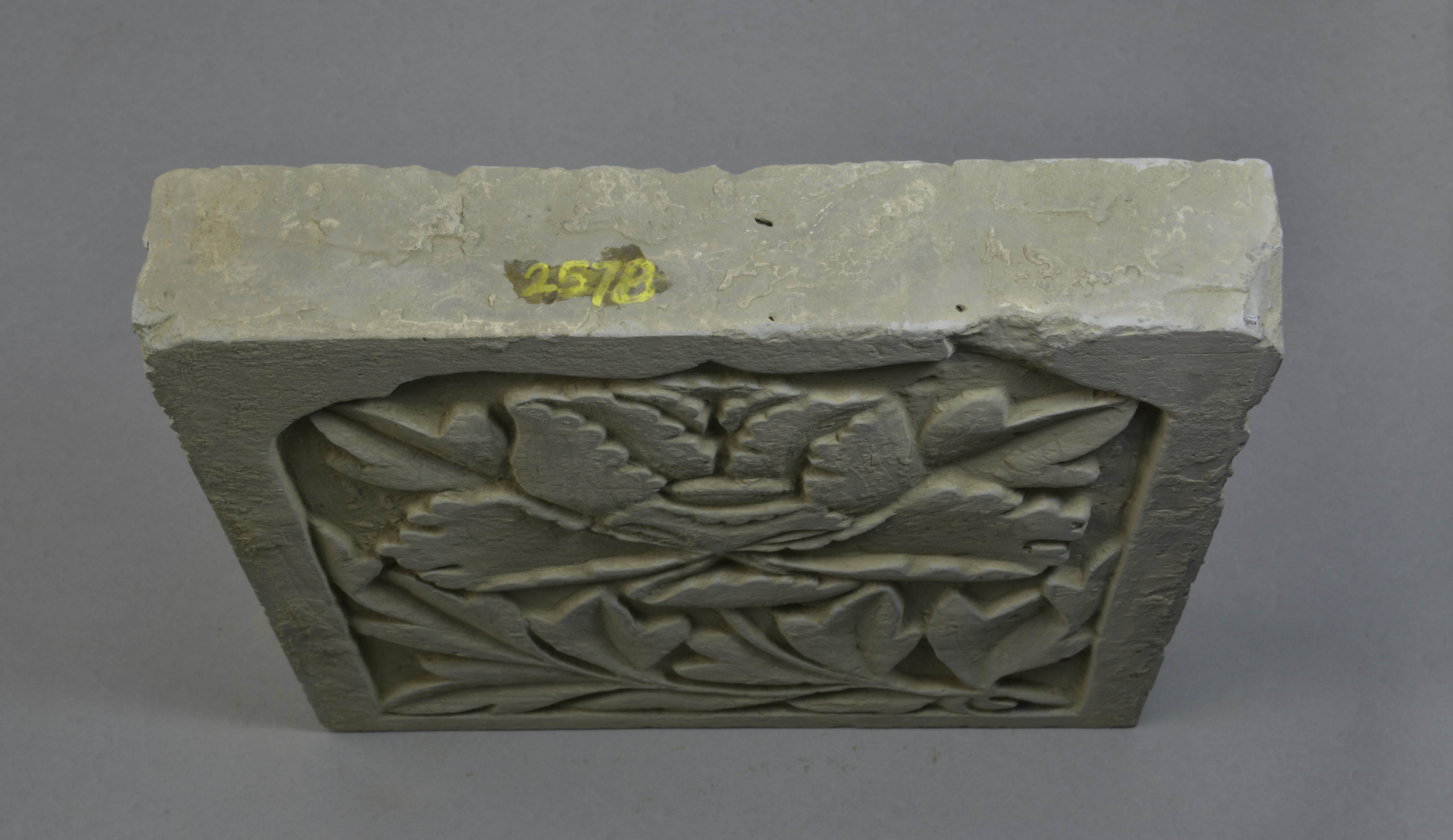泥质陶。方形,正面开云头方窗,内浮雕一盛开的折枝牡丹,花苞初绽。背面平素。