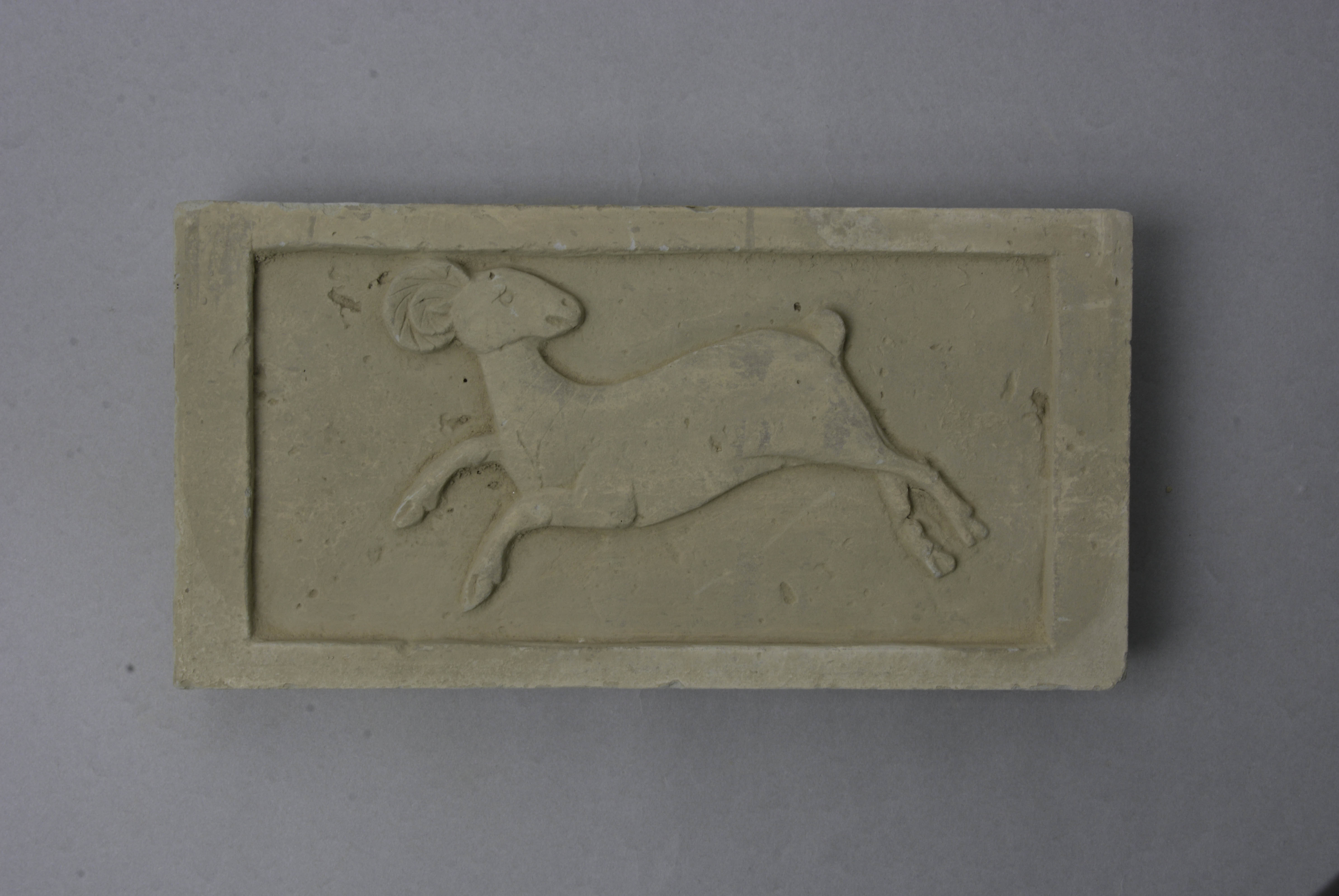 泥质陶。长方形,正面边框凸起,内浮雕一羊,卷角,短尾上翘,回首张望,作撒蹄奔跑状。背面素平。