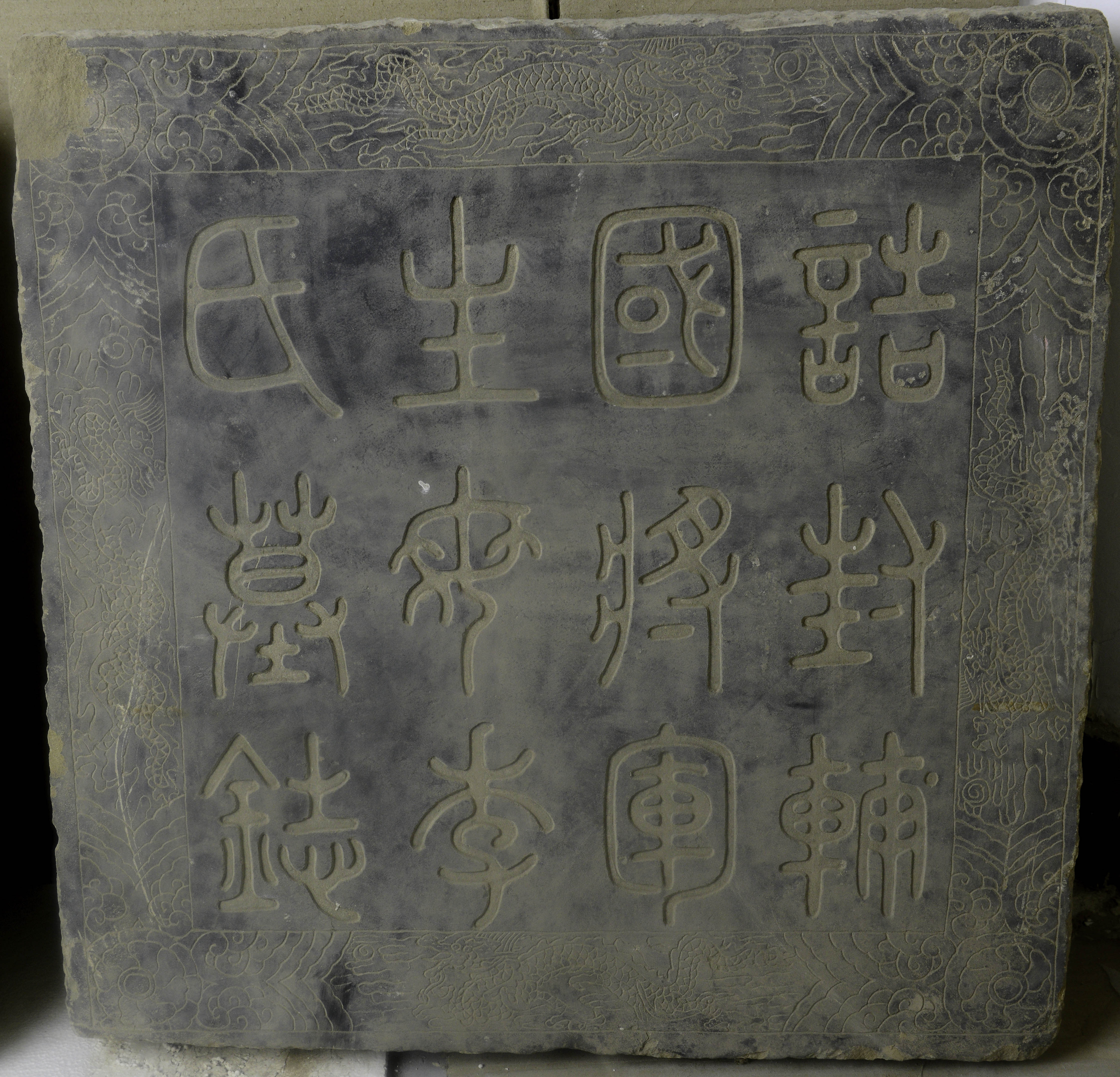 灰黄色砂岩质。盖:正方形,盖面四周阴刻四龙戏珠。中间阴刻篆书四行“诰封辅国将军生母李氏墓志”几字。誌:正方形,四周阴刻卷枝纹,中间誌铭楷体阴刻21行,讲述李氏生平。
