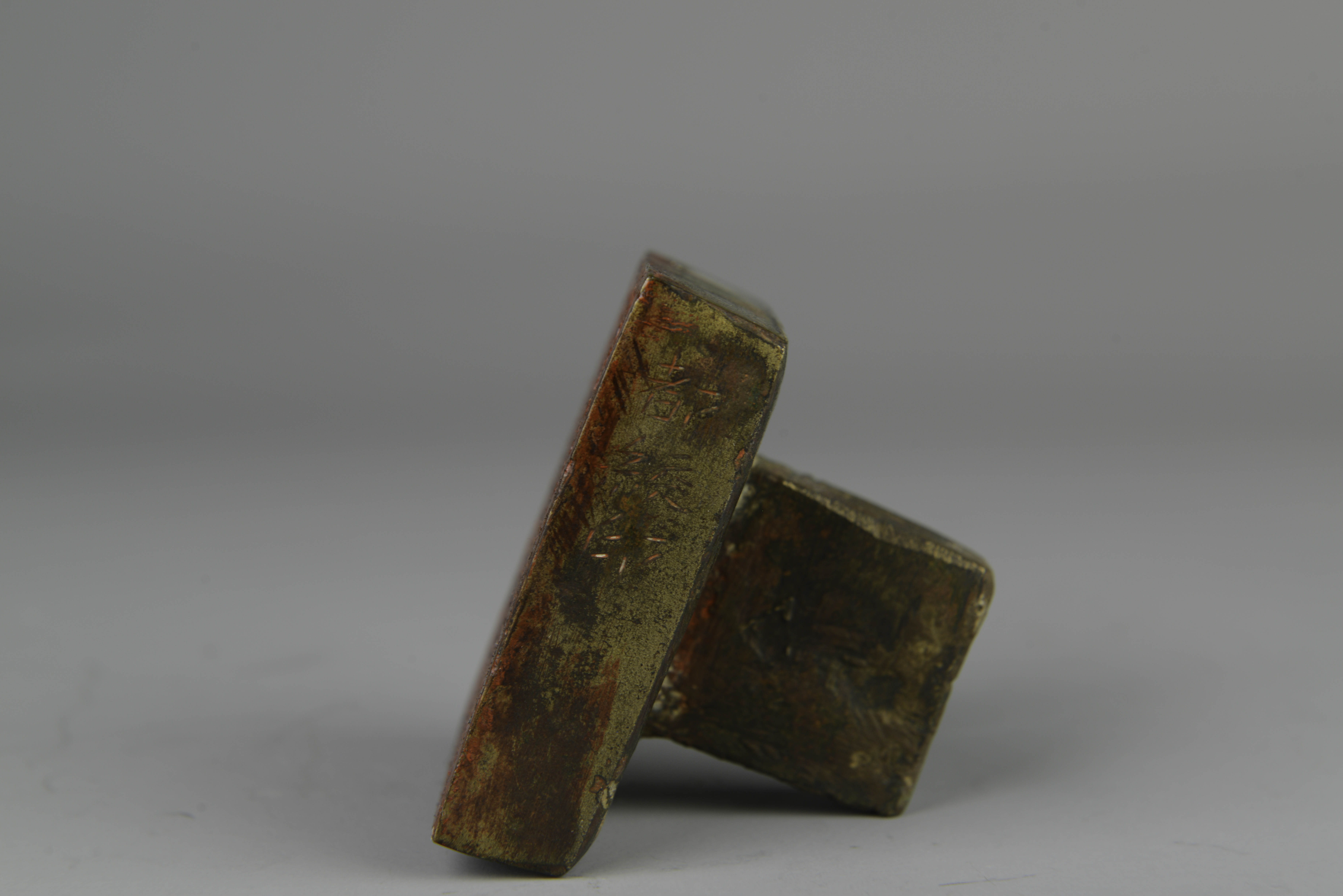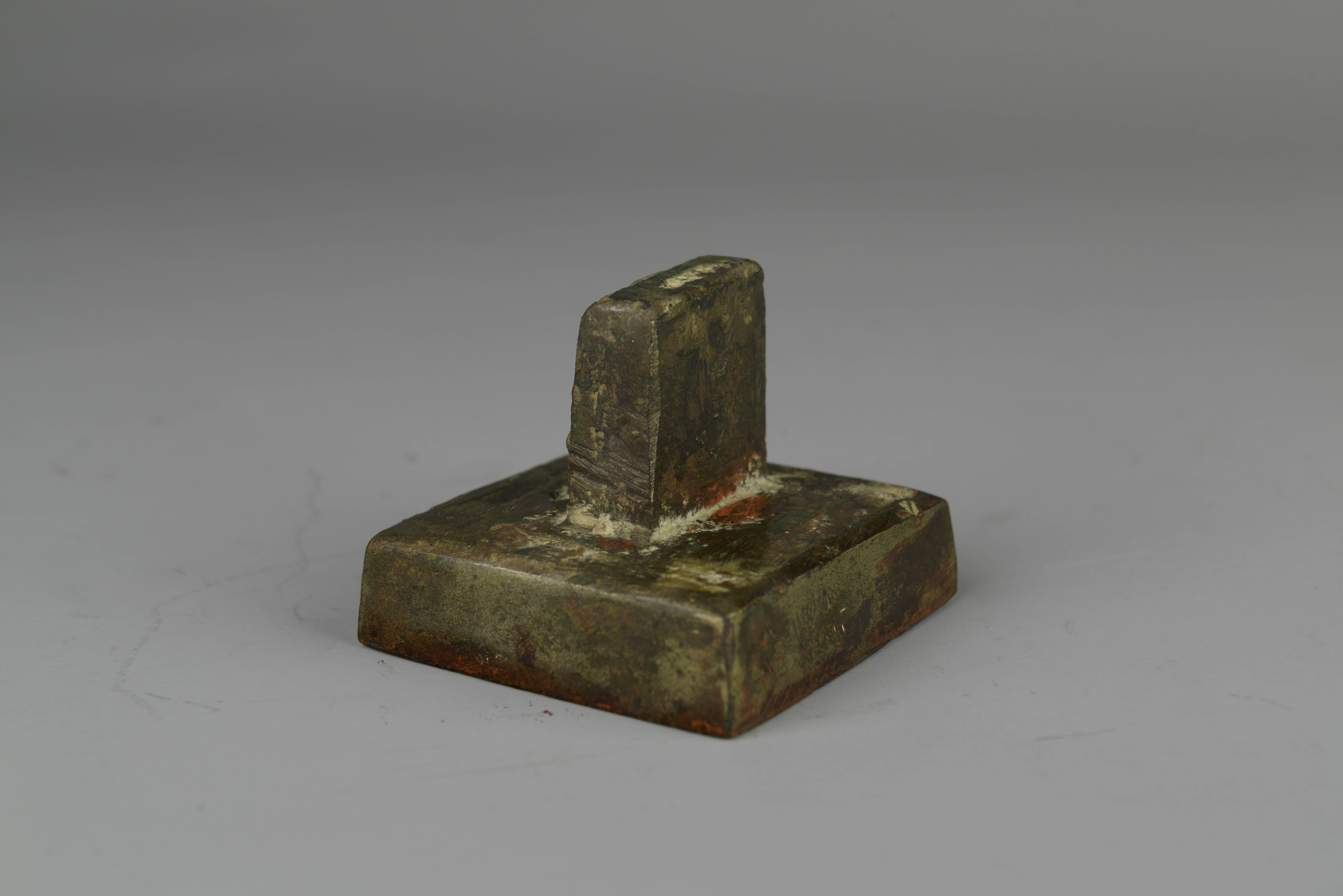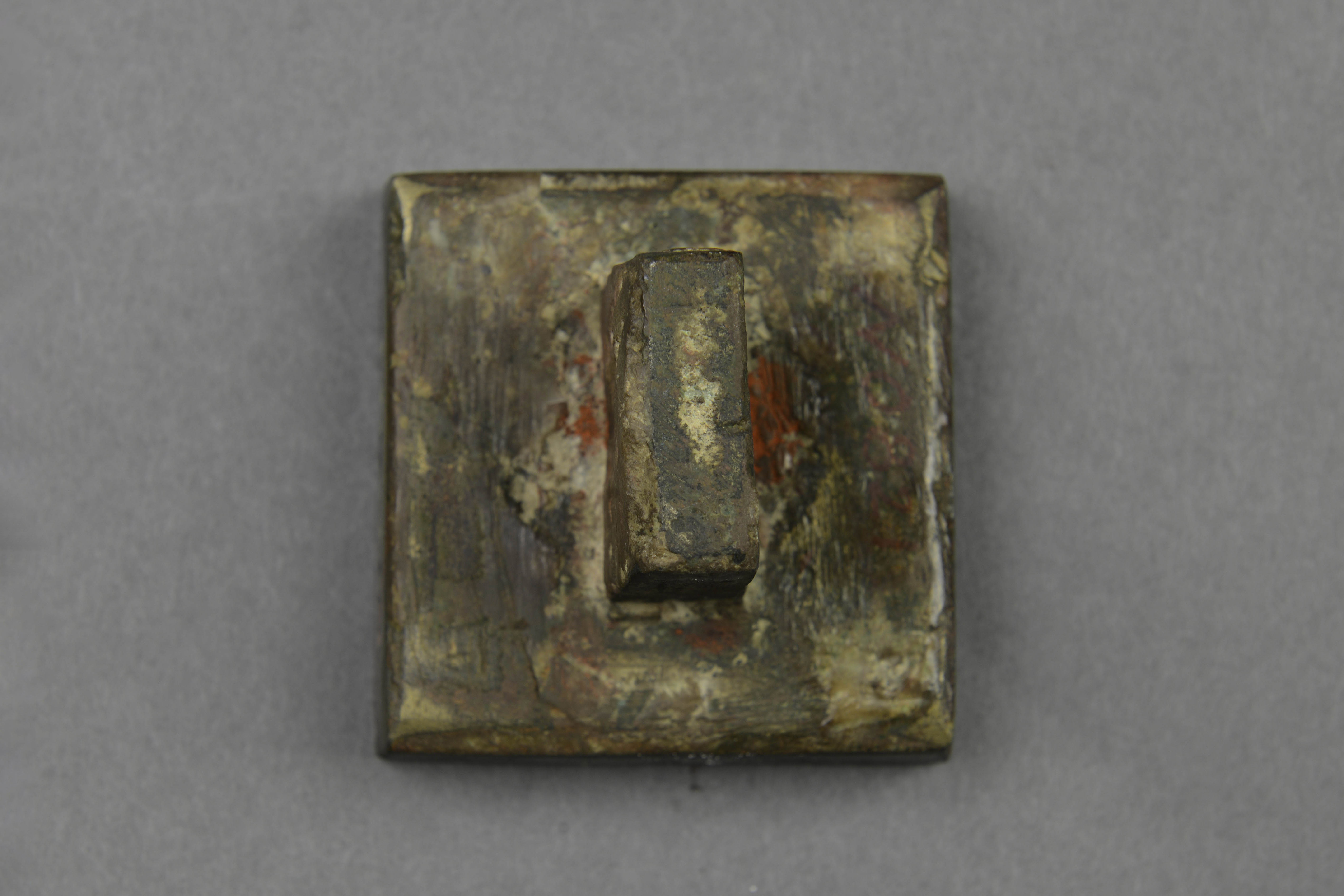 黄铜质,扁平方形钮。印面正方形,窄边框,刻阴文九叠篆体“都统之印”四字,印体左侧阴刻楷体释文“都统印”三字。