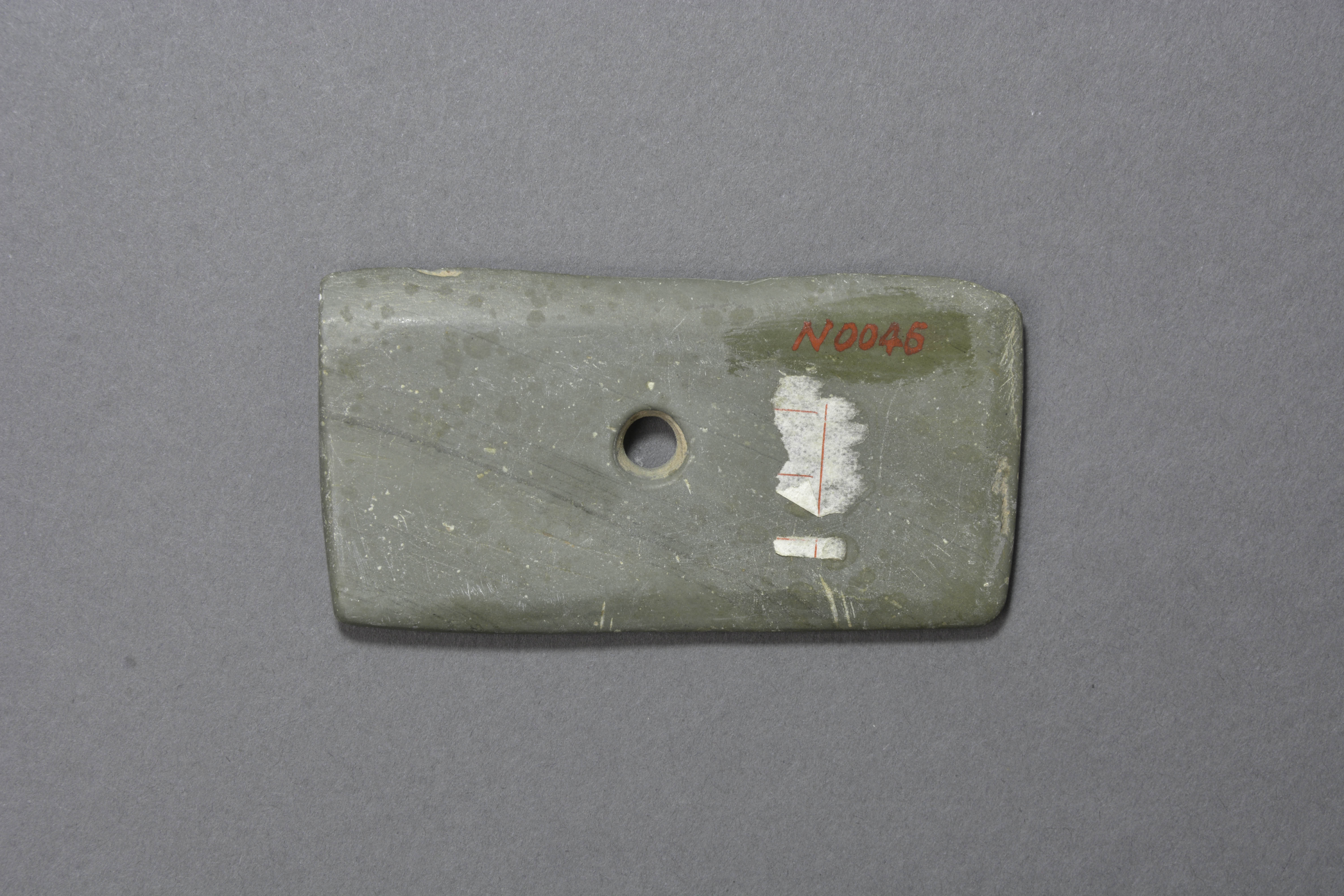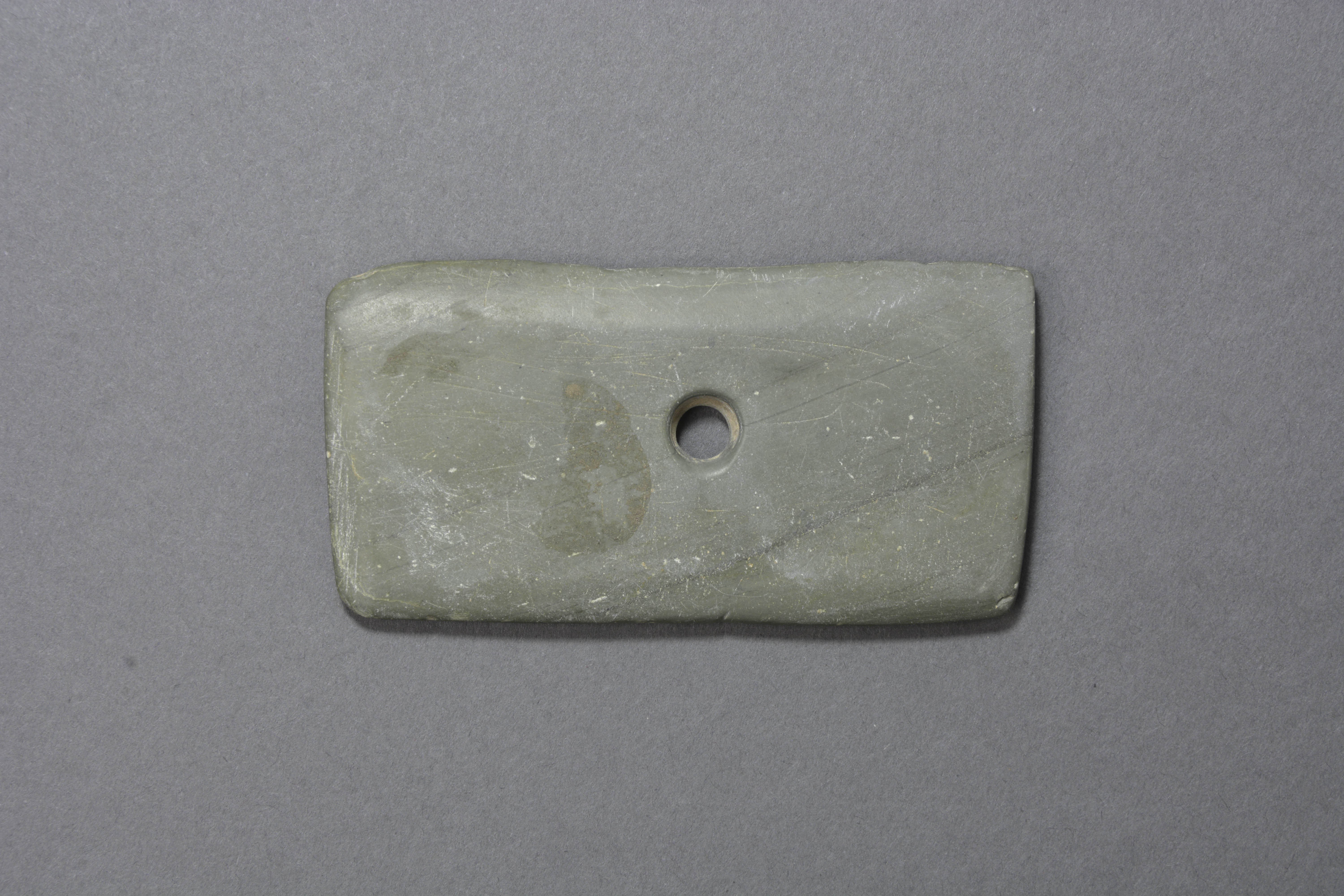 长方形,刃部打磨,较钝,中部釉一圆形穿。