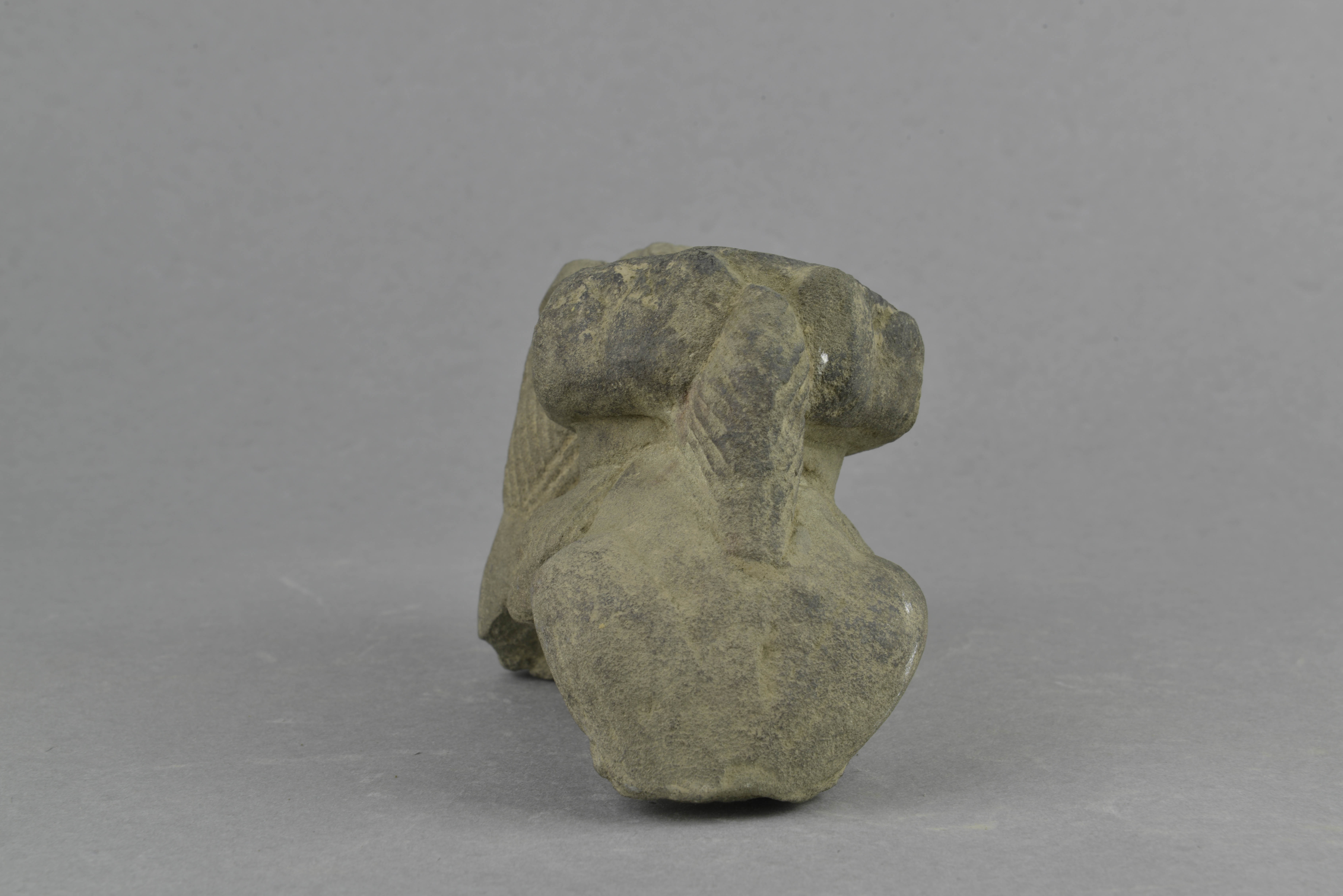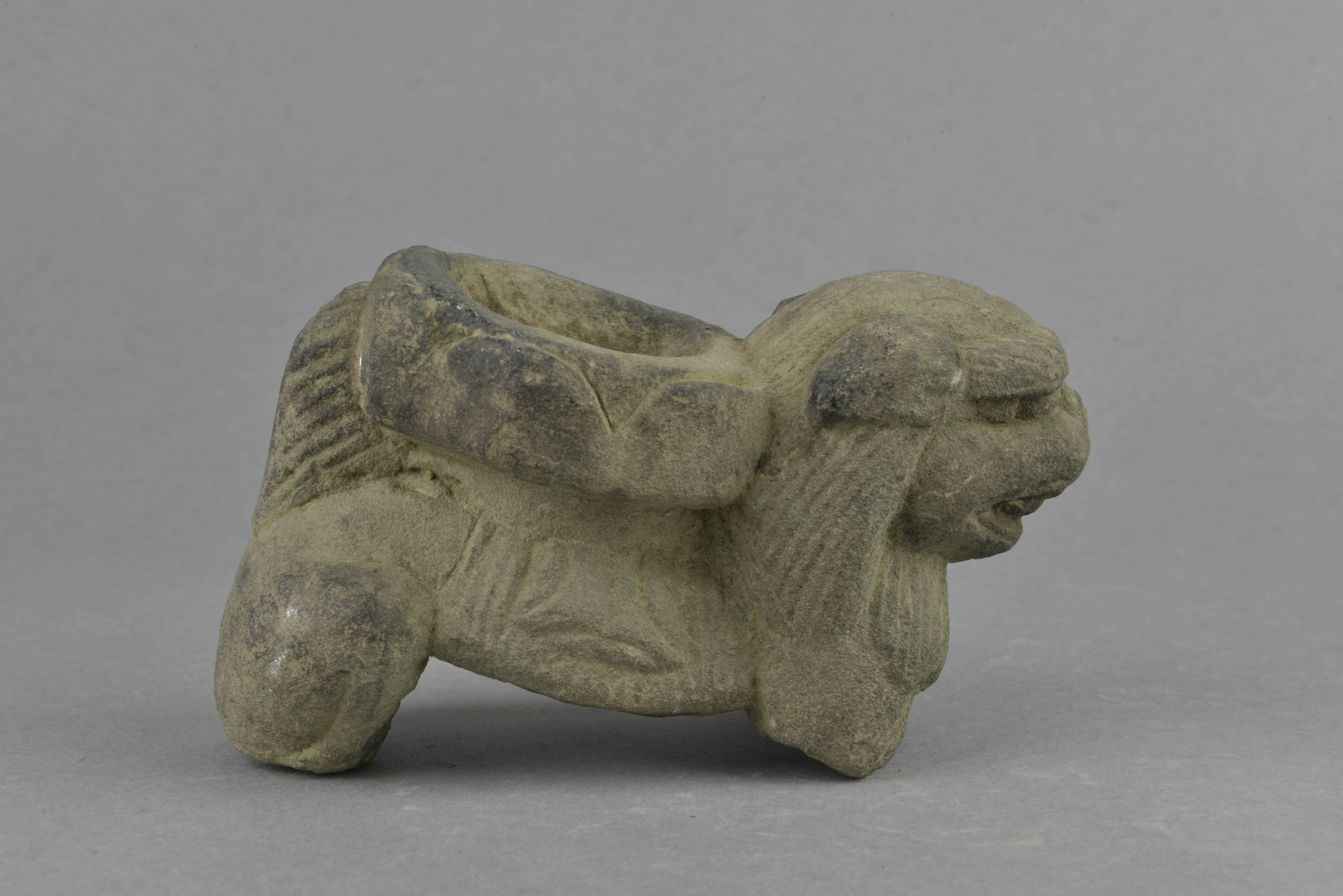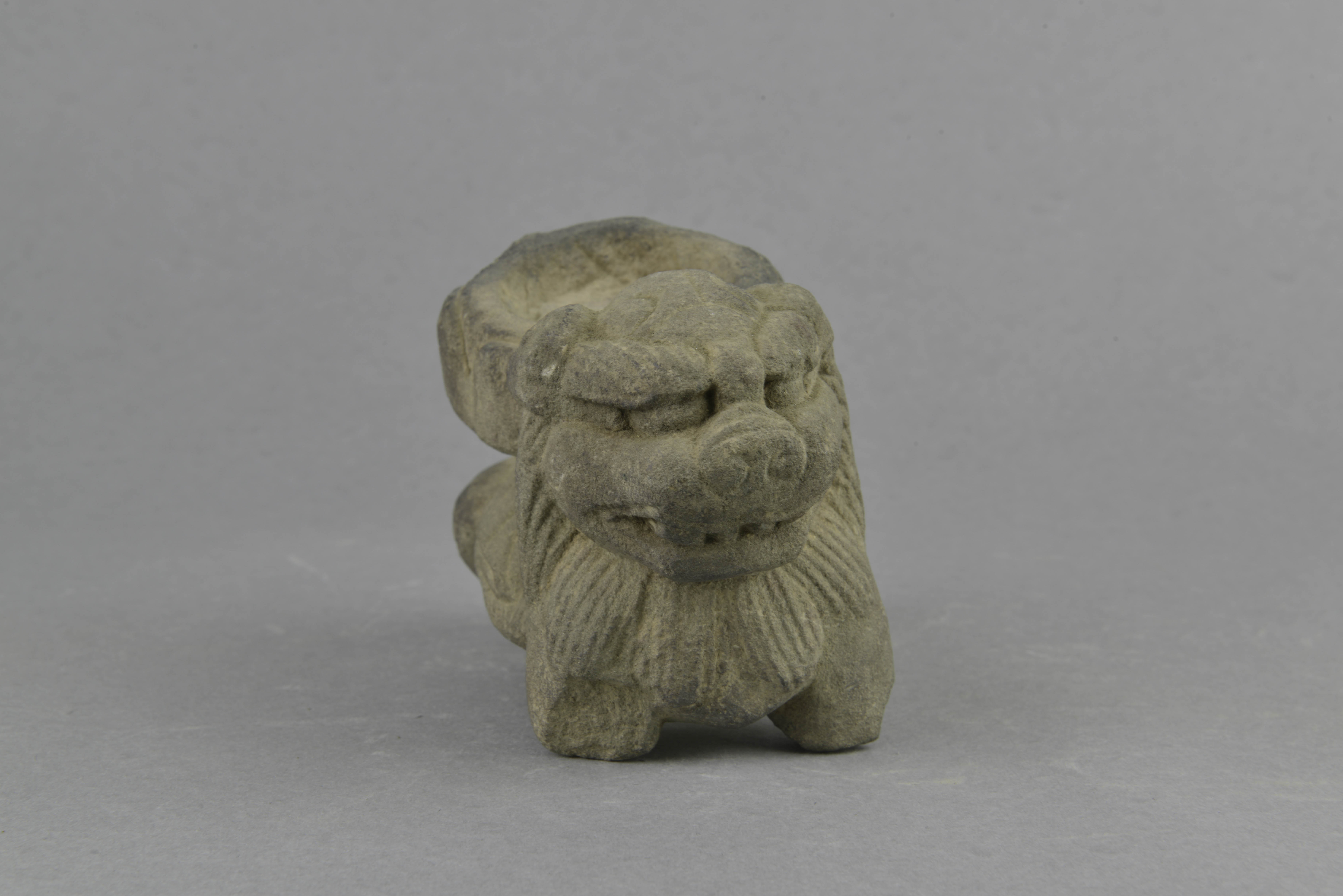 青砂石,狮子昂首,浓眉圆目,翘鼻张口,四肢强健,背部有一鞍垫,鞍垫上置一仰莲形台,狮尾上卷,与莲台口沿相接。
