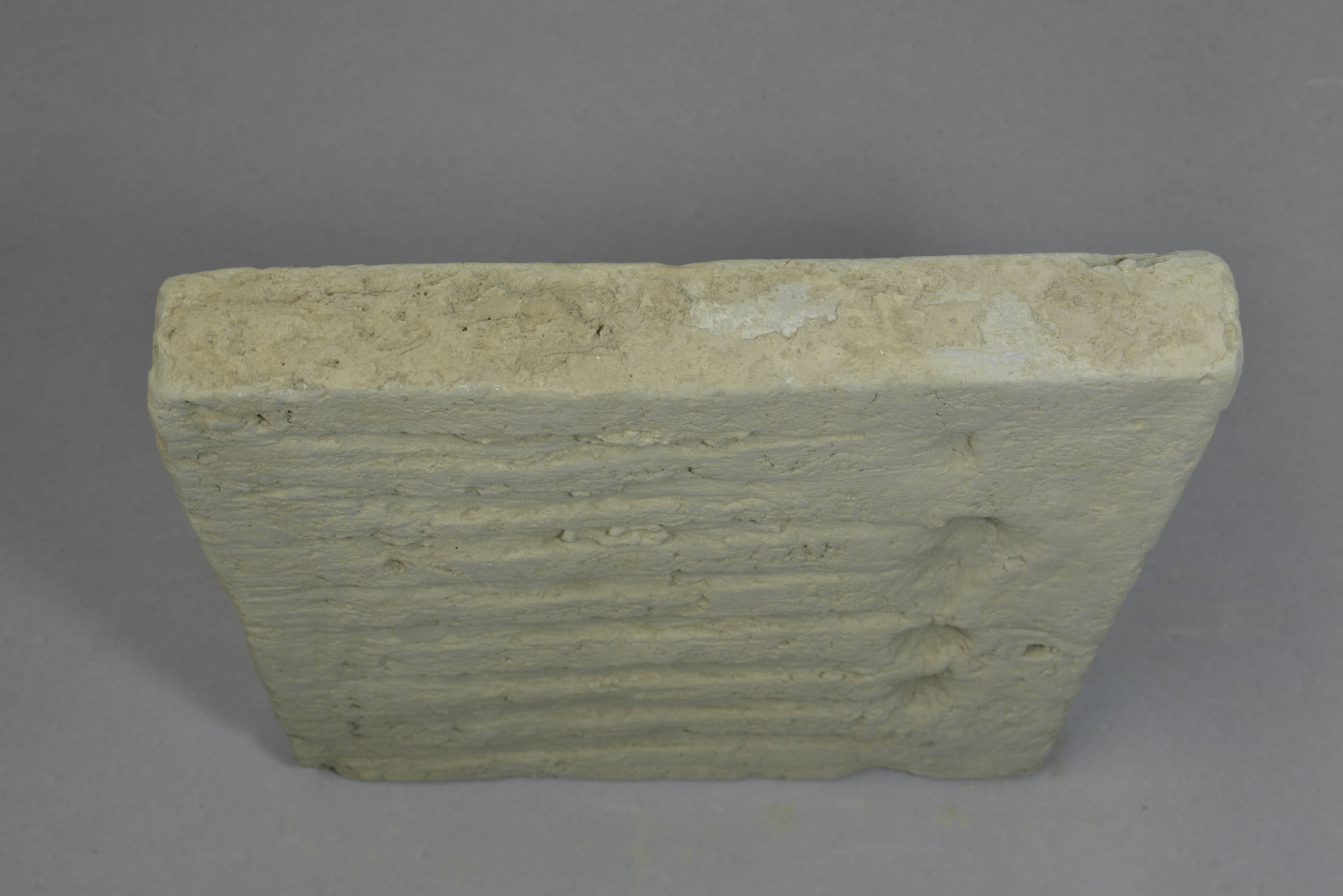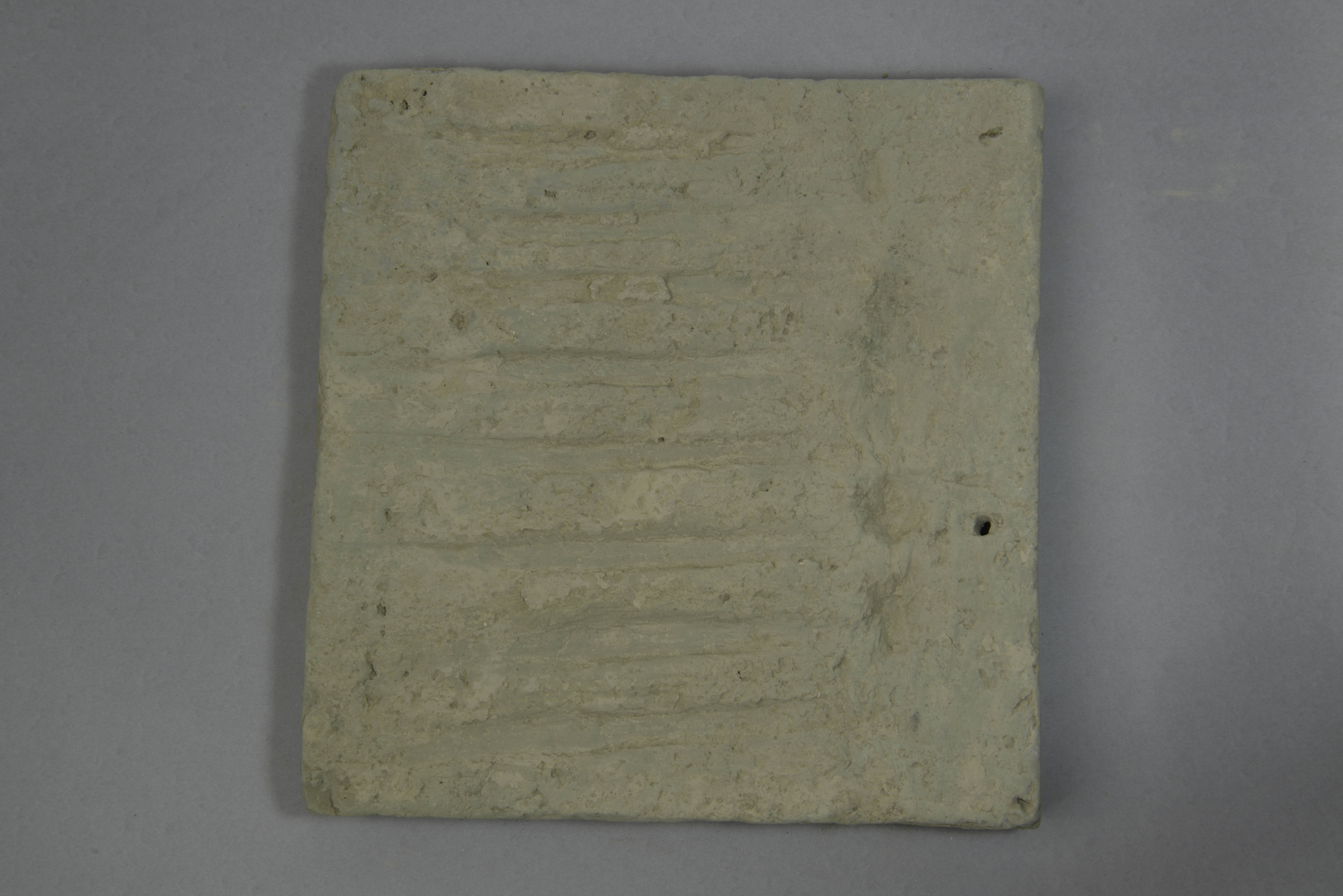 泥质陶。方形,一面有八条平行的抠划痕,一面平素。