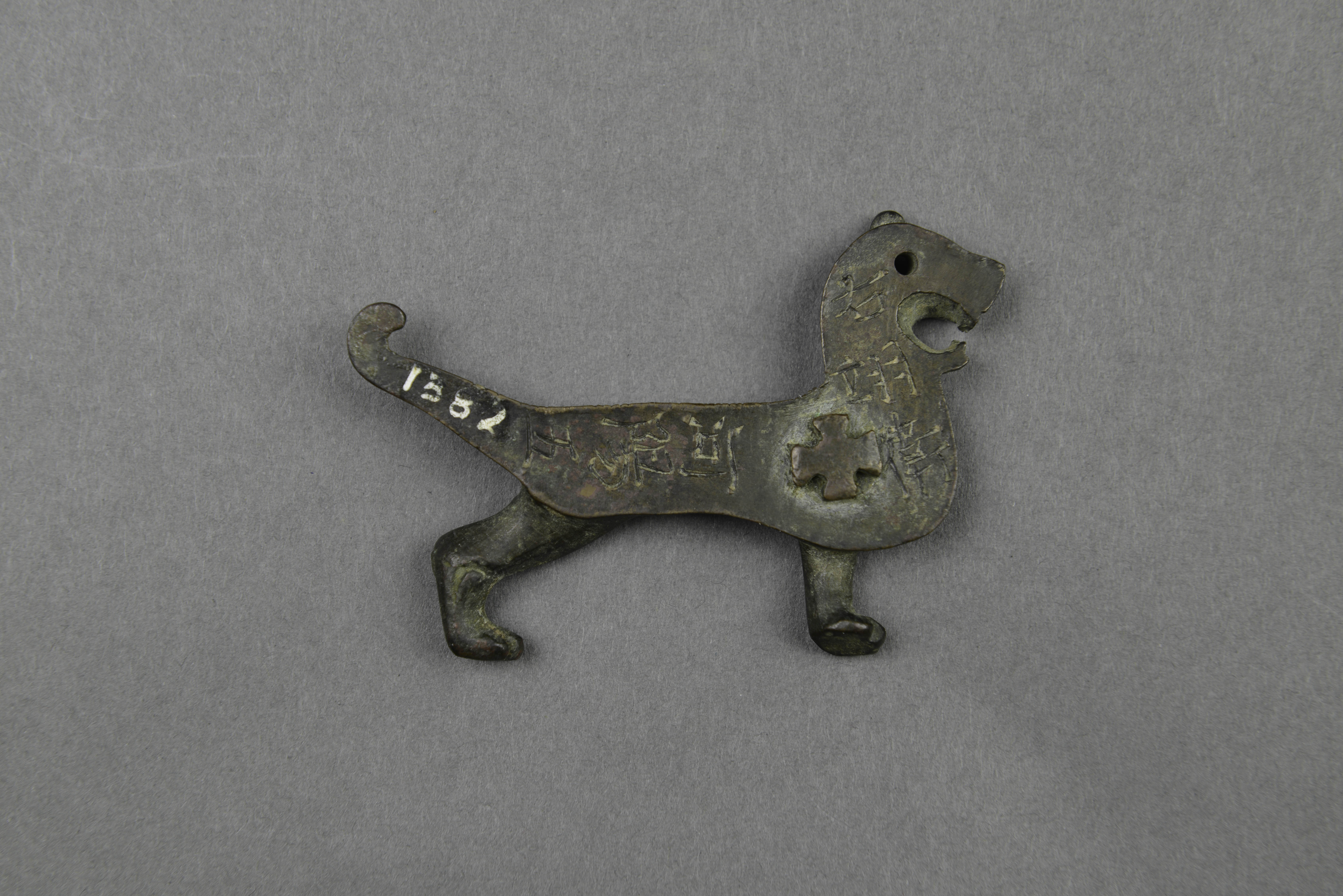 虎圆竖耳,怒目张口,挺胸昂首,尾上翘,作奔走状。符头部有圆穿孔,背面有凸起的十字扣。符身正面阴刻篆书“河阳府”字样;背面阴刻楷书“右翊卫”“河阳五”字样,虎背阴刻篆书“右翊卫铜虎符五”字样,字为左半部。