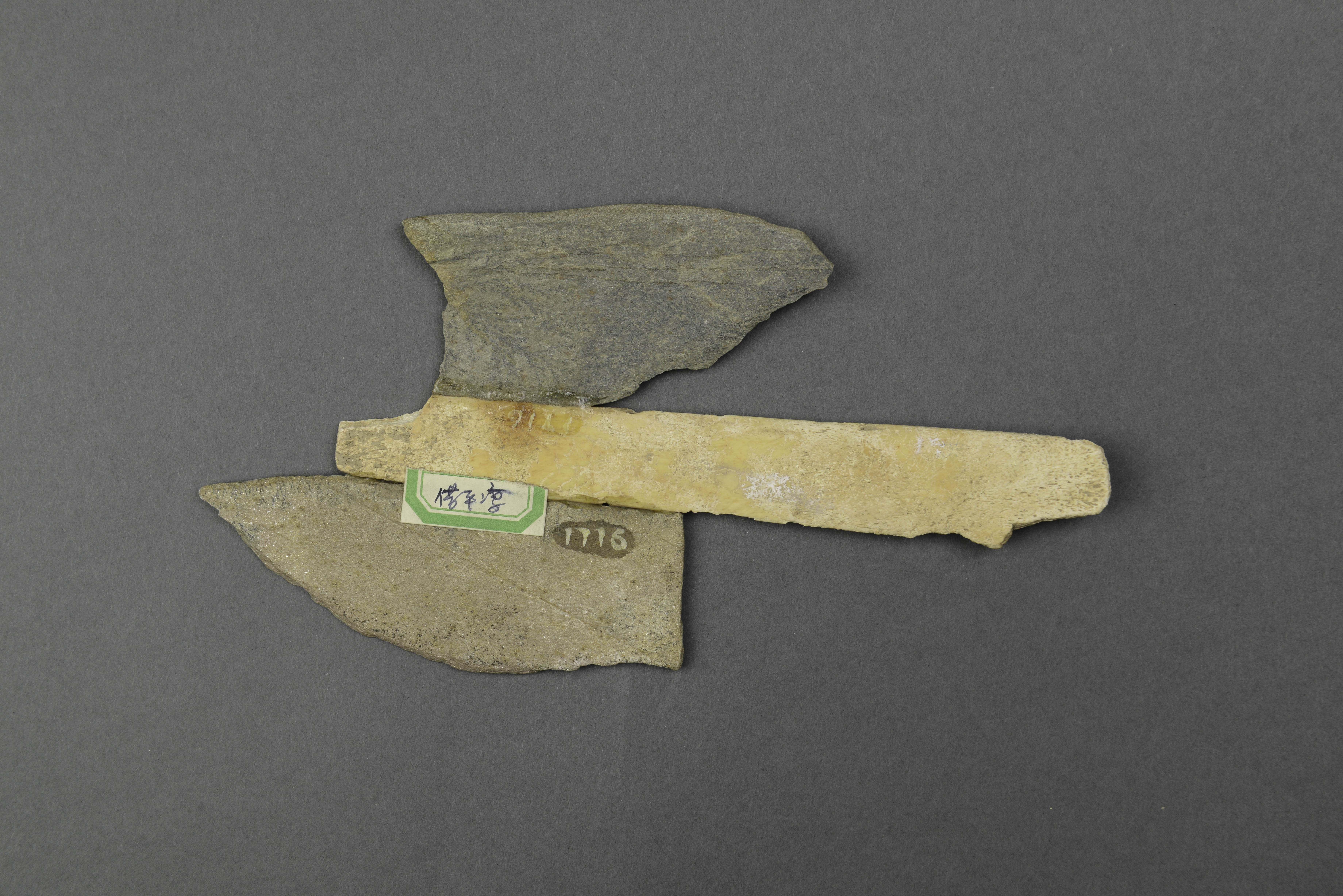 长条形骨柄,两侧各有一石刀,双面弧刃,另一刀残。