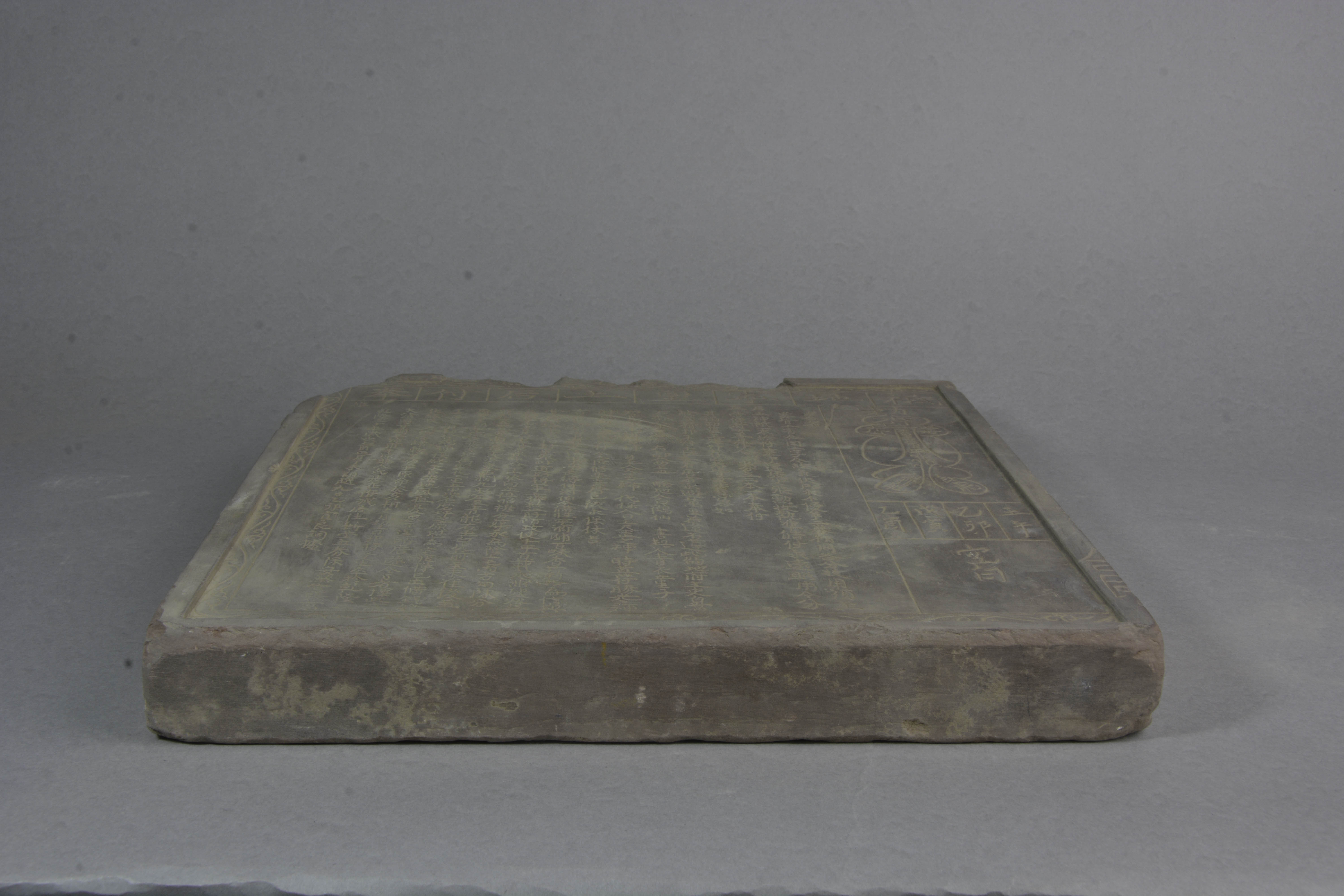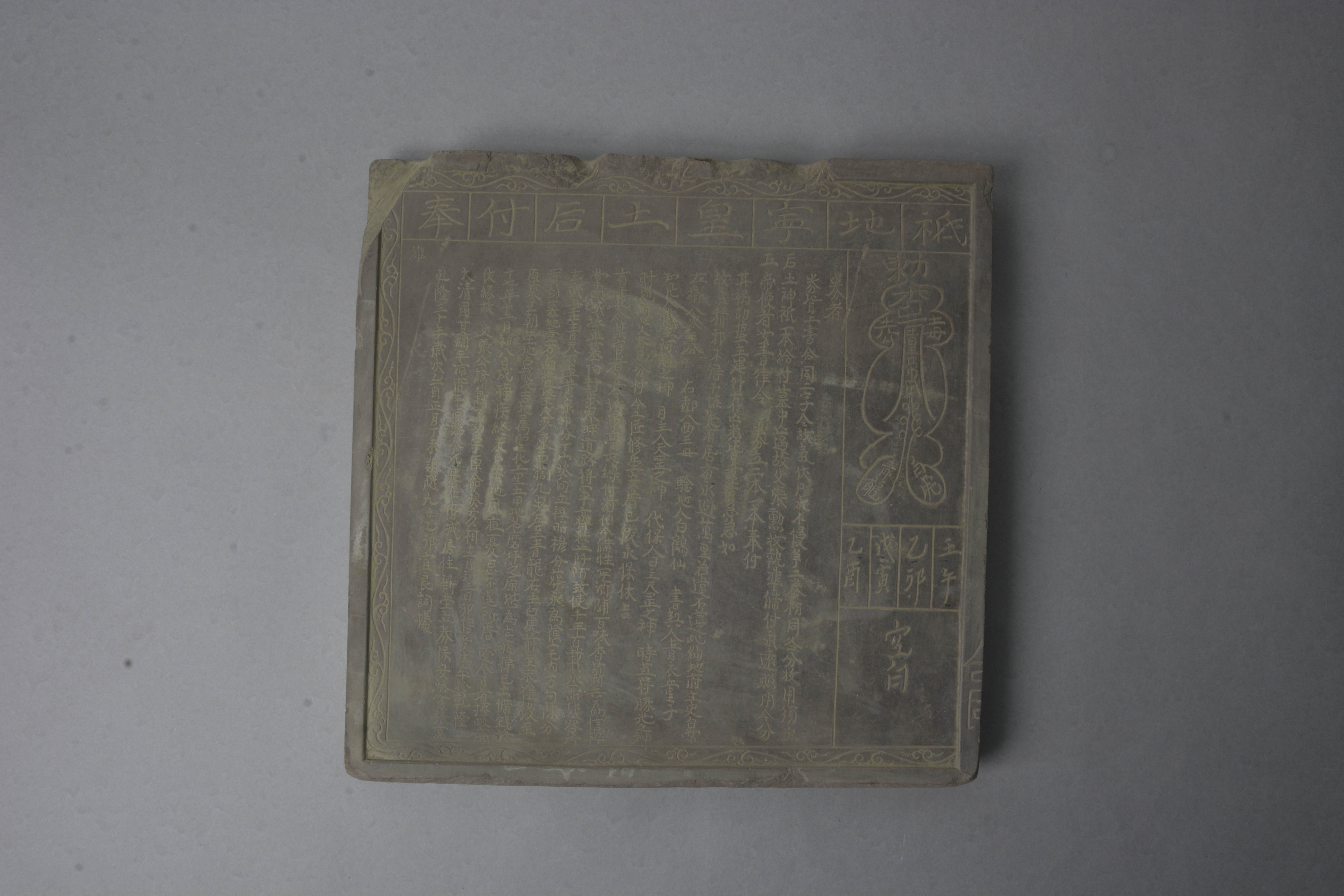 红褐色细砂岩质。平面呈正方形,正面刻凸起的边框,右侧边框下端阴刻半字“合同”二字。框内上下三边阴刻卷枝纹;顶部阴刻“祗地宁皇土后付奉”八字;右侧上端刻一符,其下刻“壬午乙卯戊寅乙酉”八干支,再下刻“空白”二字;左侧阴刻小子400余字,纪茔地四至及立券经过,后落乾隆三十年款。背面及四周平素。