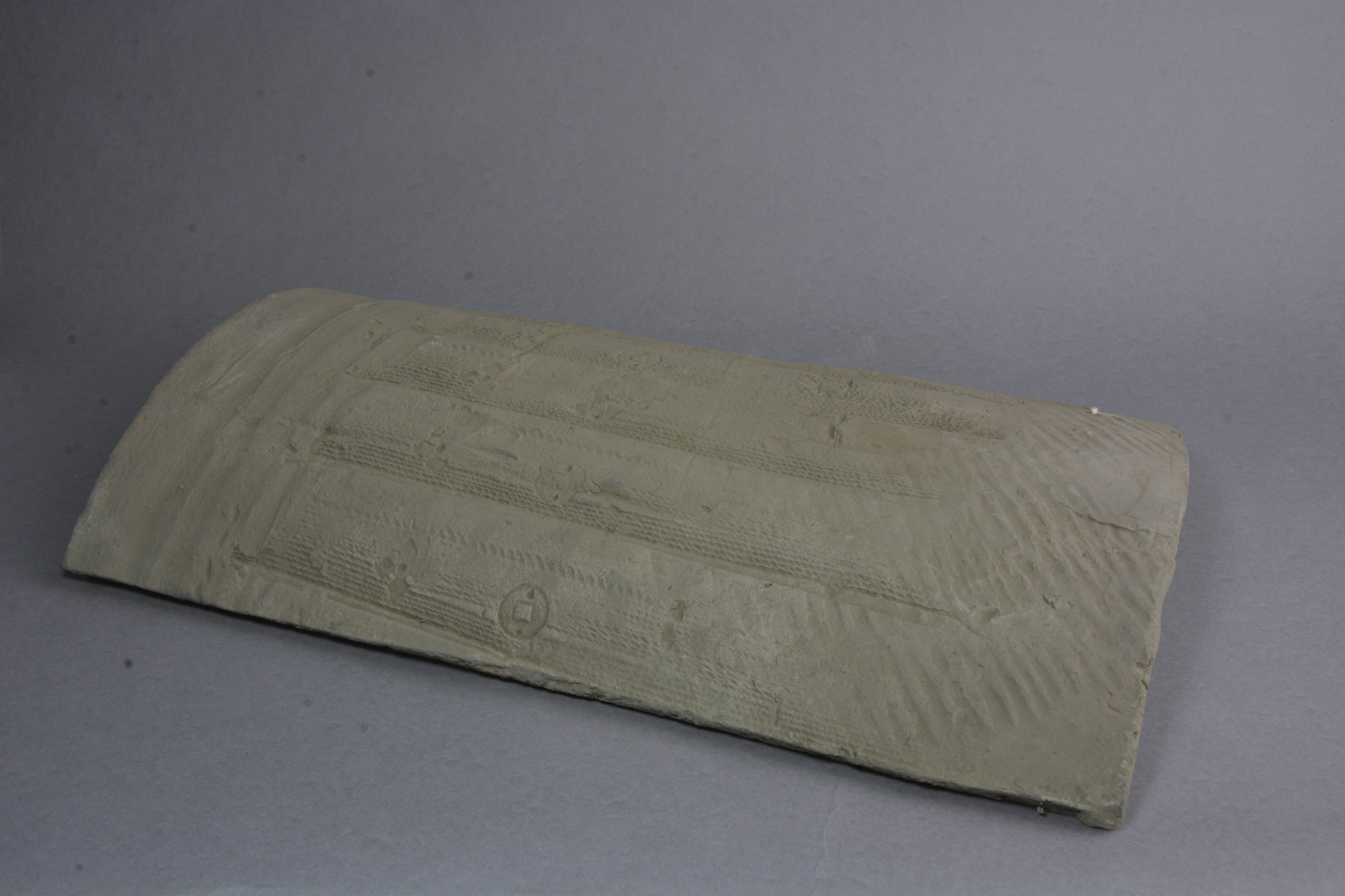 泥质灰陶。横截面呈弧形,一端稍窄。外表面饰绳纹,兼饰六个四叶纹及六个货泉印纹,瓦内面满饰布纹。