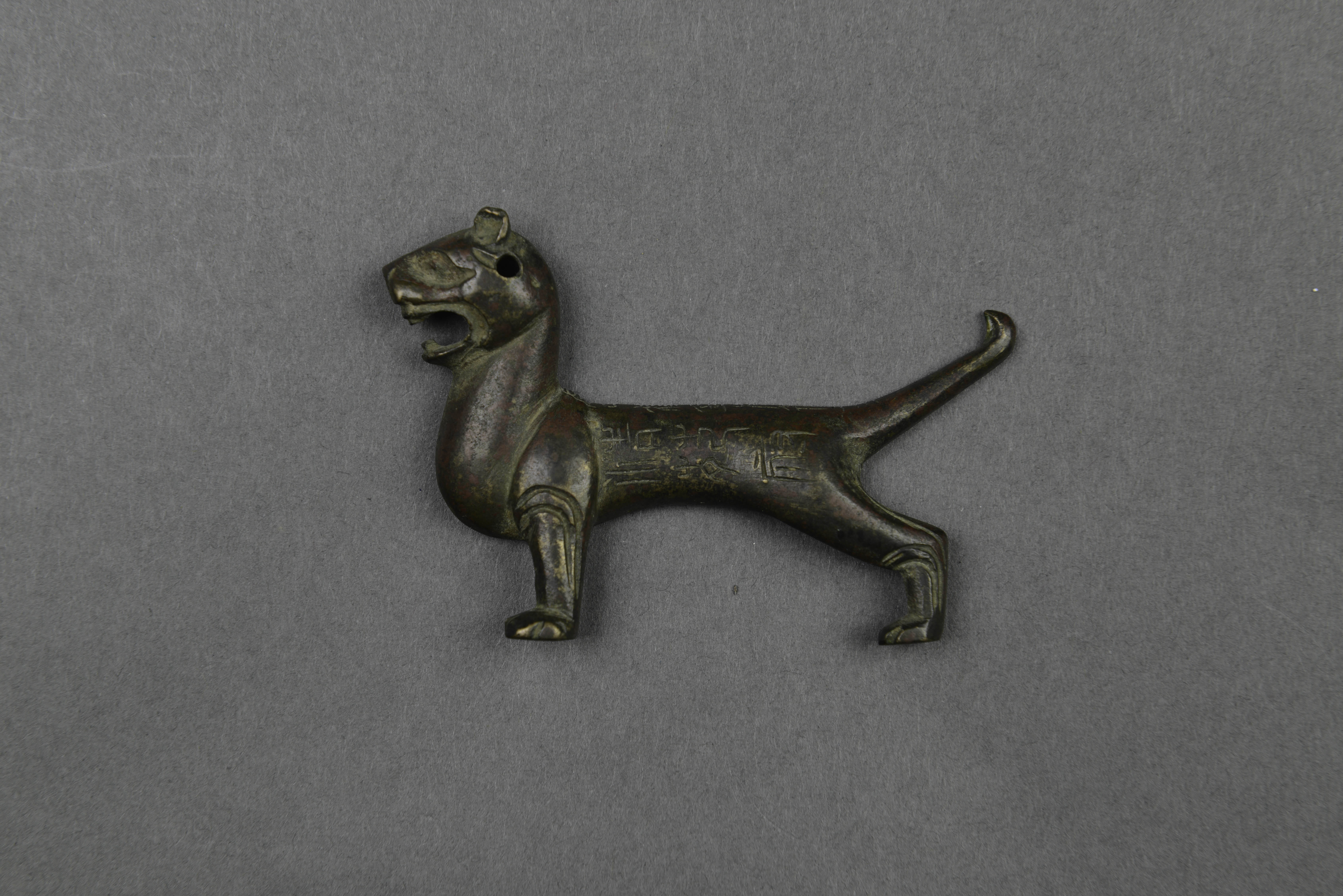 虎圆竖耳,怒目张口,挺胸昂首,尾上翘,作奔走状。符头部有圆穿孔,背面有凸起的十字扣。符身正面阴刻篆书“清苑府”字样;背面阴刻楷书“左屯卫”“清苑三”字样,虎背阴刻篆书“左屯卫铜虎符三”字样,字为左半部。