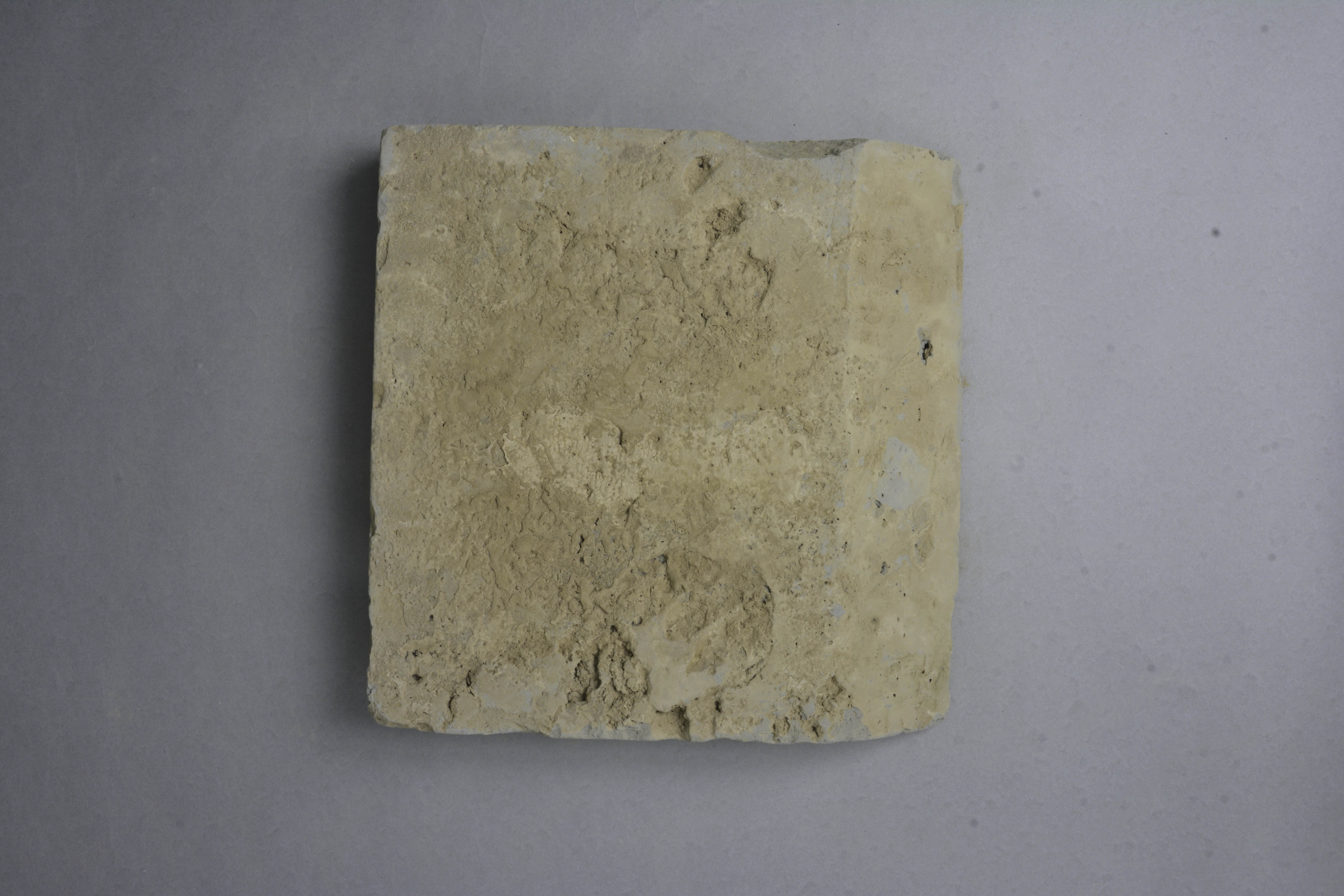 泥质陶。方形,一侧切去成楔状,正面开云头方窗,内浮雕一株盛开的莲花,背面平素。