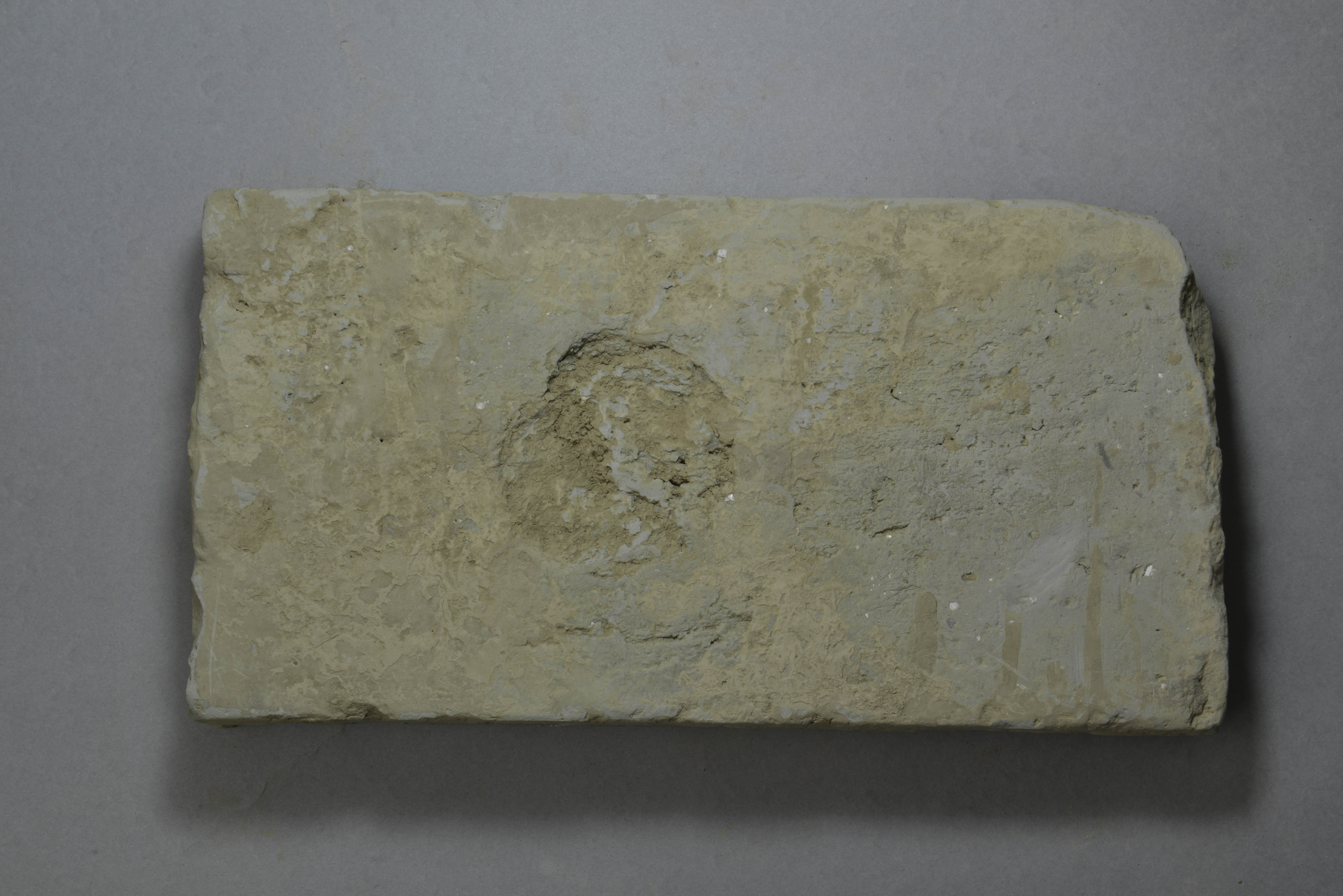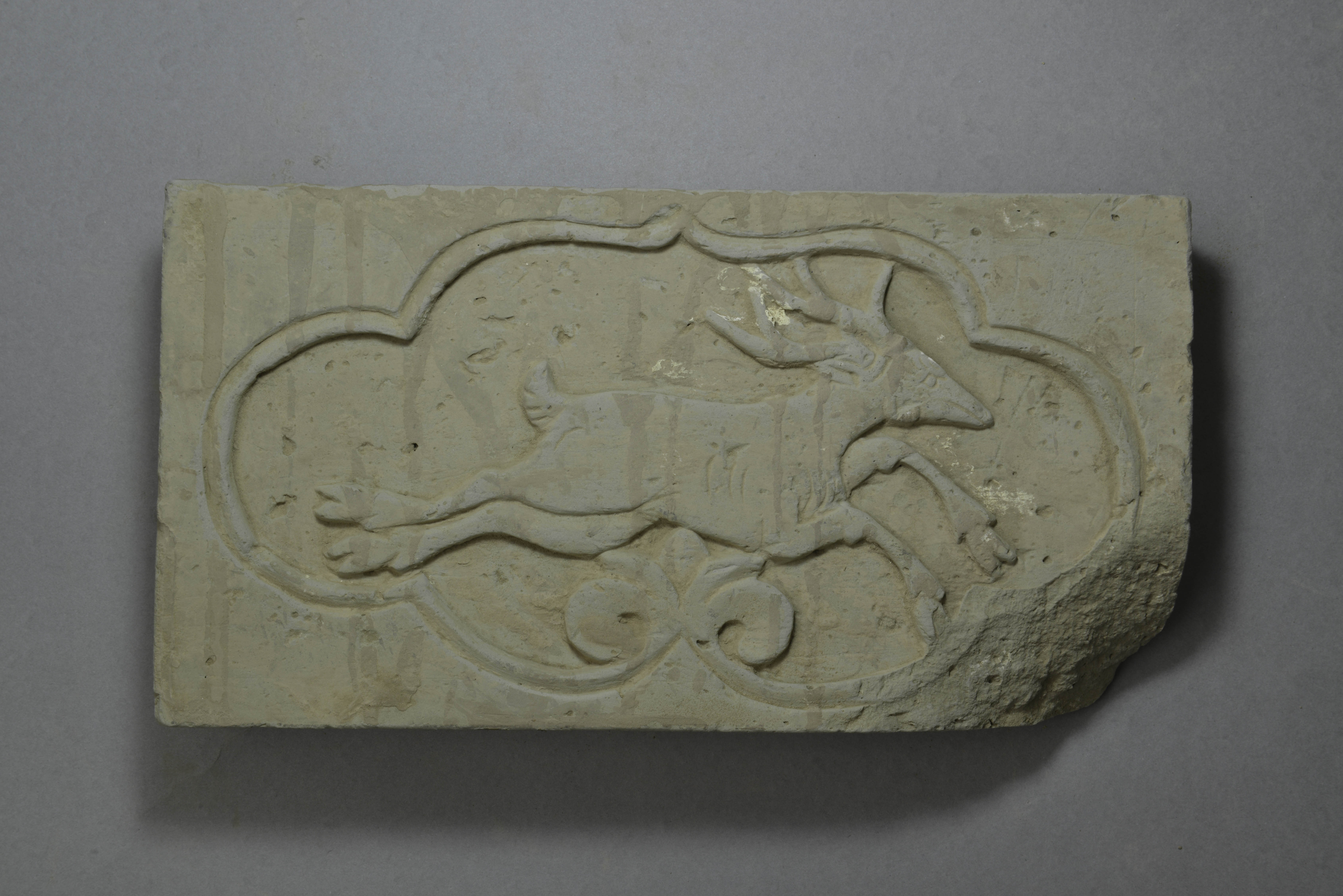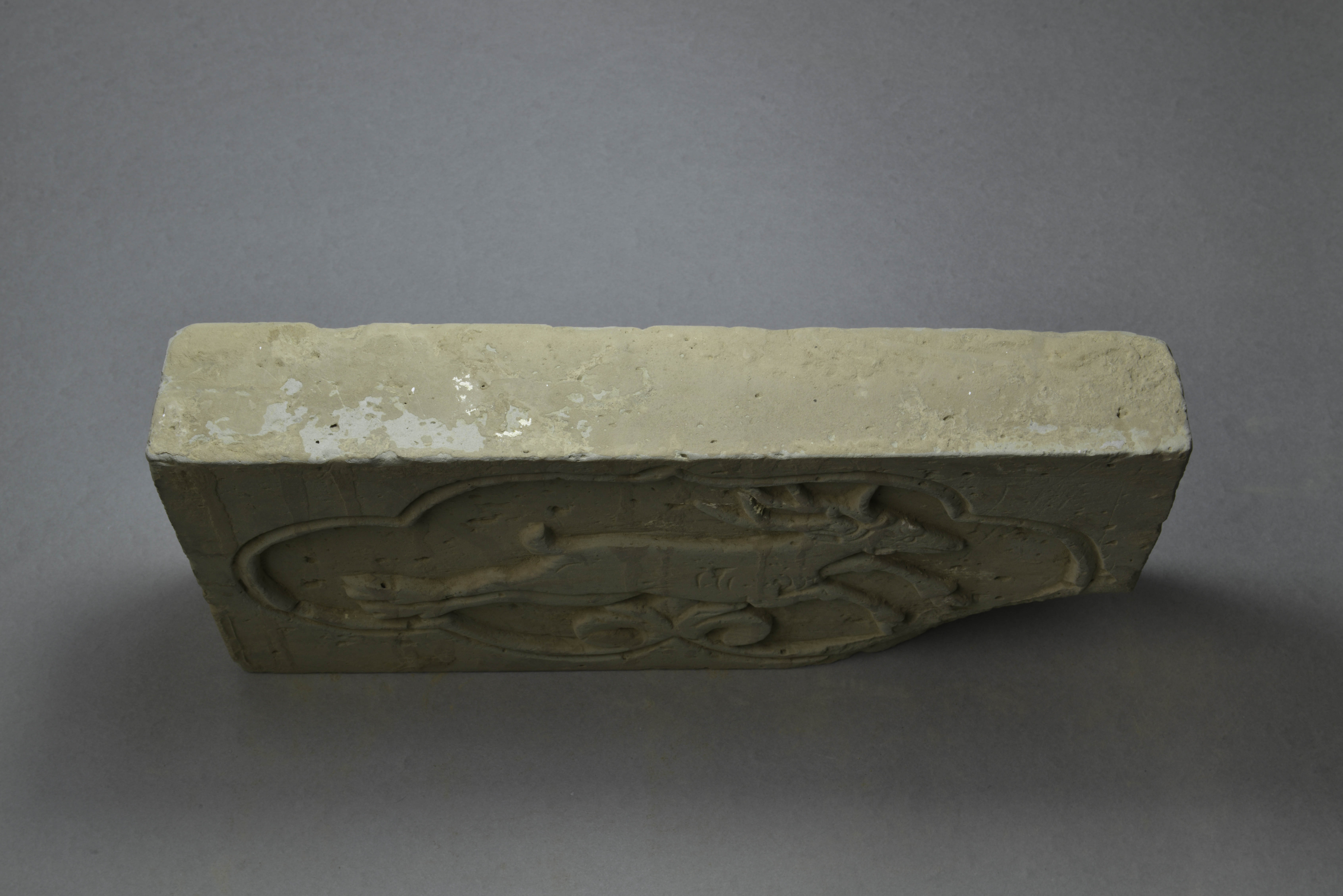 泥质陶。长方形,正面开如意云头窗,内浮雕一奔跑的鹿,背面平素。
