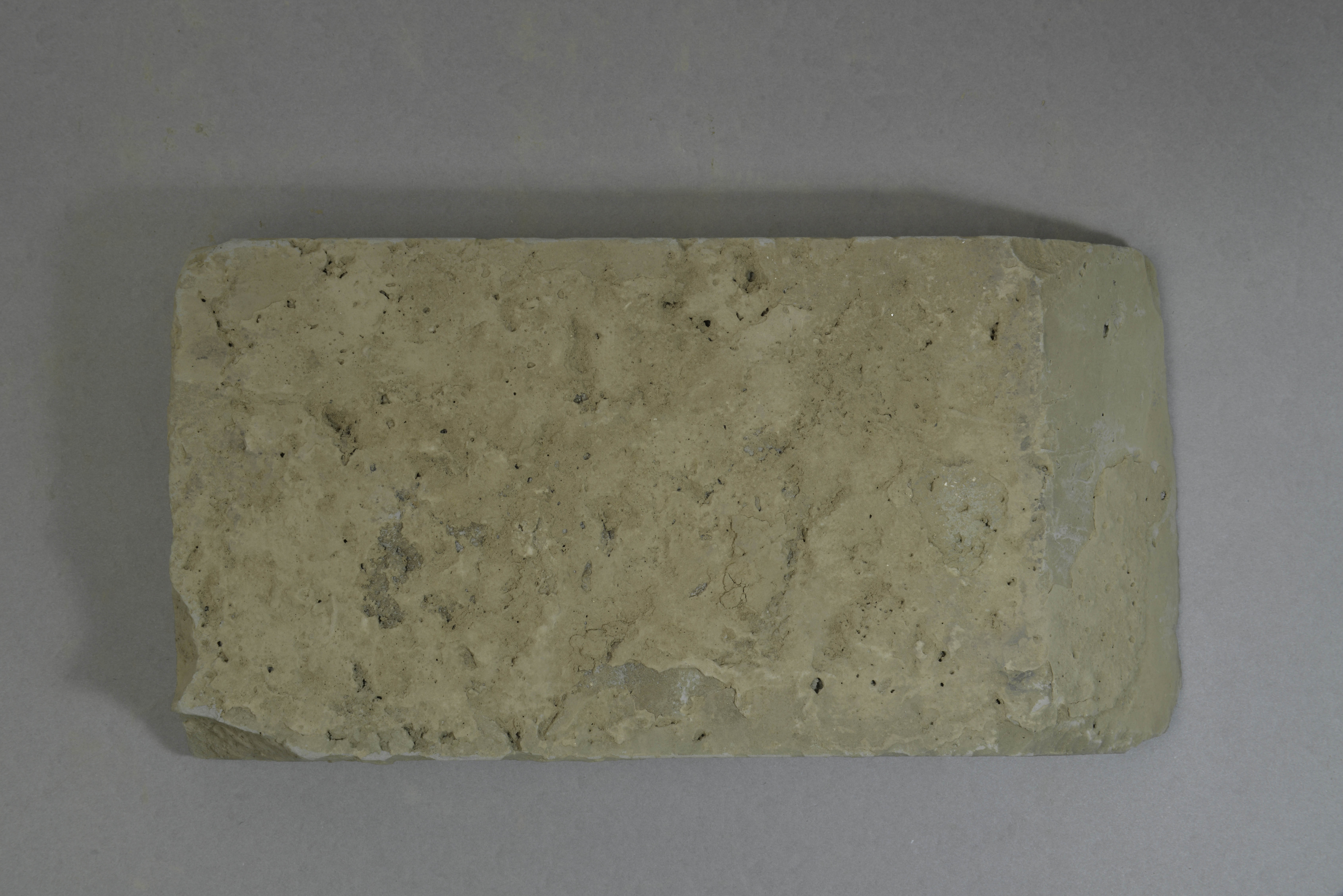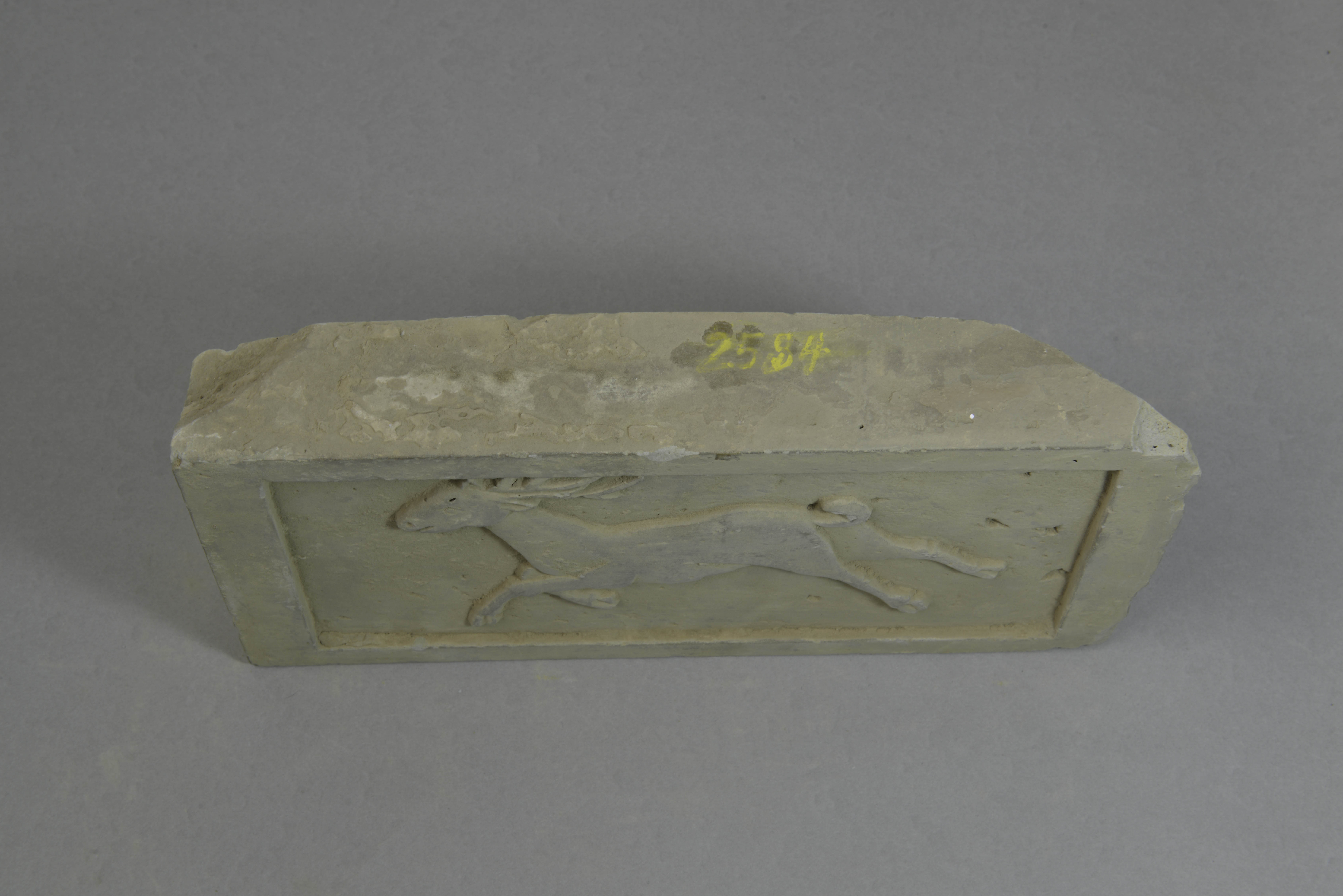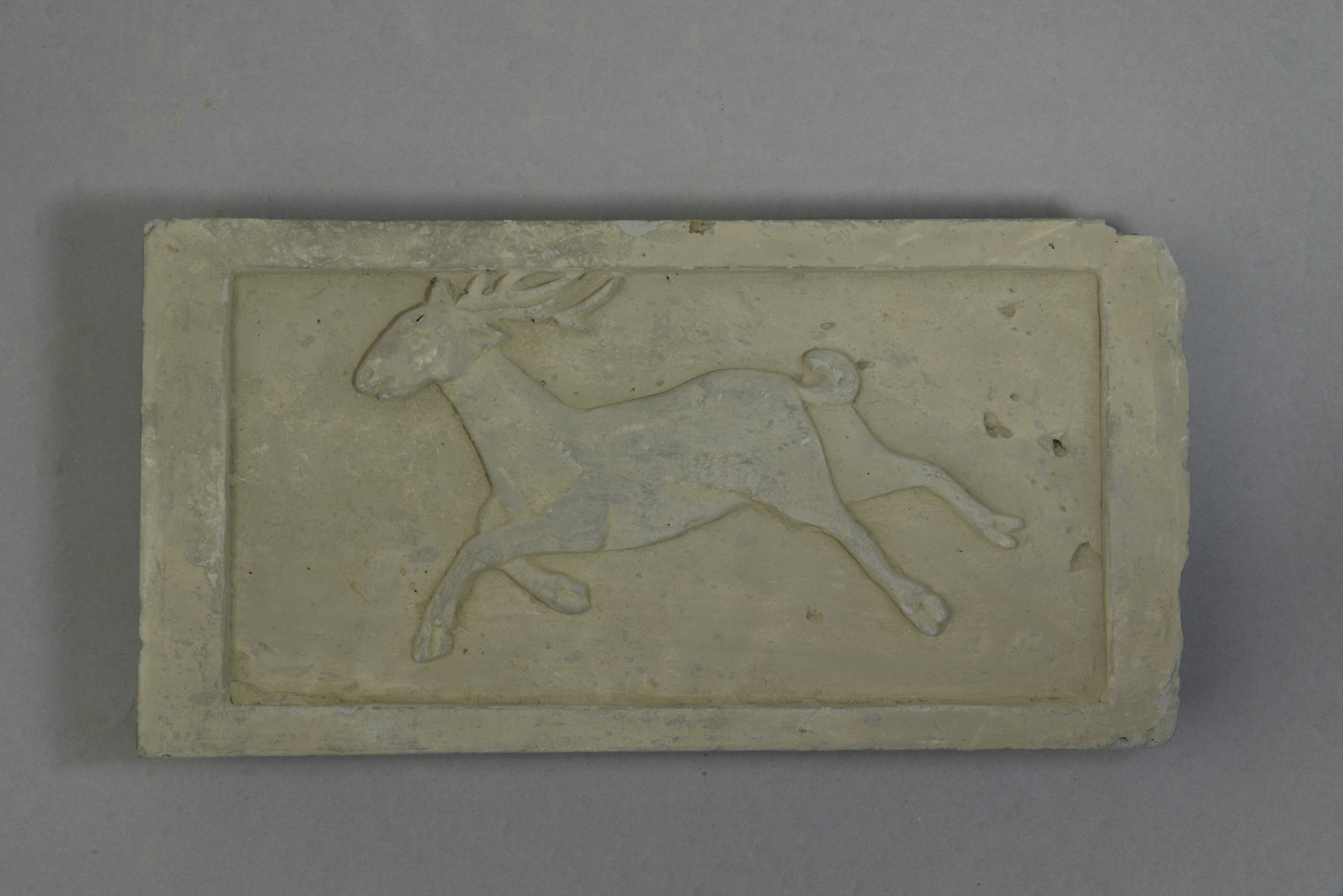 泥质陶。长方形,右侧切去成楔状,正面开方窗,内浮雕一奔跑的鹿,背面平素。