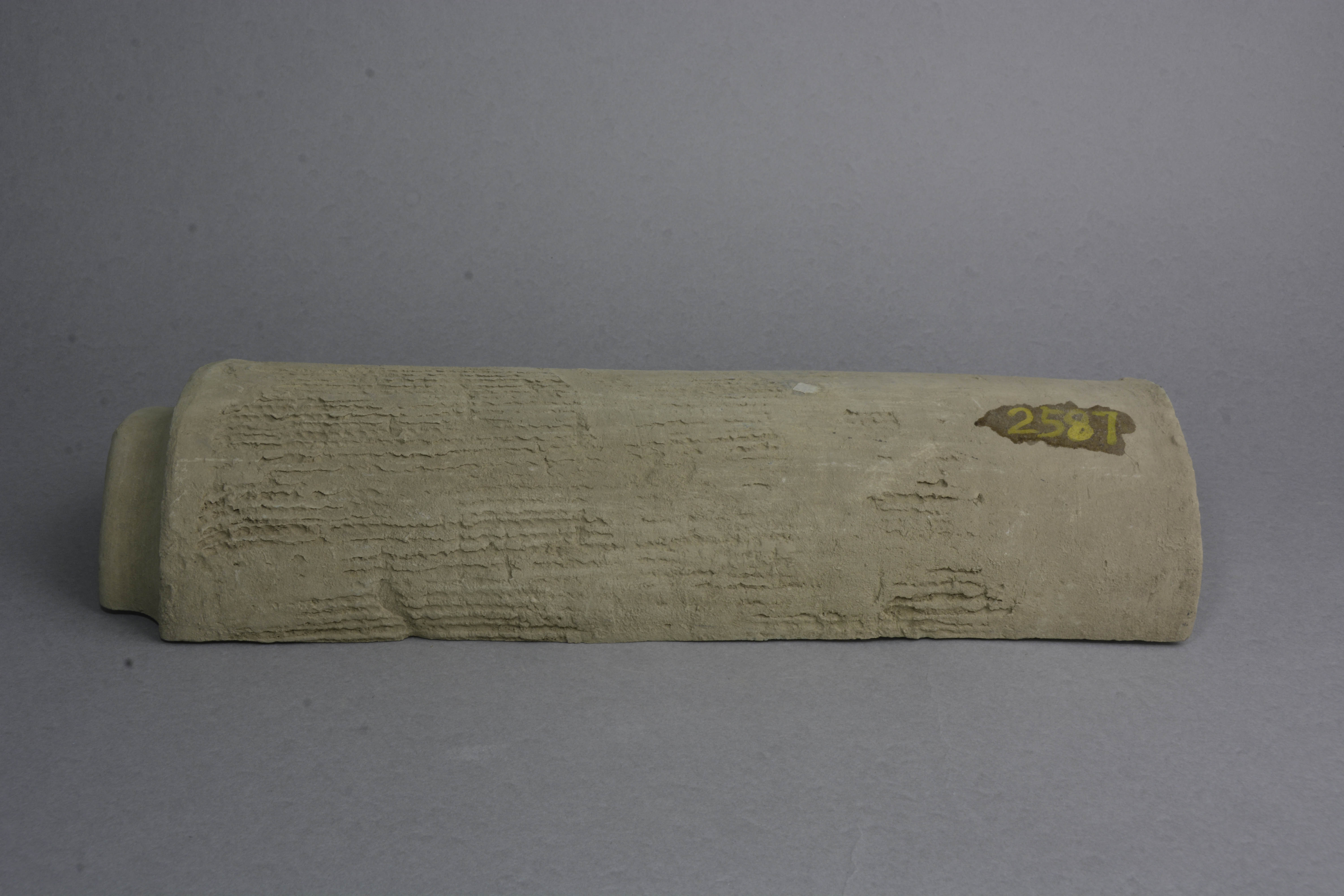 泥质灰陶。短颈,横断面呈半圆形,瓦背满饰盛纹。