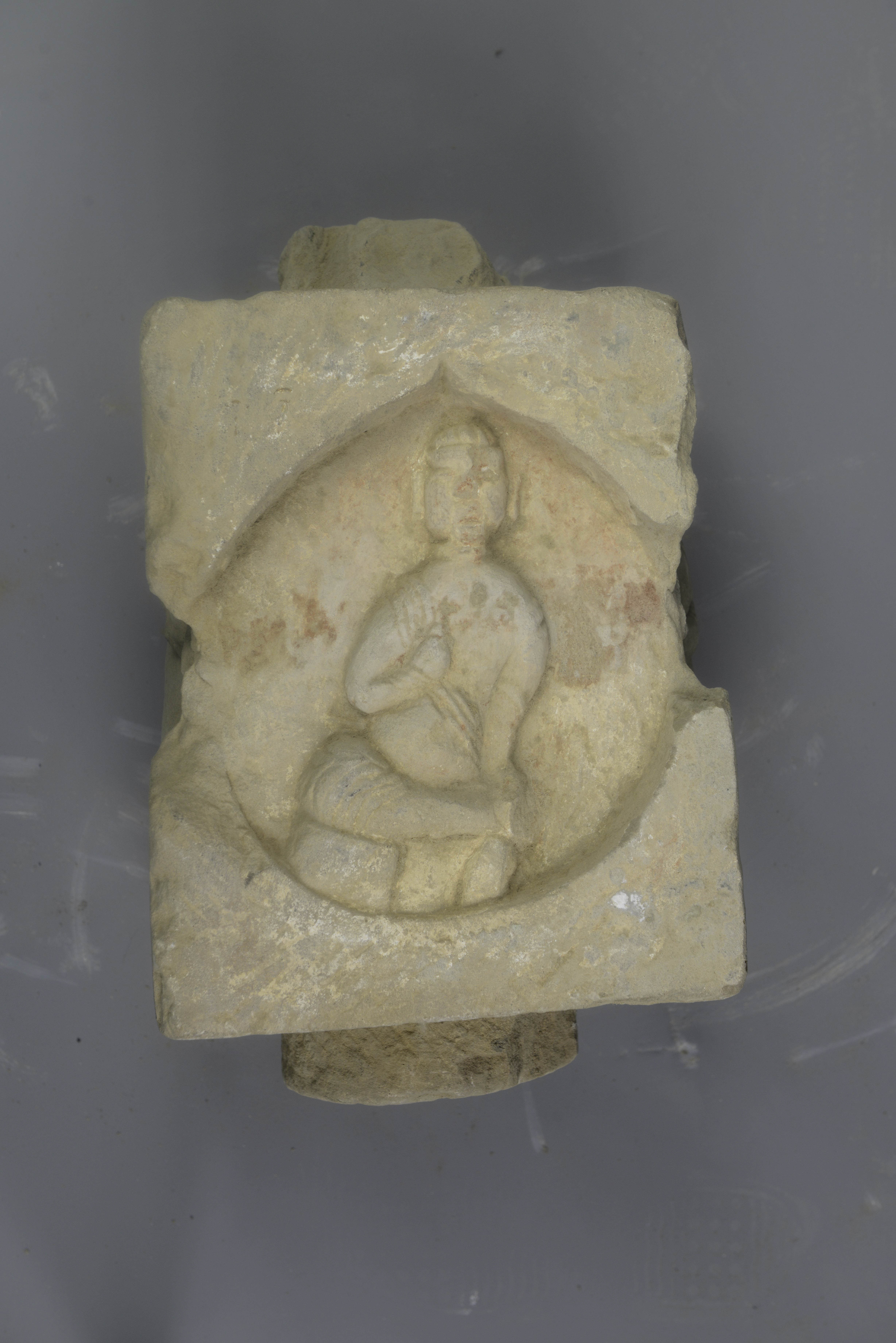 灰黄色细砂岩质。塔身作四面柱状,顶底部均有圆形榫,四壁开莲瓣形龛,正面龛内雕一坐佛,施与愿印,结跏趺坐,腰身歪斜,左右两龛均雕一佛二菩萨。佛双手合十作结跏趺坐,背面龛内雕一坐佛二菩萨,佛施与愿印。佛肉髻低平,面相丰圆,着袒左袈裟,具鲜明唐代造像风格。