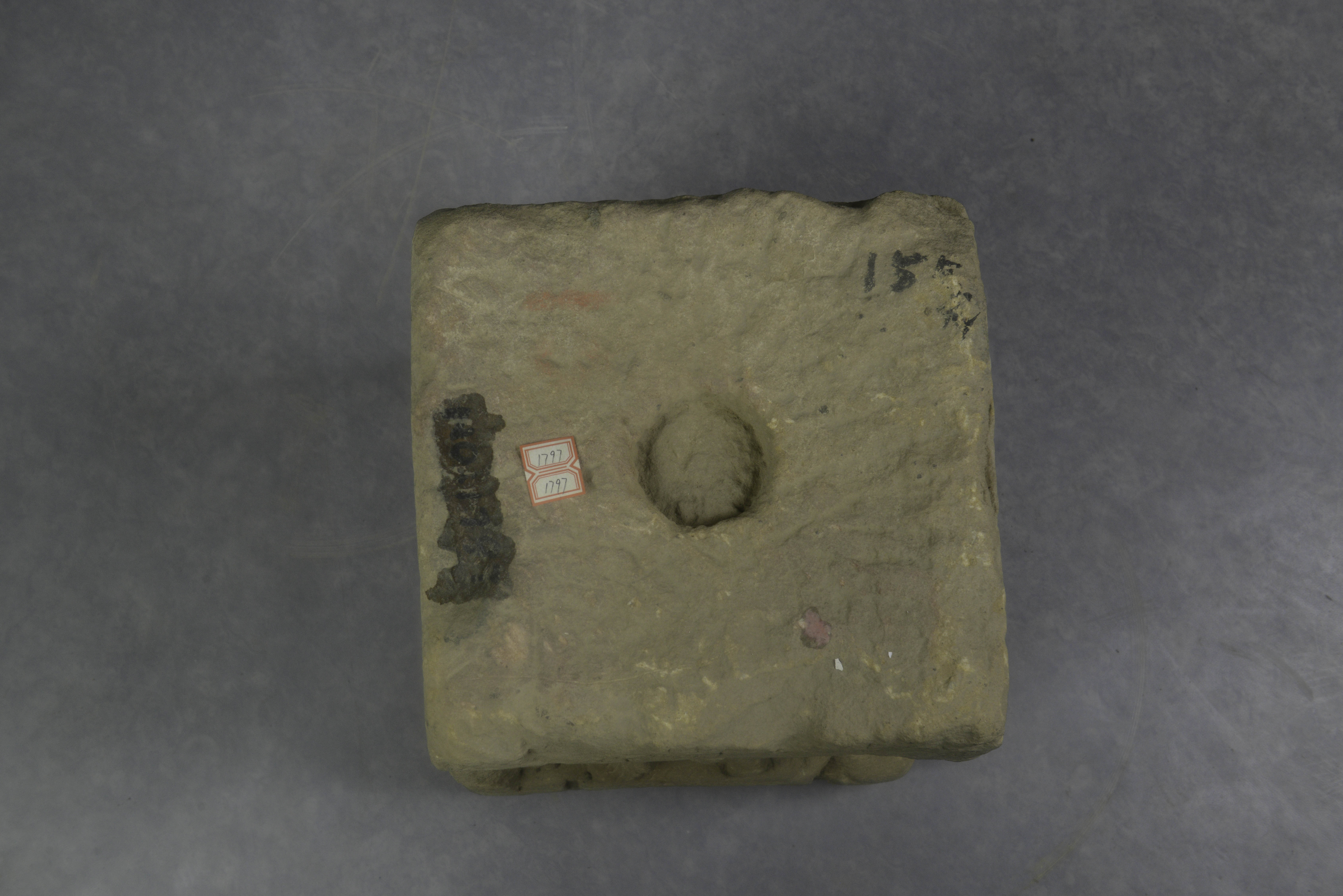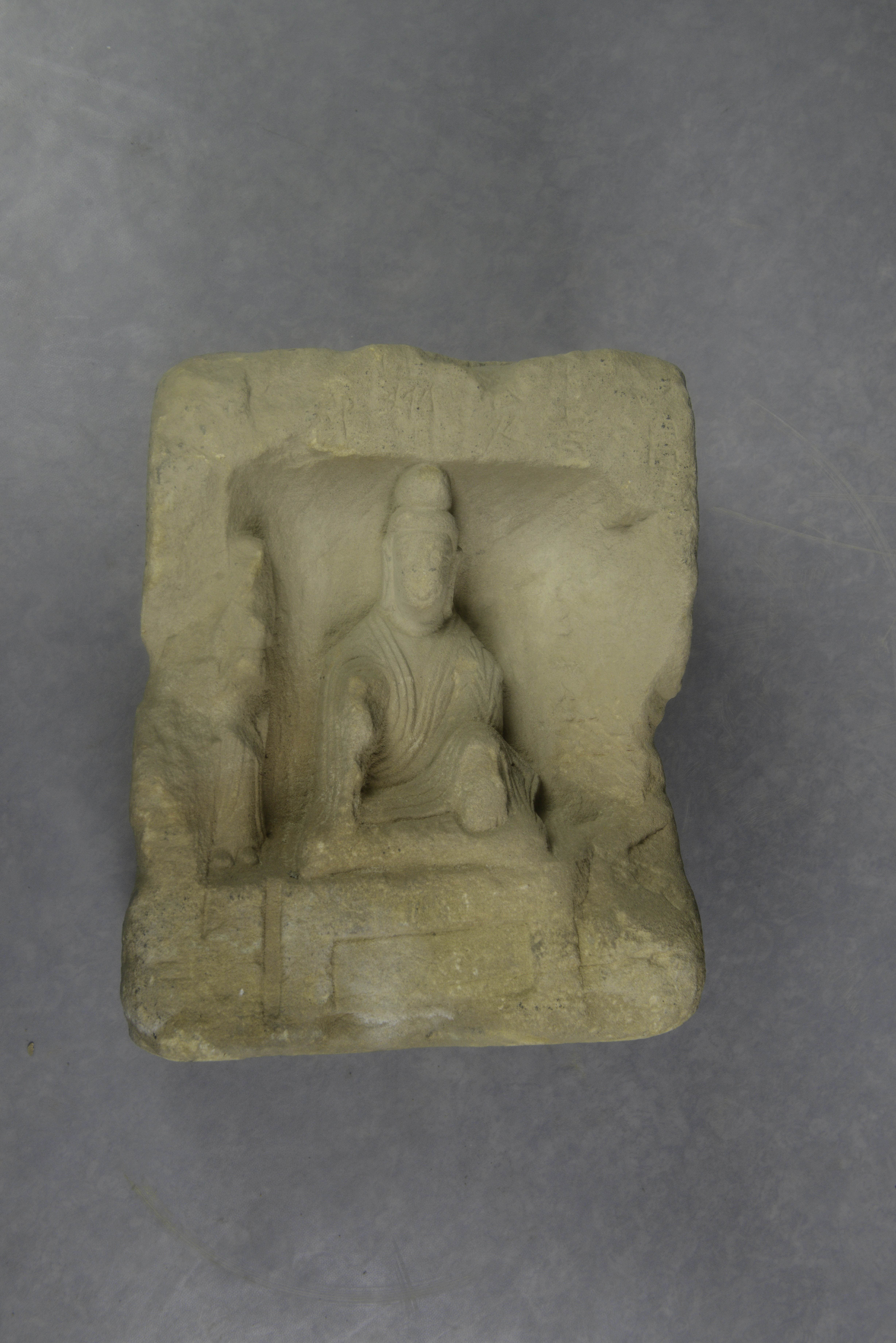 灰黄色砂岩质,塔身作上小下大四面柱状,顶部有圆形卯,四壁开方龛,均雕一坐佛二菩萨,佛高髻垂耳,眉眼细长,面相清癯,着通肩袈裟,衣褶细密,衣摆下掩,结跏趺坐,正面佛施与愿印,有四足床座,余均作禅定印,龛周有“延昌三年(514年)”刻记,风化严重,多漫漶不清。