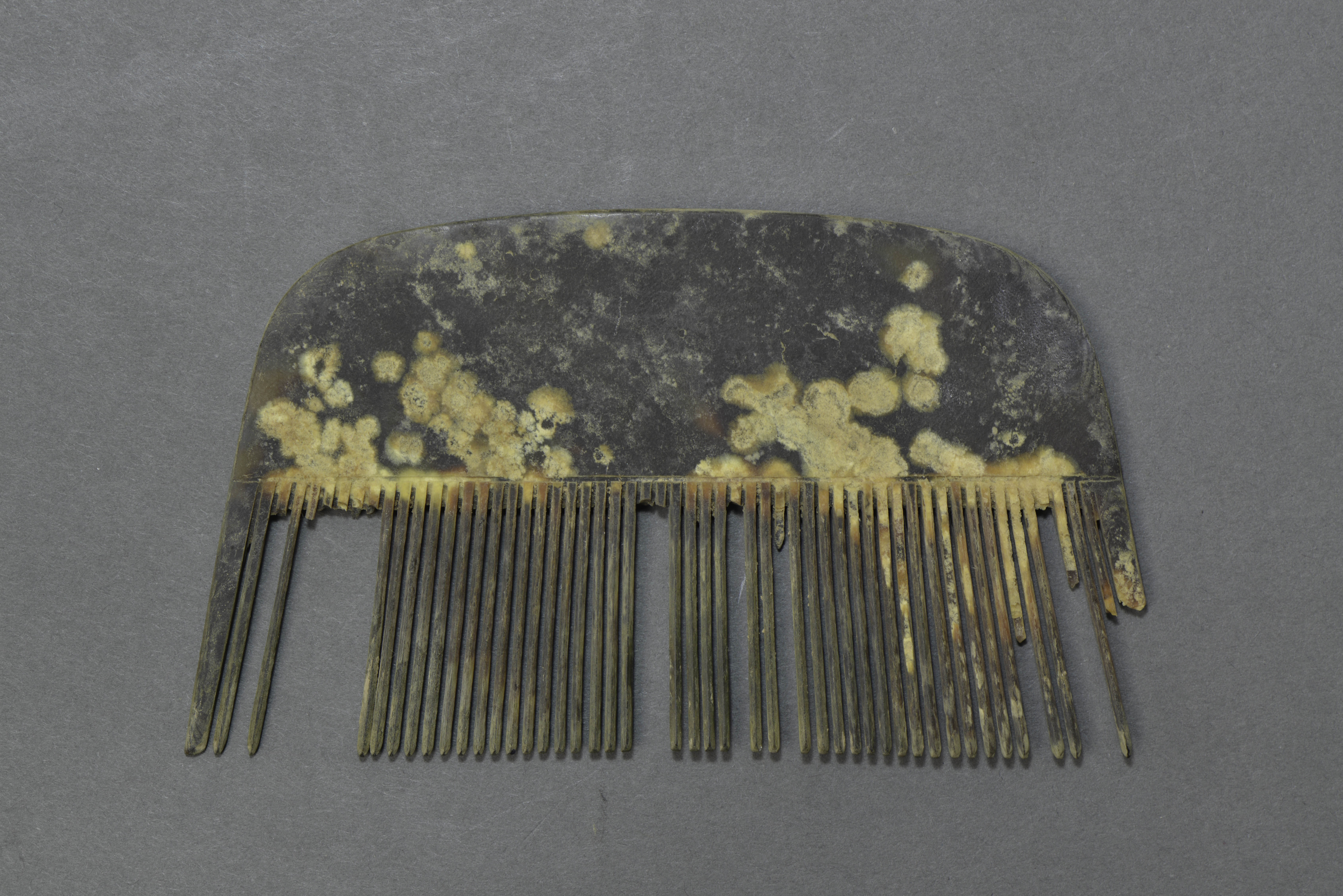 黑红色,犀角加工而成,梳背呈弧形,齿平齐。