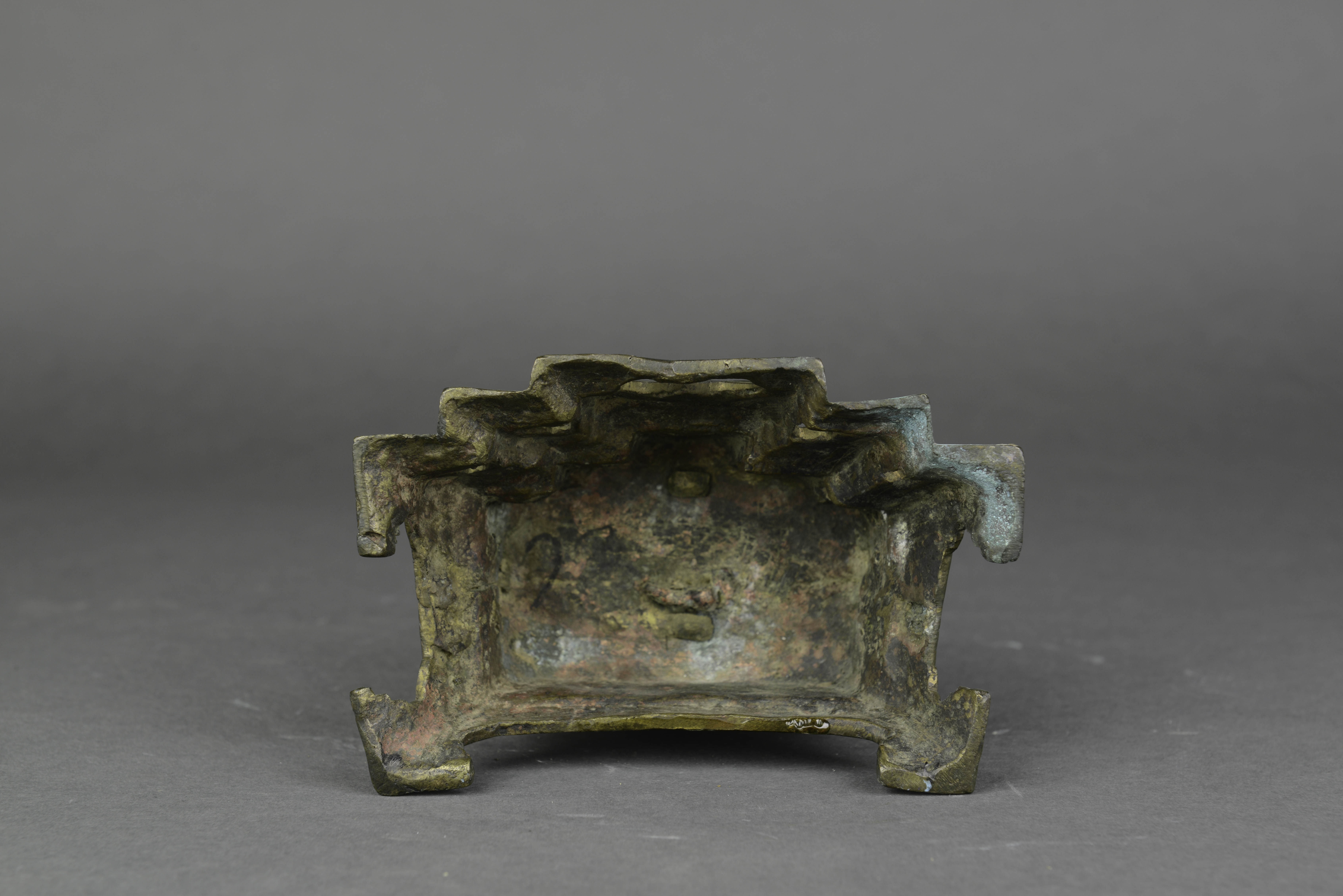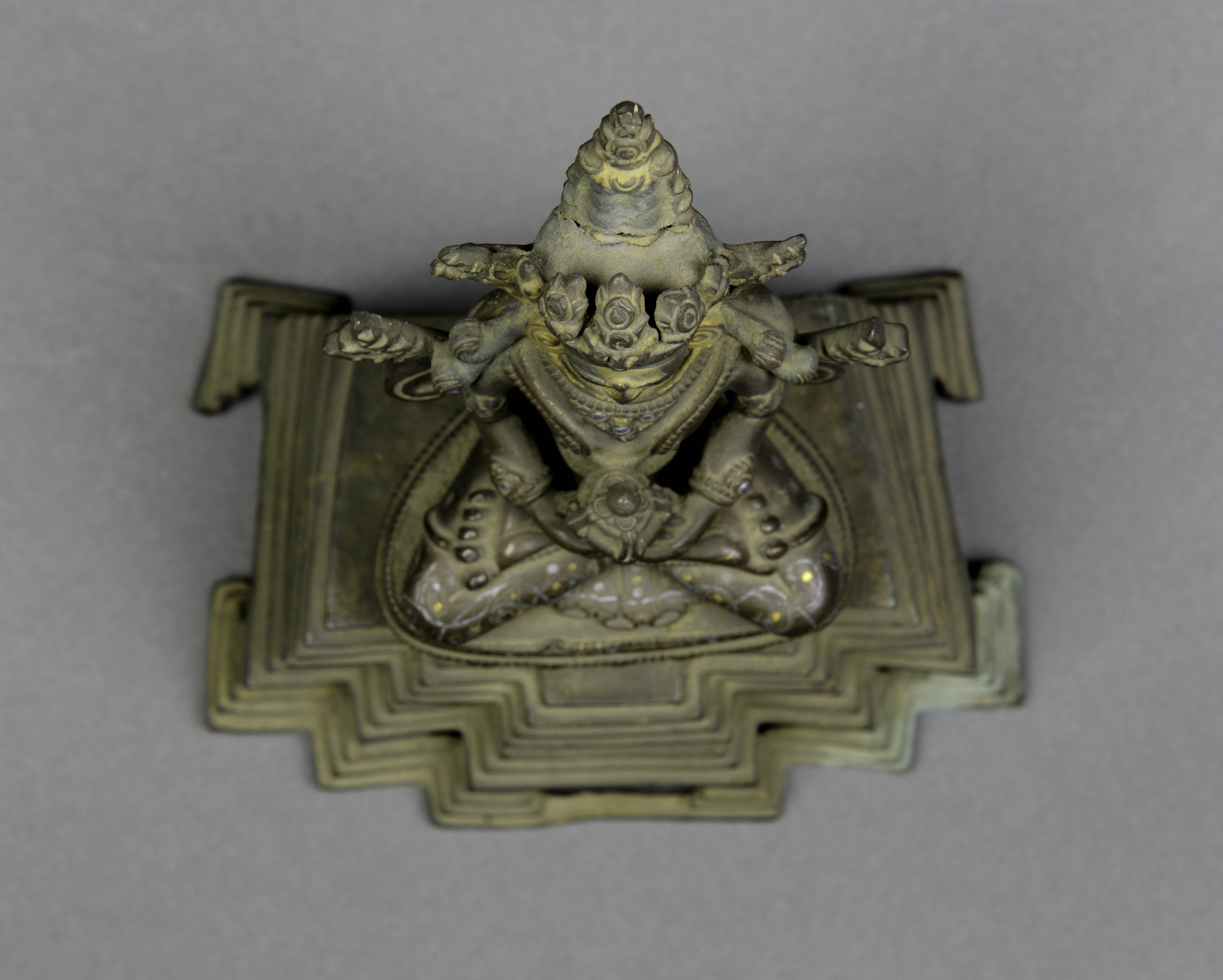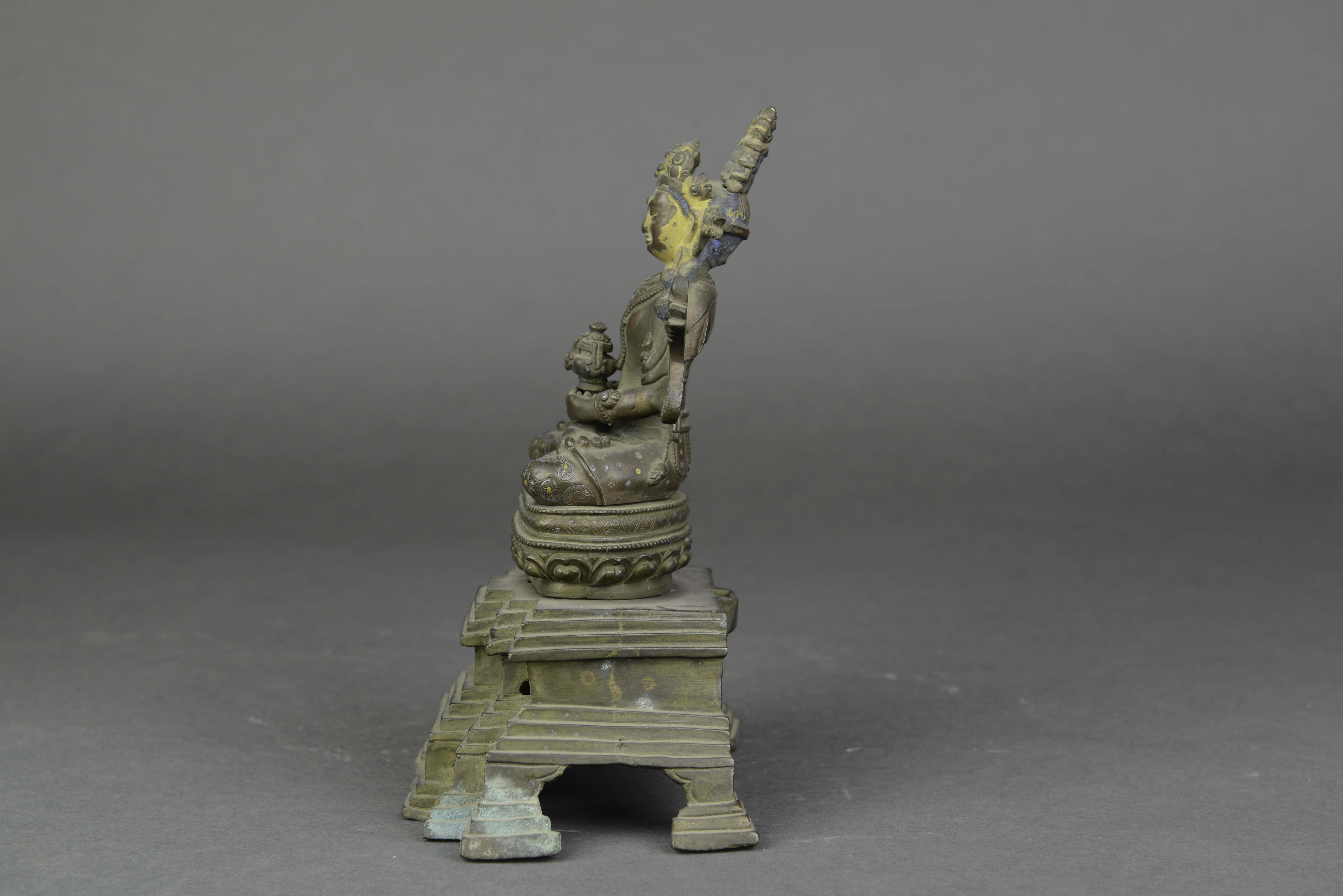 头戴莲花宝冠,冠两侧缯带上卷,两边卷发下垂至肩。面相方圆,眉毛高挑,眉间一白毫,两眼微睁,鼻梁挺直,双唇微合,庄重沉静。颈饰璎珞,面部、颈部鎏金。身着双领下垂式长裙,双肩披帛绕臂,裙上错金缠枝花卉纹,双手捧宝瓶置于腹前,结跏趺坐于半圆形仰莲座之上,下为三组十一层镂空塔座。