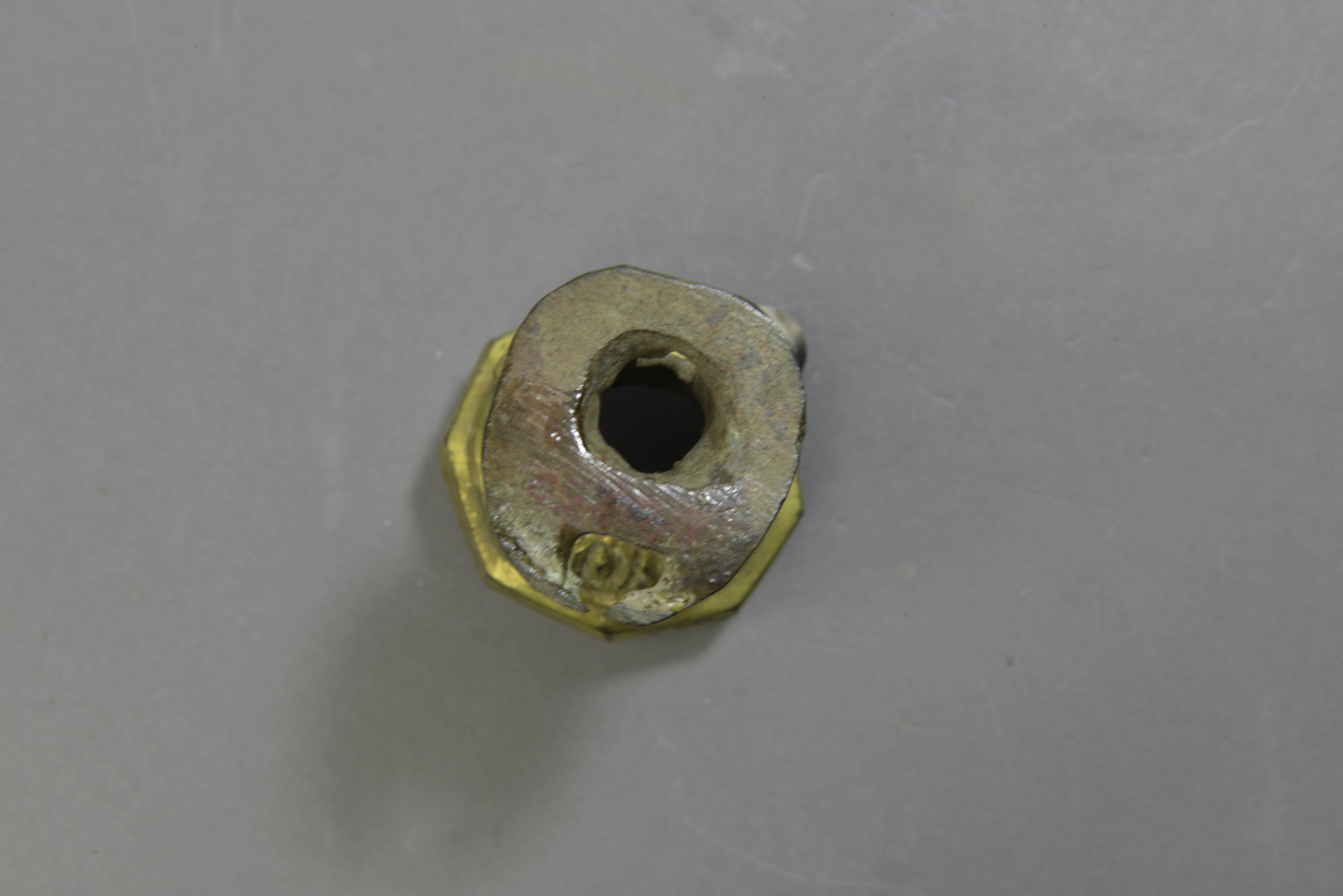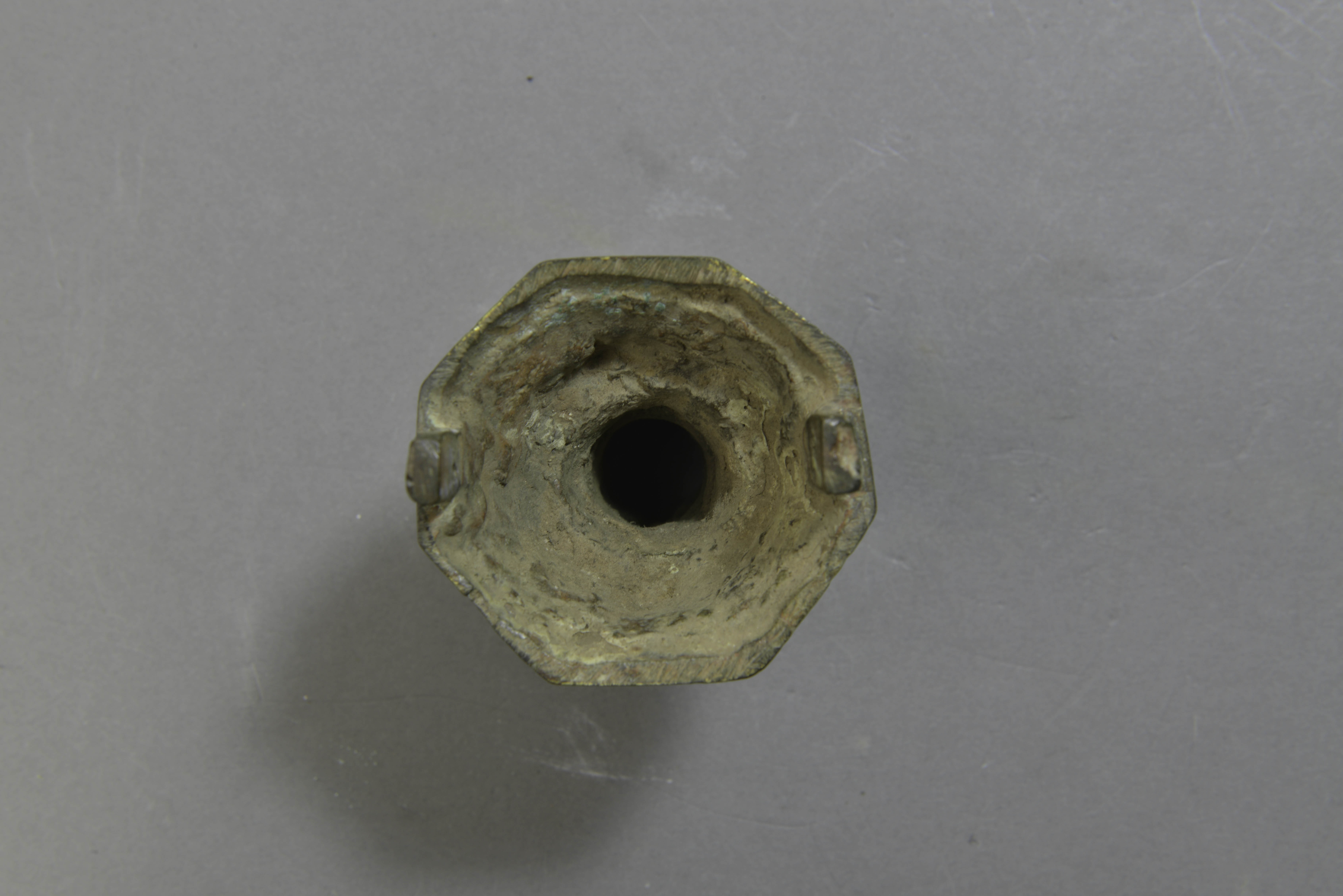 口沿上置对称条插,连接佛体。八边折沿,沿下依次饰八连弧,仰莲。八边形筒柱,椭圆形底座。沿口与底部相通。