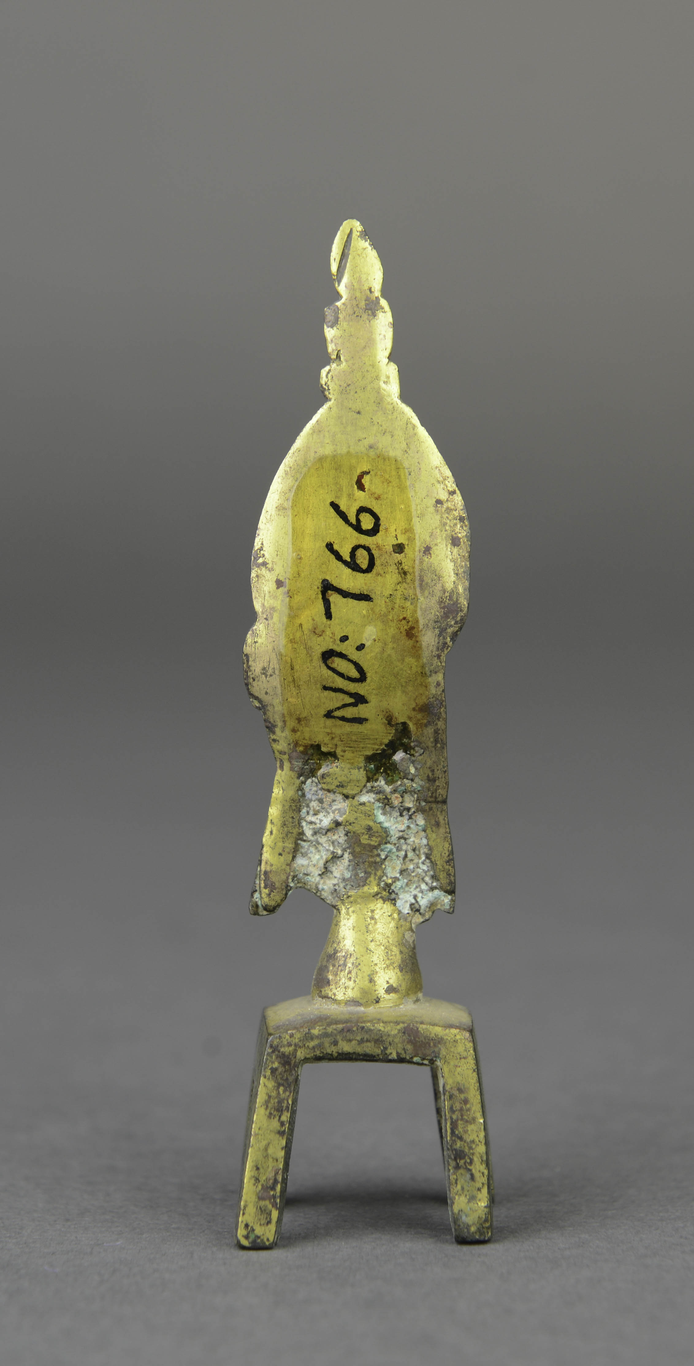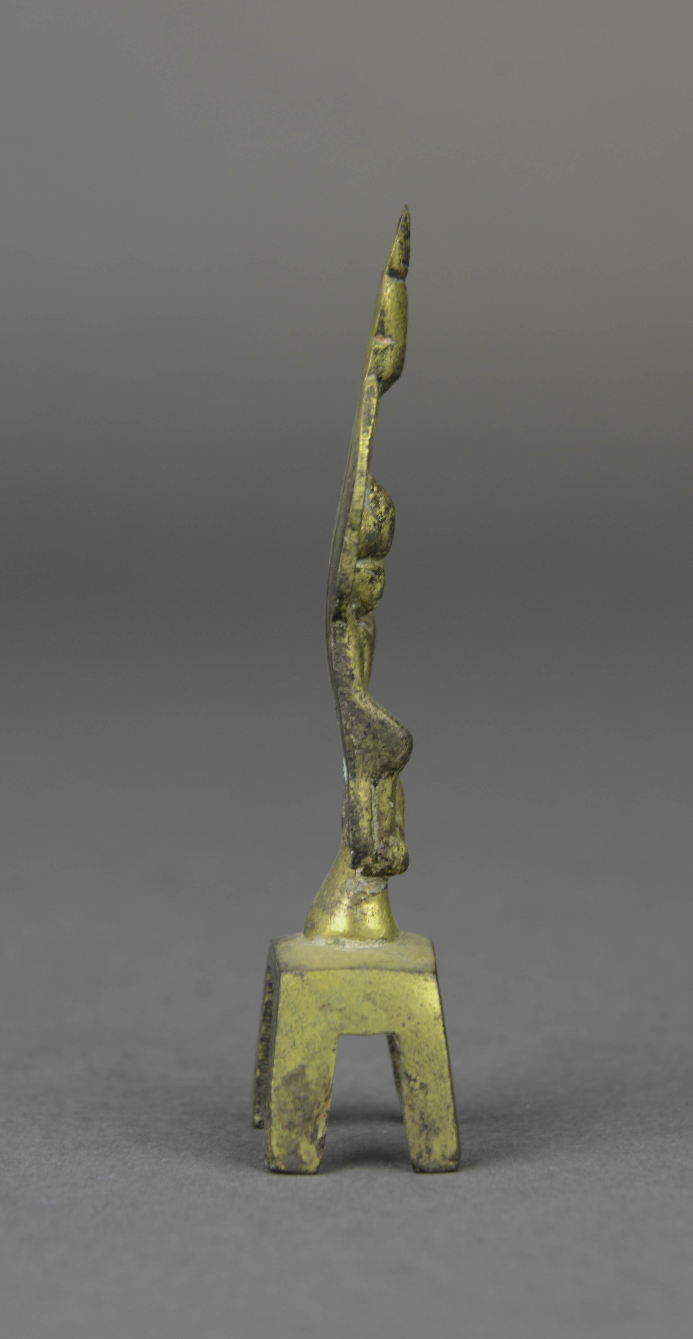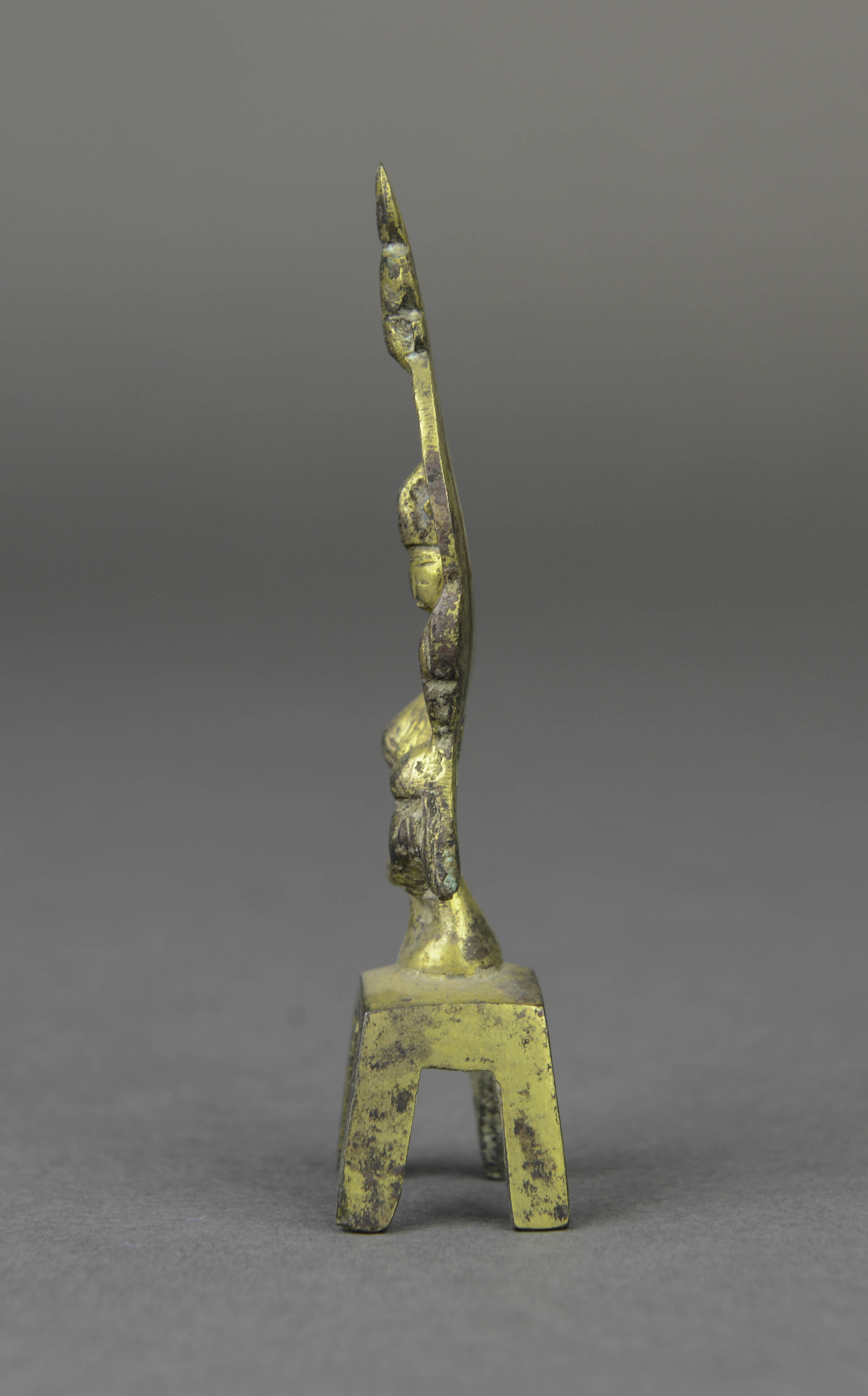 头戴宝冠,面相清秀,眉眼细长,颈饰项圈,上身袒露,下着长裙,右手扶膝,左手上举至肩,一腿自然垂下,一腿盘起坐于圆台之上,下接四足方床,莲瓣形头光上有一小坐佛,通体鎏金。