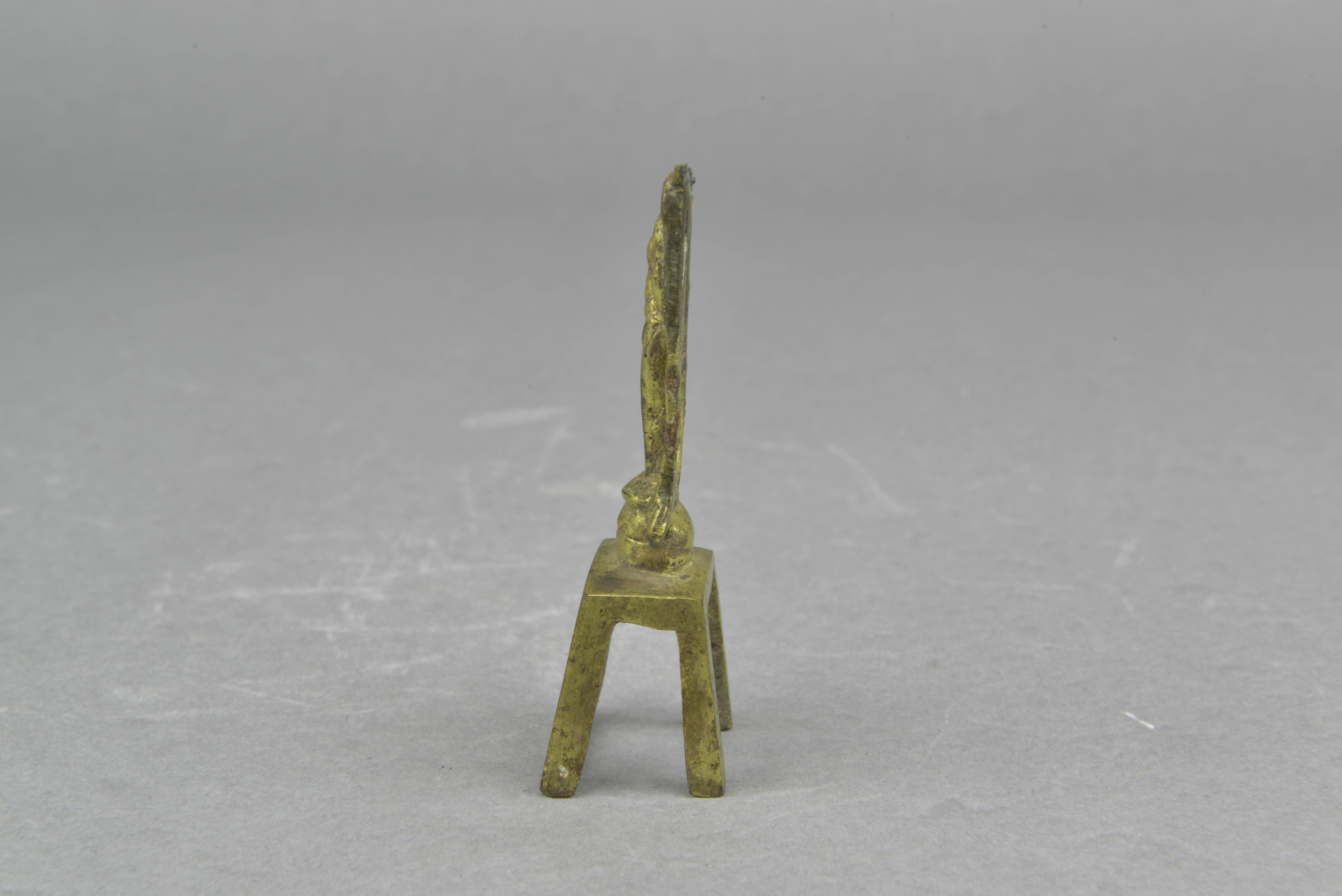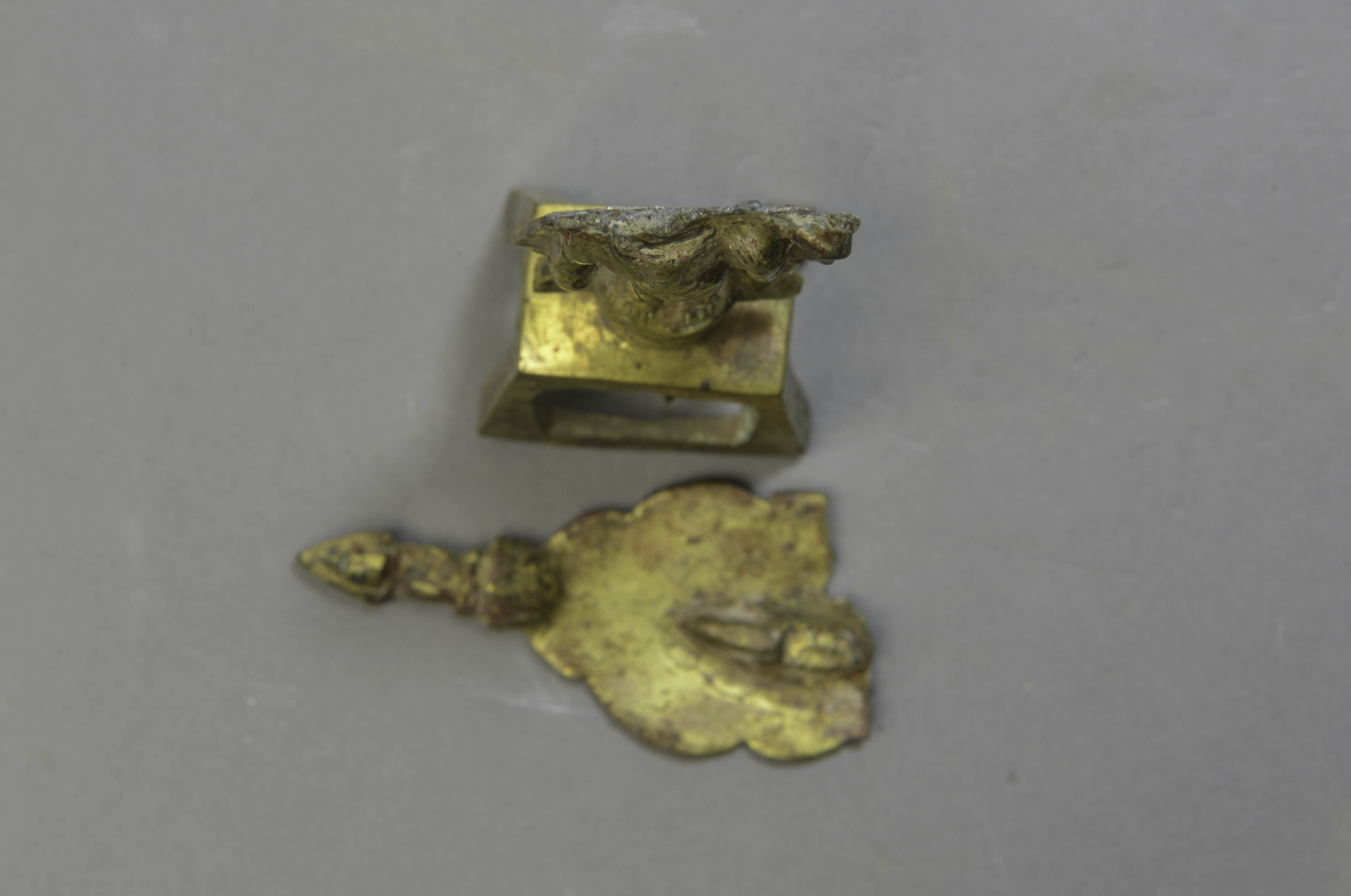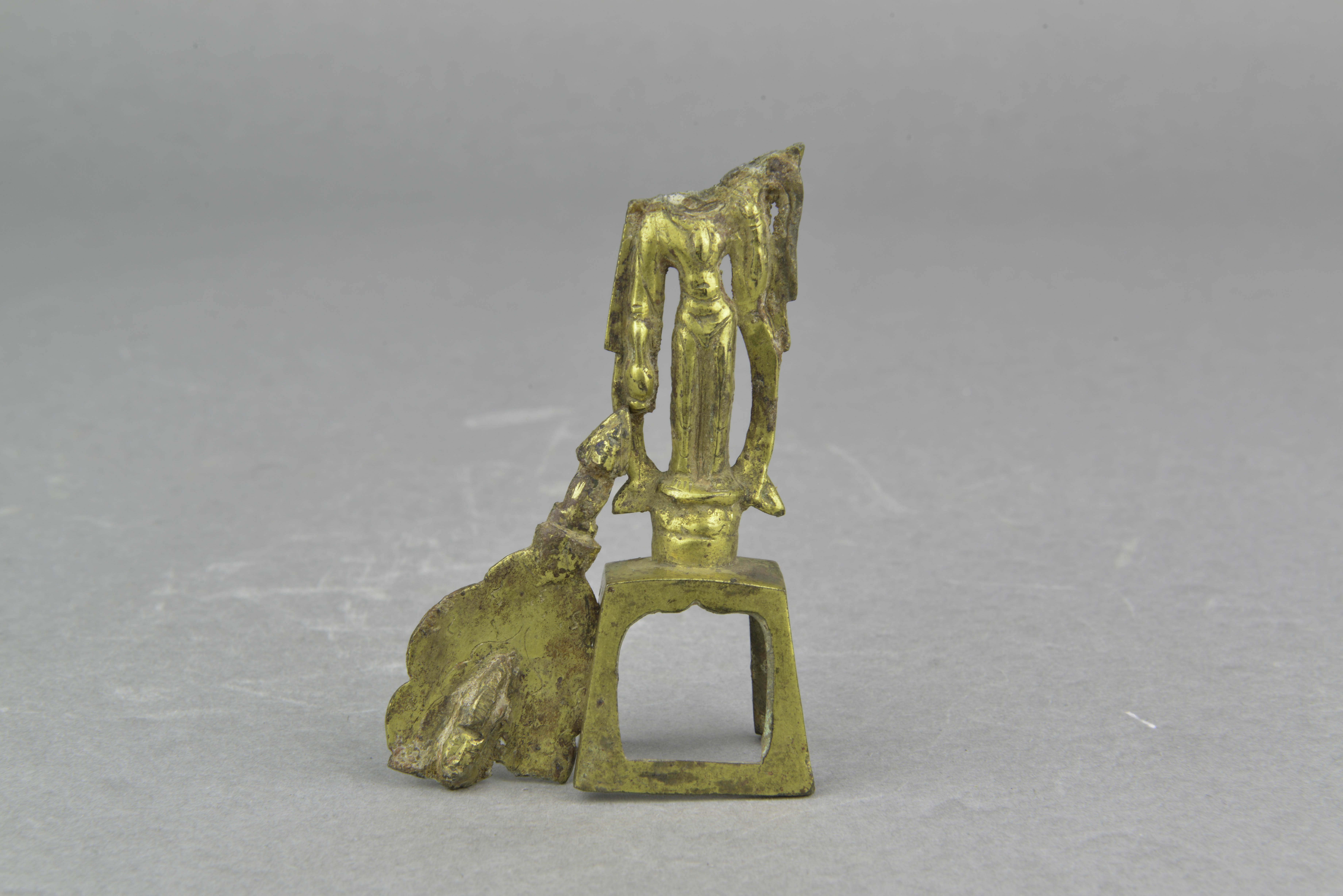 头戴宝冠,头后为莲瓣形头光,上饰火焰纹,顶部有一小坐佛,眉眼细长,鼻挺直,颈带项圈。袒上身,下着裙,腰身微扭,披帛绕臂垂下。左手自然下垂于膝,持净瓶,左手曲举至肩,跣足立于圆台之上,下接四足方床,通体鎏金。