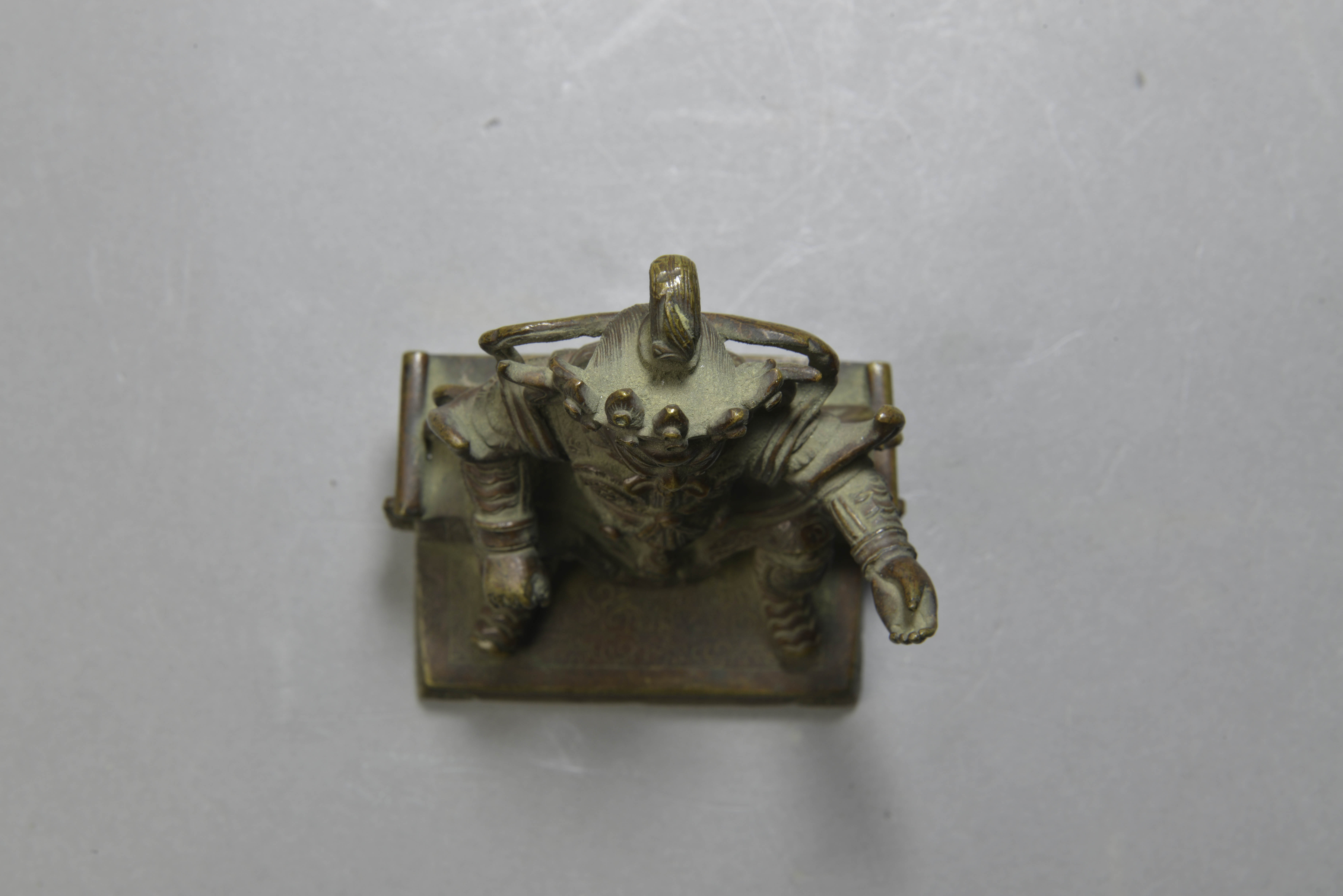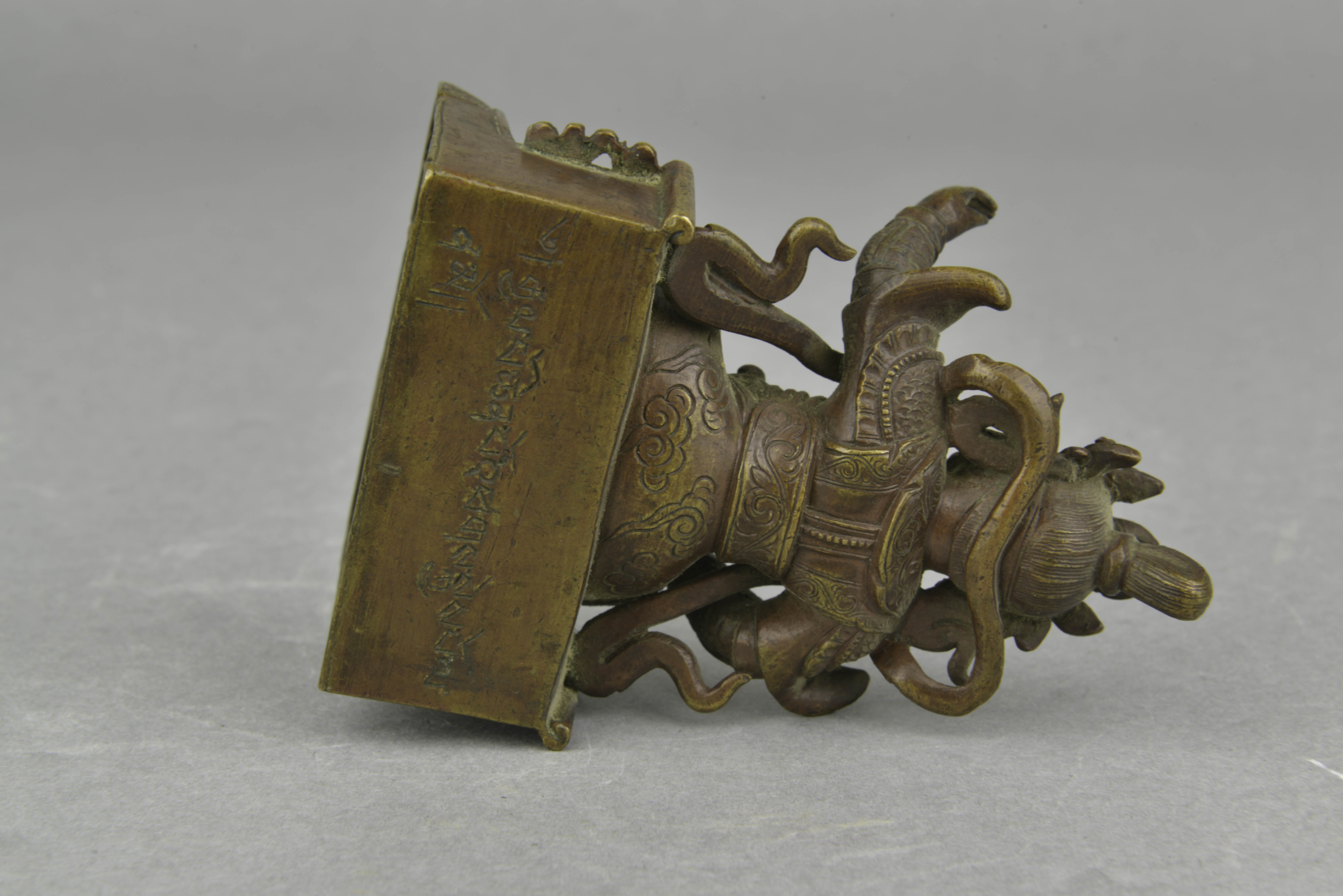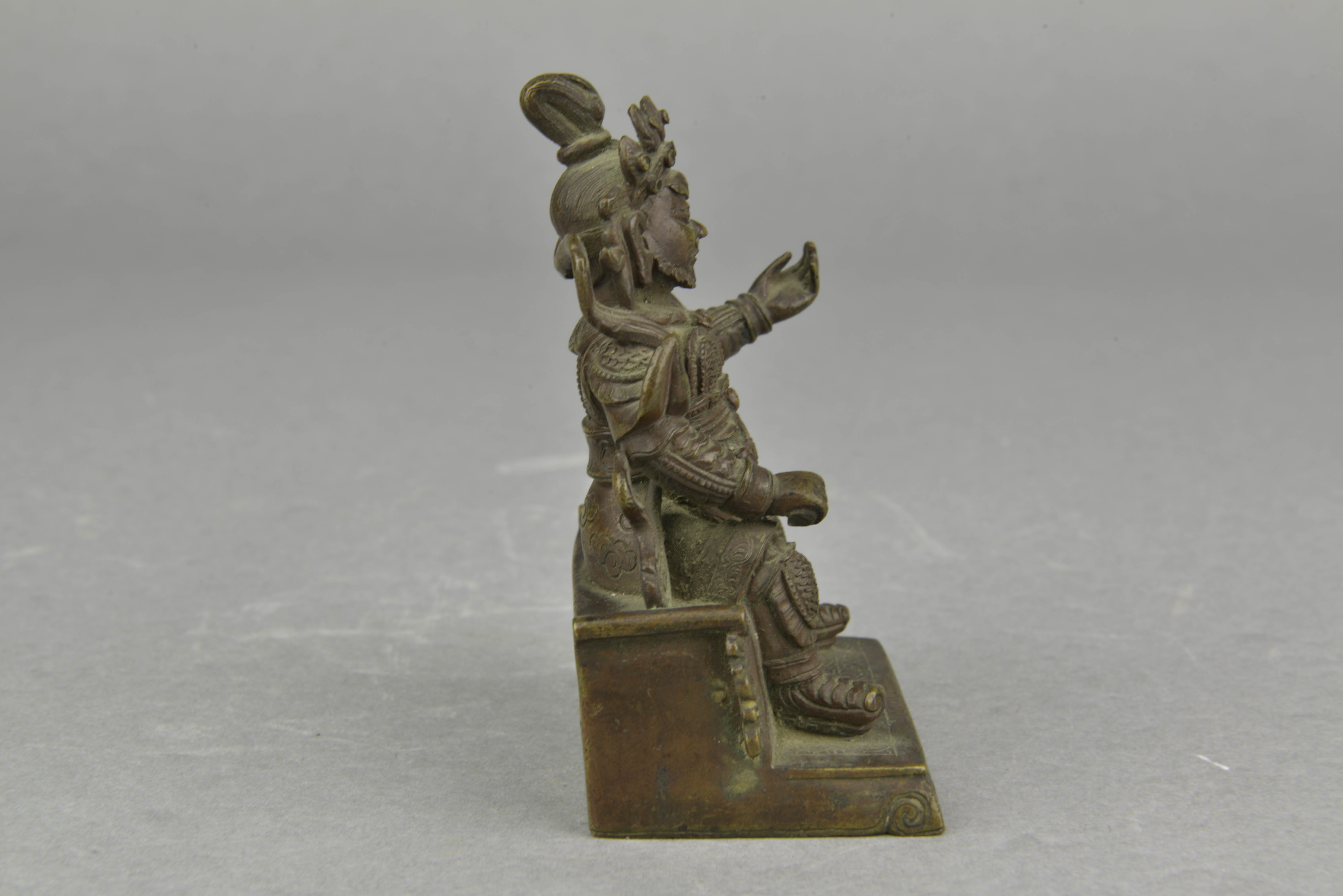 头戴六瓣连冠,高鬓,浓眉,双目圆睁,腮下虬髯卷曲,面部作怒状,视之可怖。僧带绕臂下扬,内穿圆领大衣,外着铠甲,披膊。在颈下居中部位纵束两条甲伴;腰束带,结系中一鱼垂于裆部,脚穿靴。左手向上抬举之肩部,手半握,右手上提之腰部,手握成拳,手中原似持有兵器已断,坐与长方形阶梯座上。