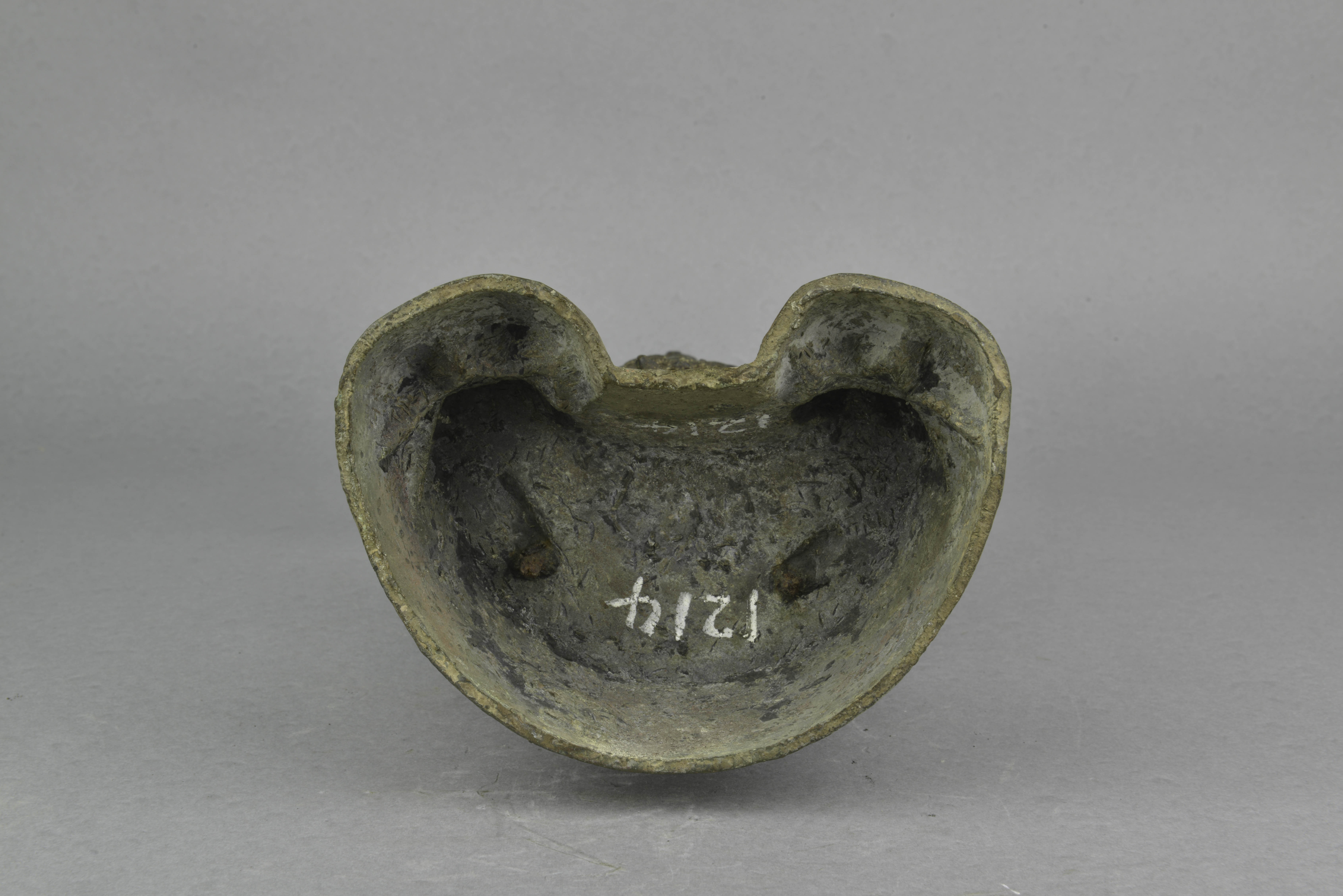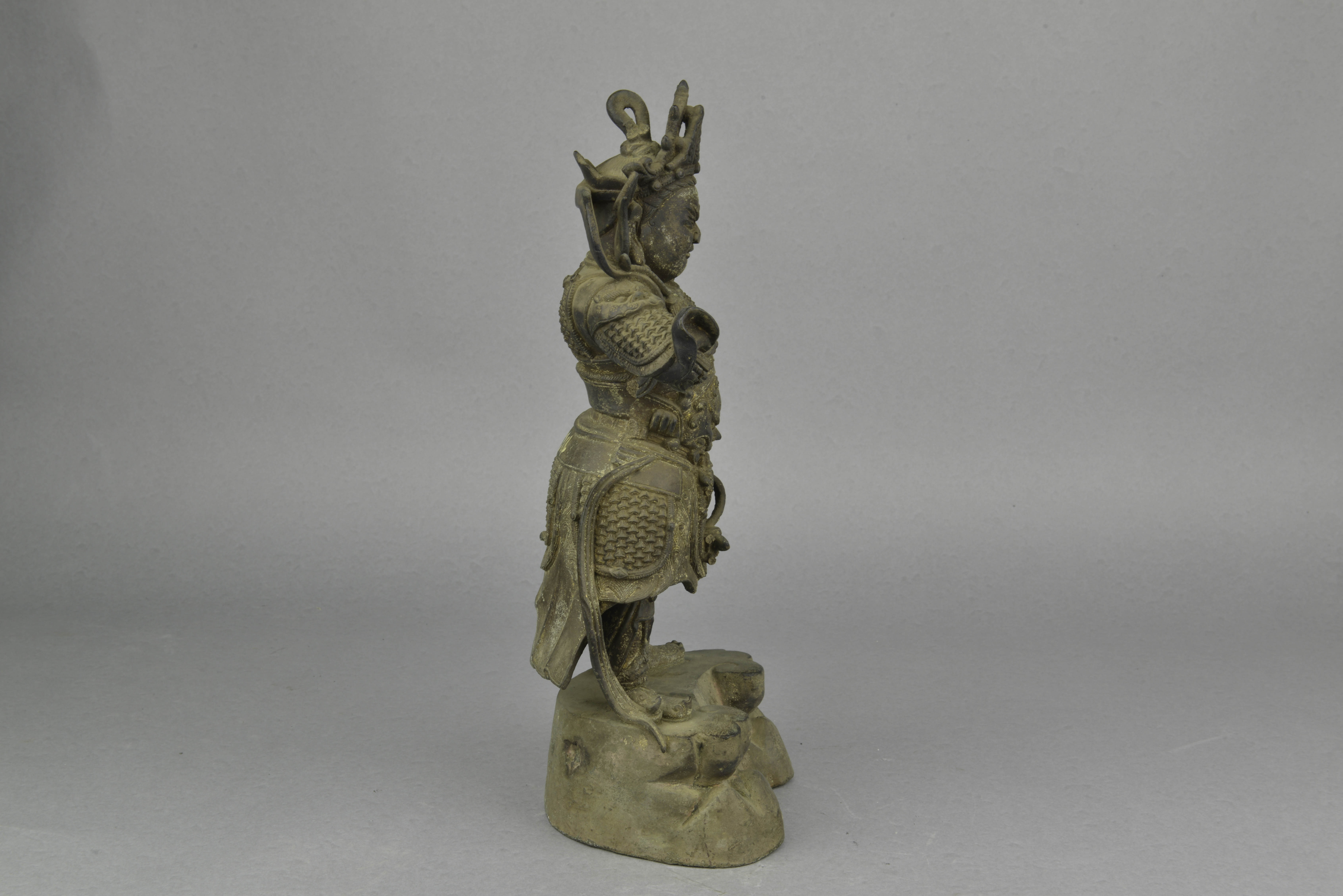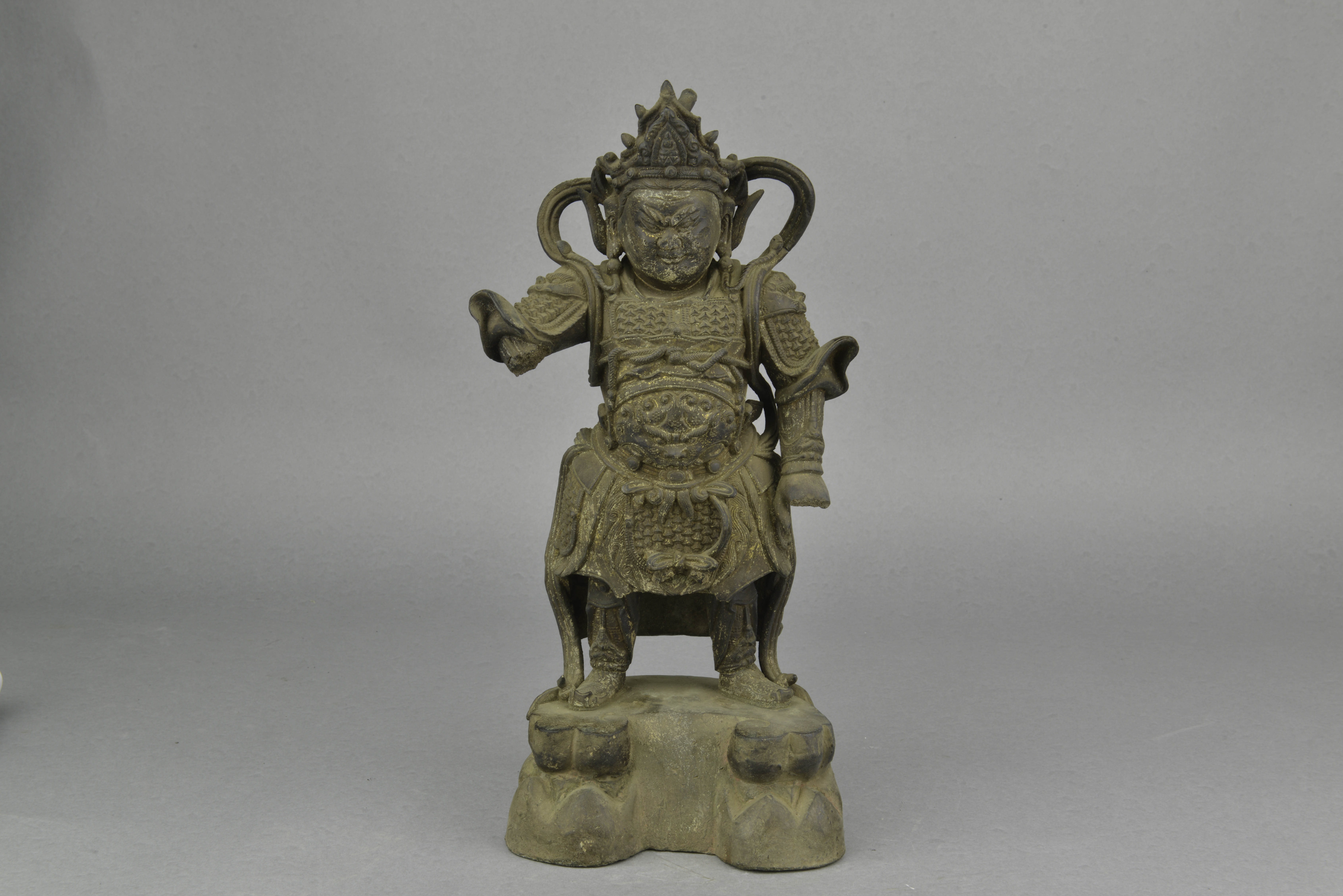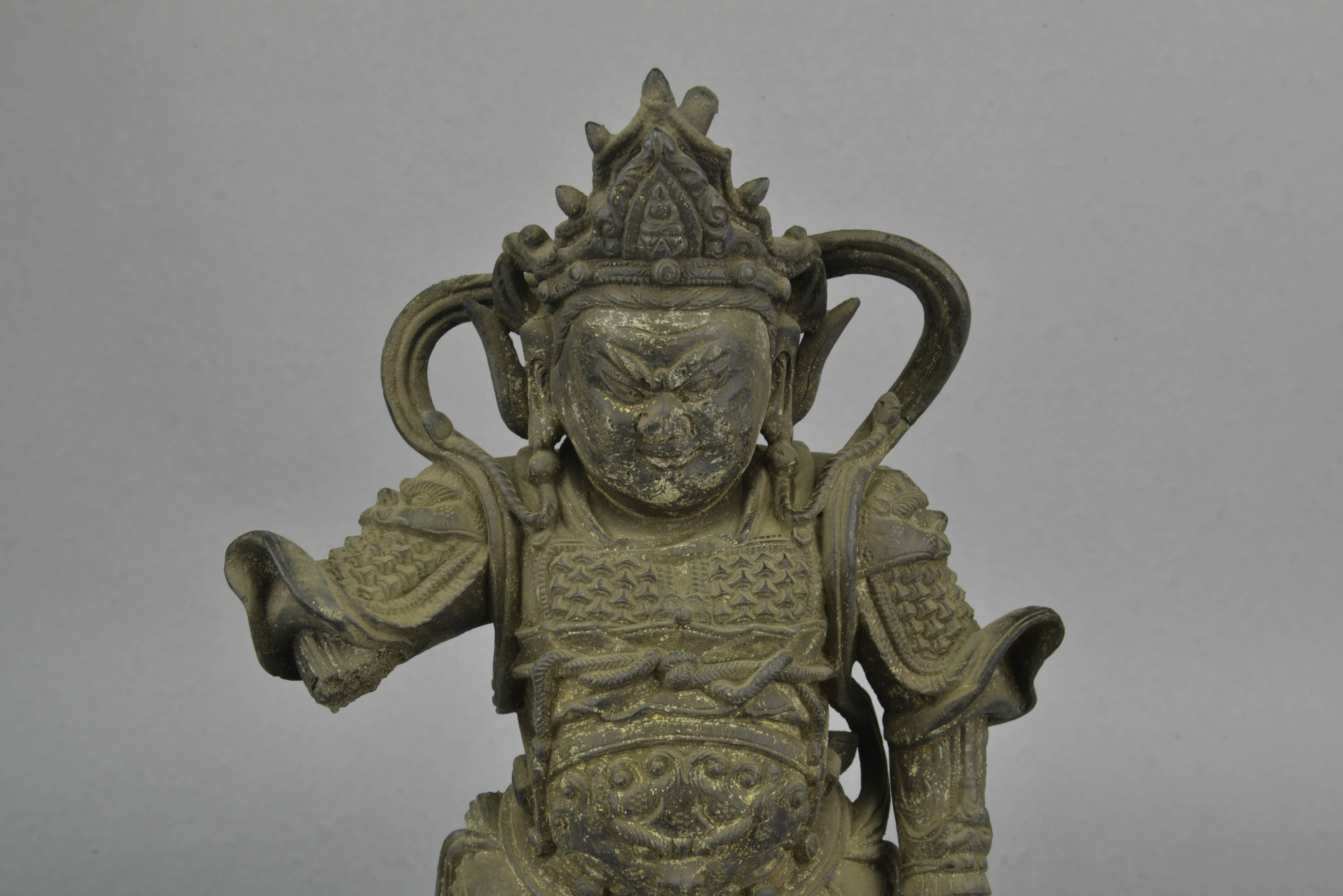 通高37.0cm;通宽16.7cm。头戴双层宝冠,缯带绕身自然下垂于半圆台。面相浑圆,粗眉怒目,宽鼻,双唇微张,双耳下垂于肩。身着铠甲,足登战靴,右臂残,左臂自然下垂,站立于双层半圆台之上。